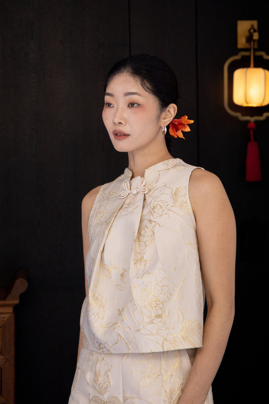 Floral Gold Sleeveless Cheongsam Top (Beige)