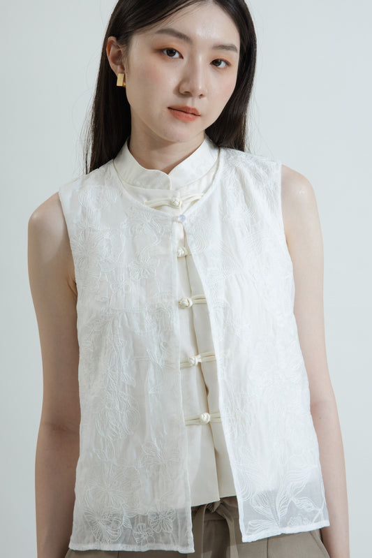 Sheer Layered Embroidery Cheongsam Top (Beige)