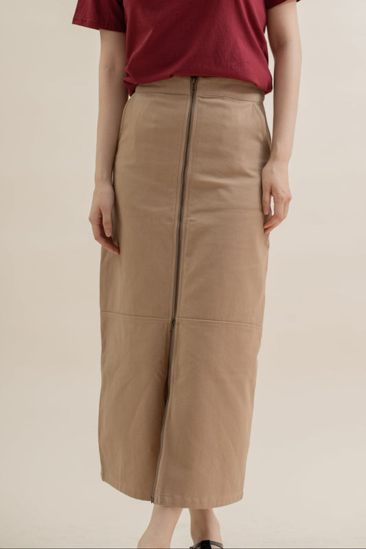 Front Zipper Cut & Sew Long Skirt (Khaki)