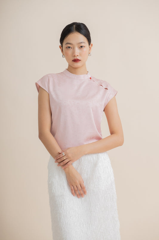 Elevate your look with this Damask Silky Cheongsam Top, available in soft beige and blush...