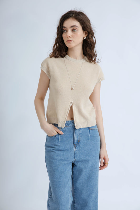 Asymmetric Single Button Sleeveless Vest (Sand)