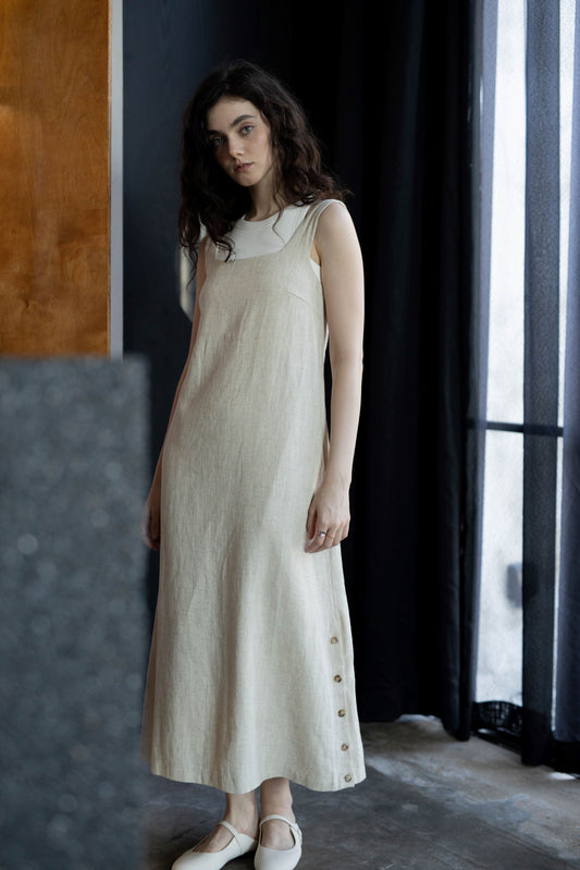 Linen Square Neck Sleeveless Maxi Dress (Beige)