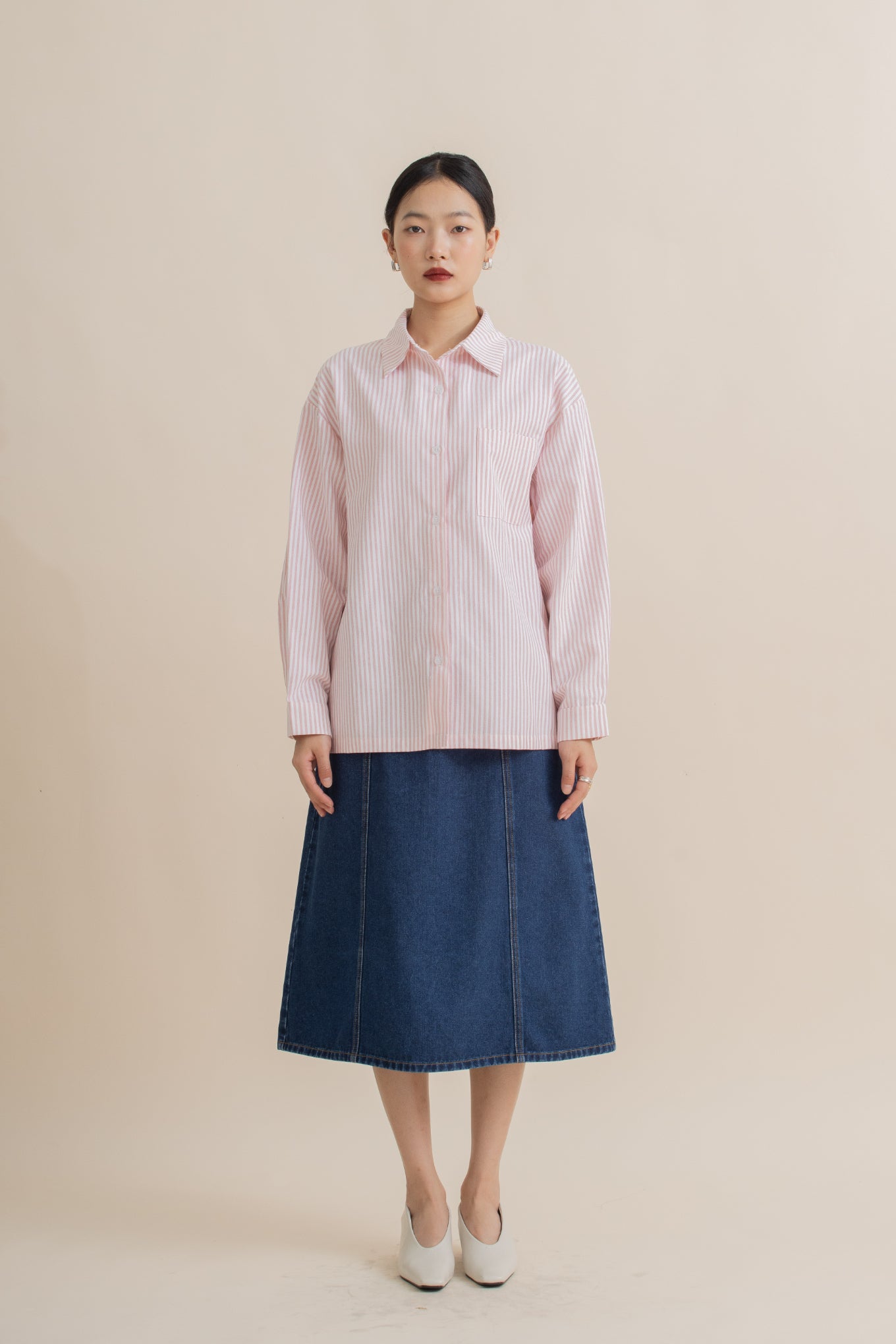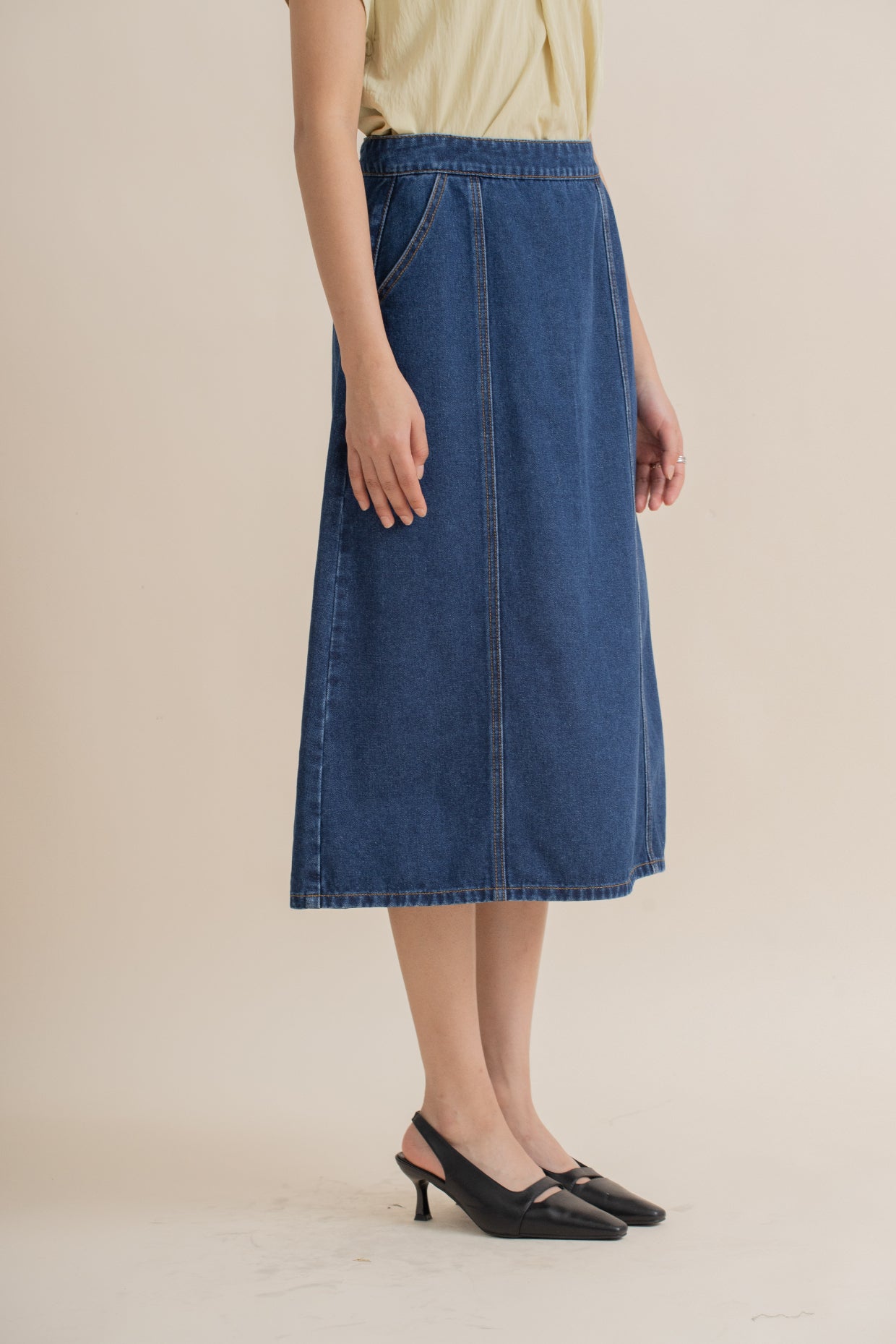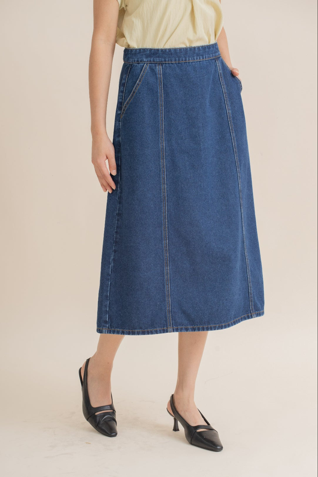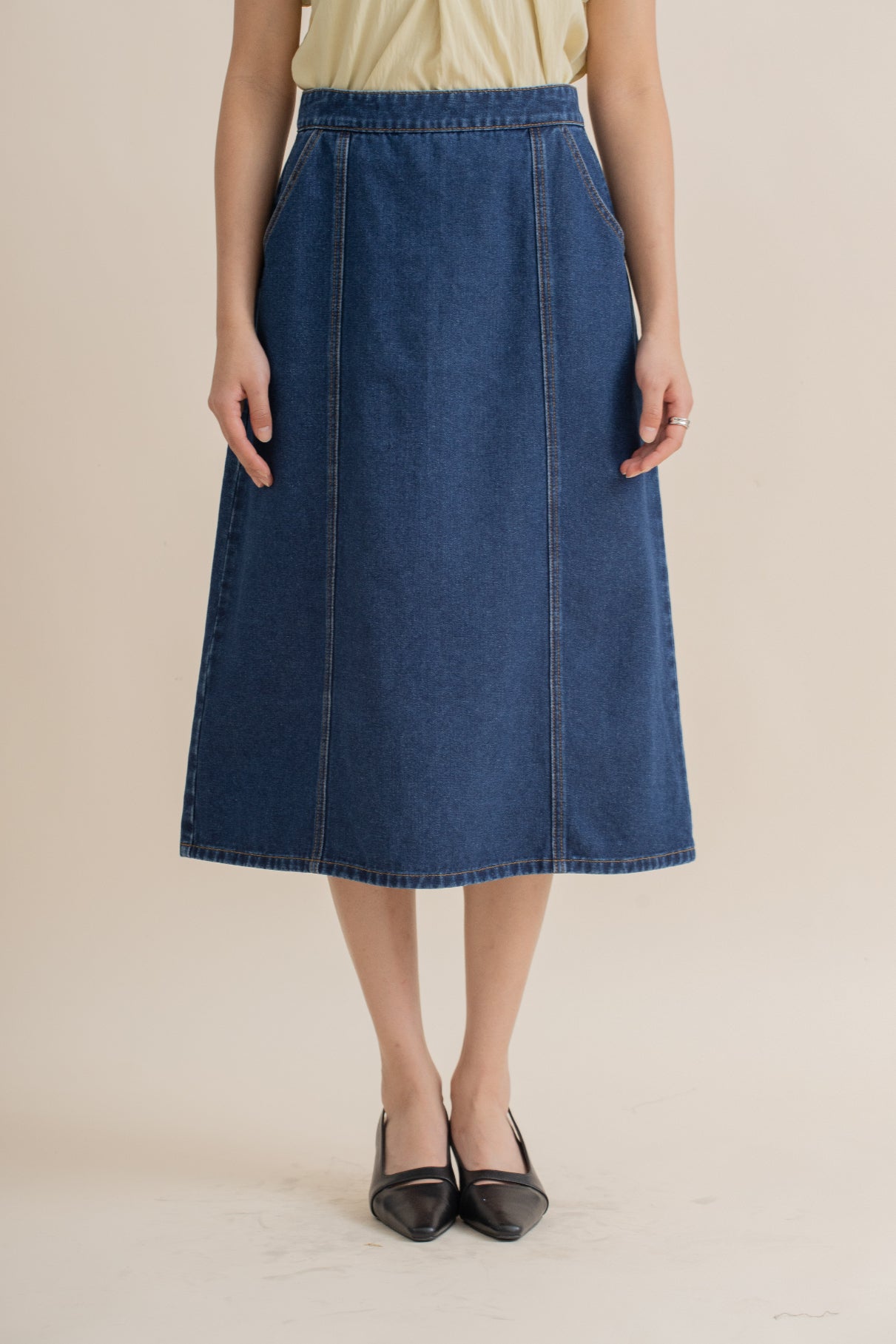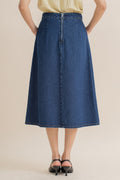 Timeless and flattering, this A-line paneled midi skirt is crafted from 100% cotton denim for a structured yet comfortable feel. Its paneled design creates a smooth, balanced silhouette that moves effortlessly with you. A functional back zipper ensures easy wear, while the side pockets add everyday practicality without compromising style. Perfect for pairing with tees, blouses, or knits, this midi skirt brings effortless versatility to your wardrobe.