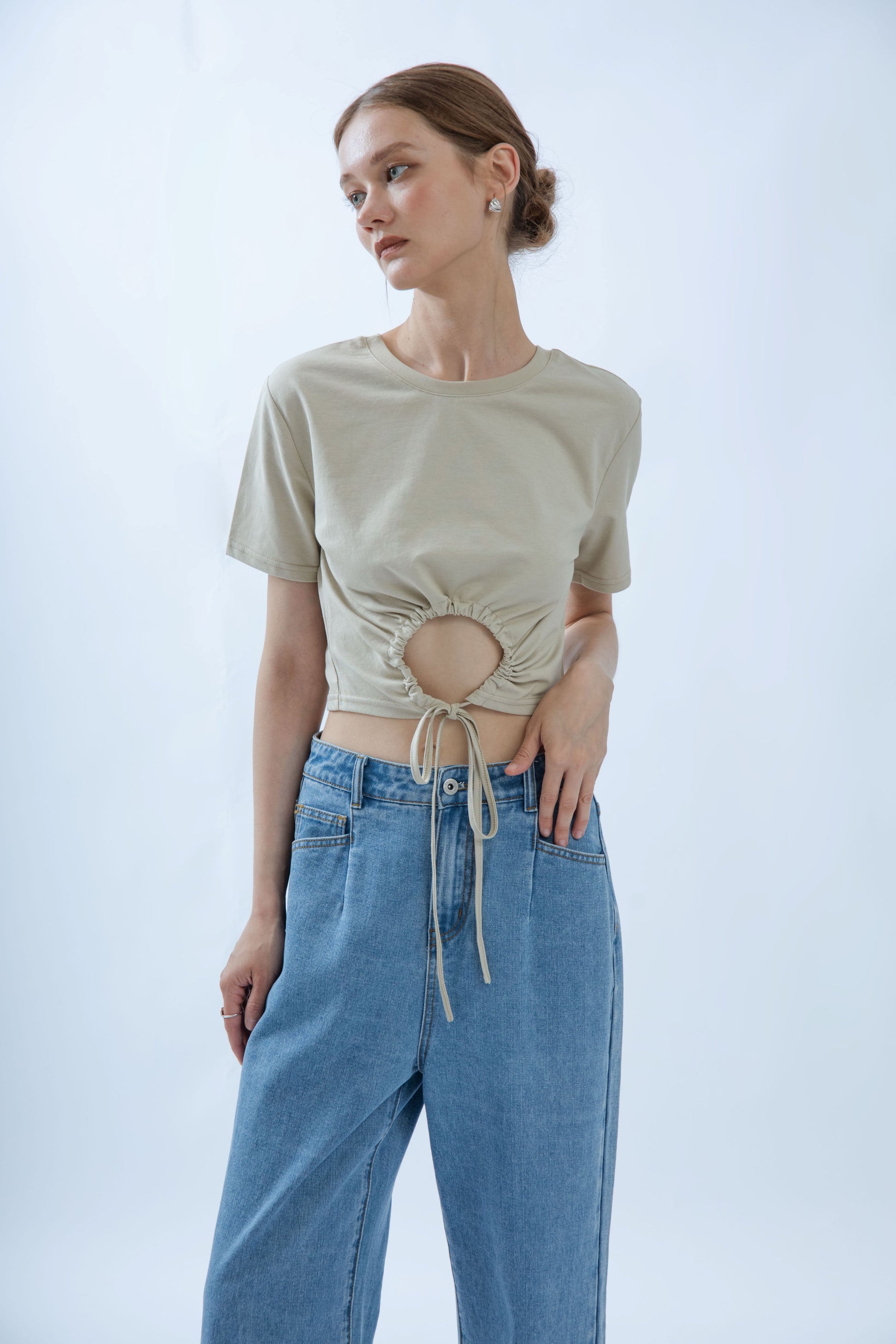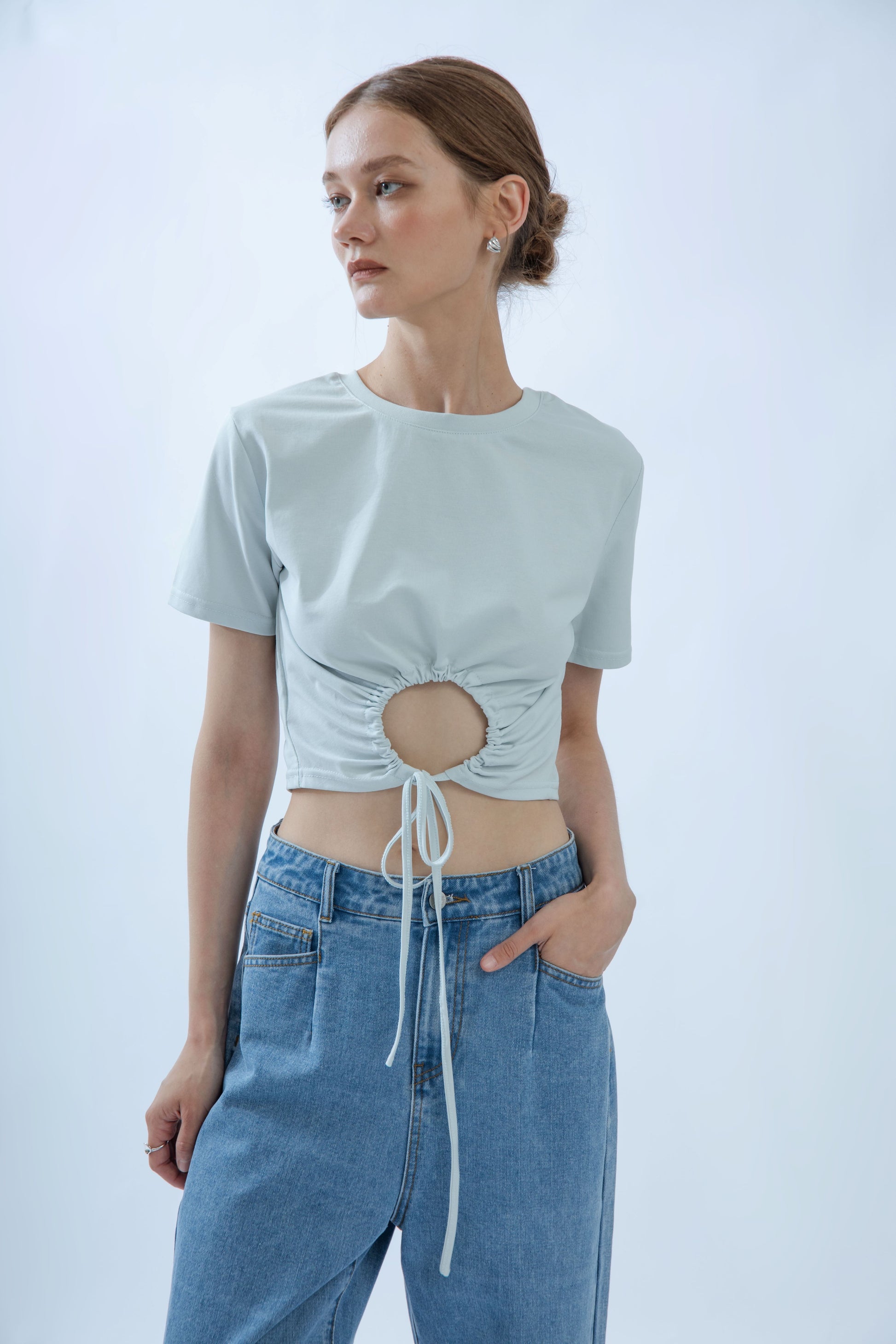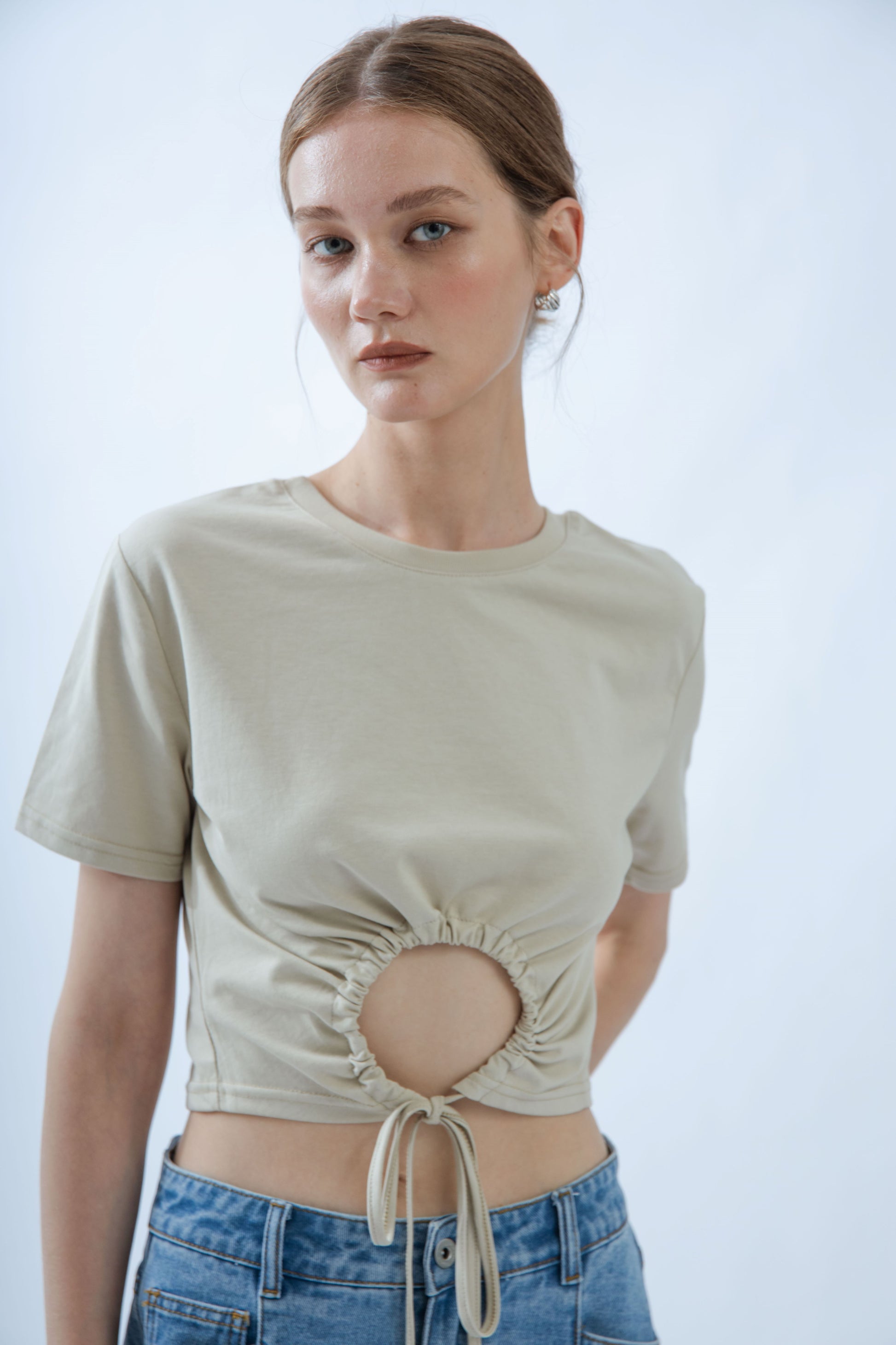 Relaxed fit with a playful finish. This short sleeve tee features a clean, minimal design elevated by a ruched drawstring detail at the hem—allowing you to cinch and shape the fit to your liking. Crafted from a breathable cotton-polyester blend, it combines everyday comfort with a subtle twist. Available in three easy-to-style shades: ivory, soft blue, and khaki.