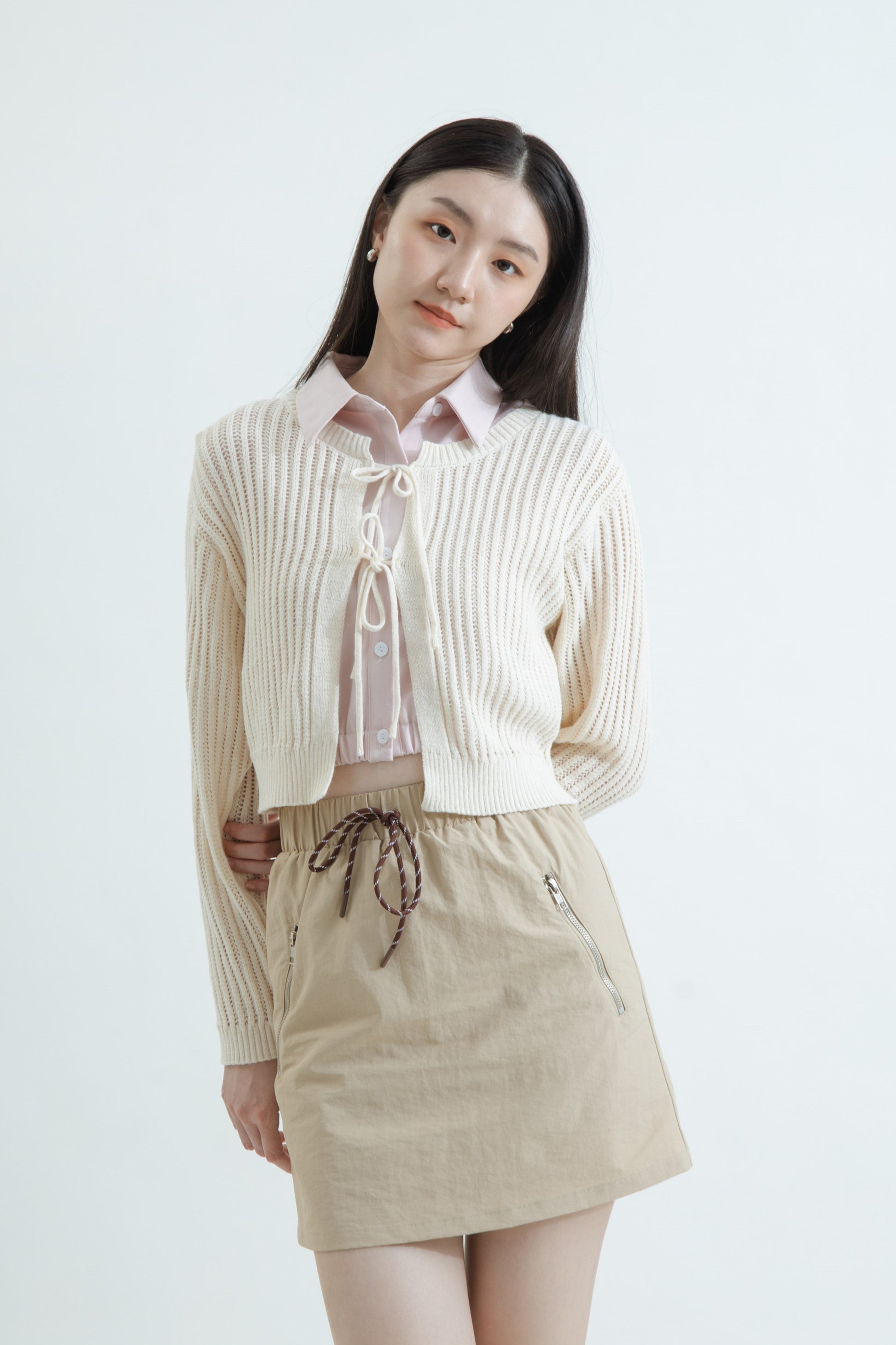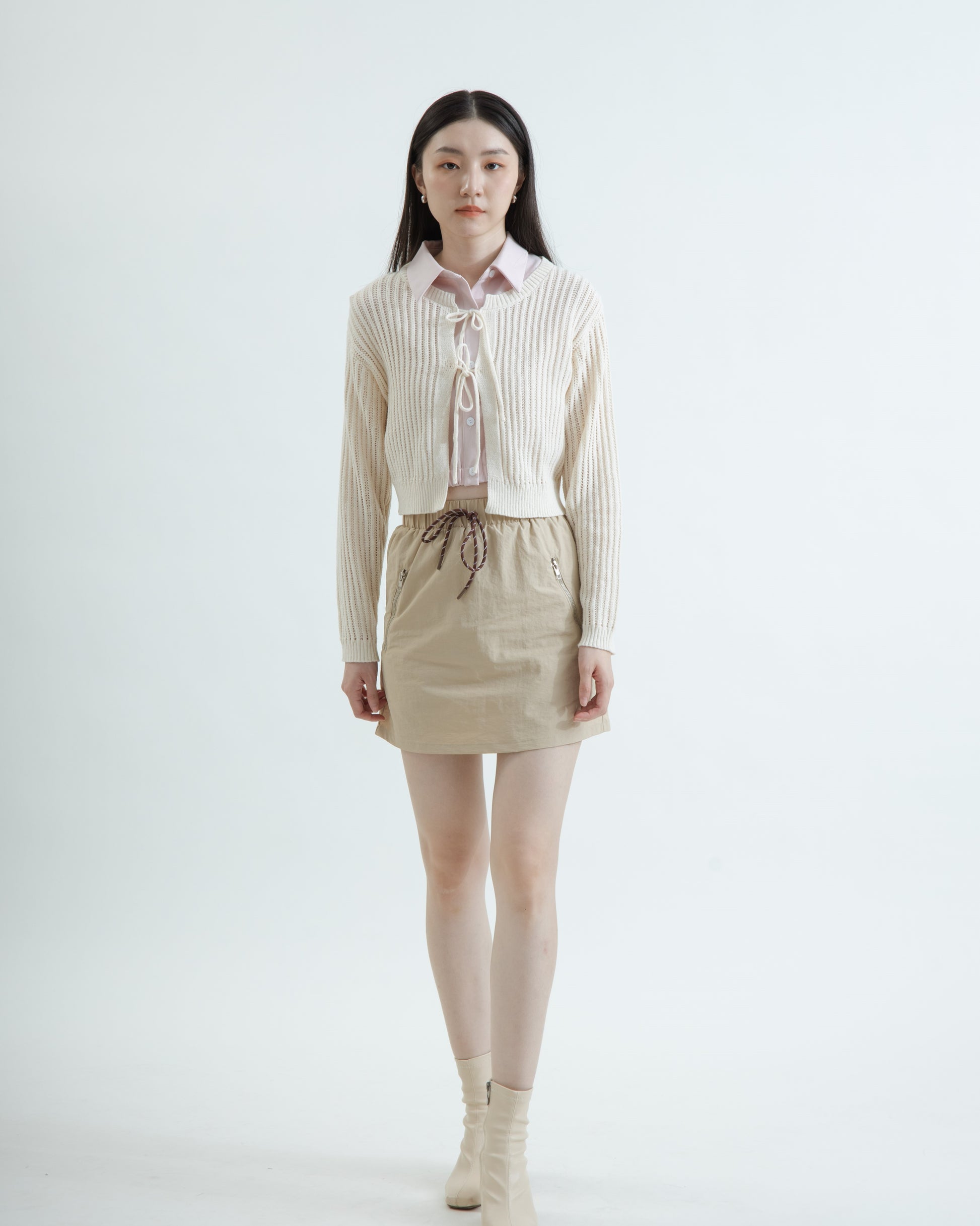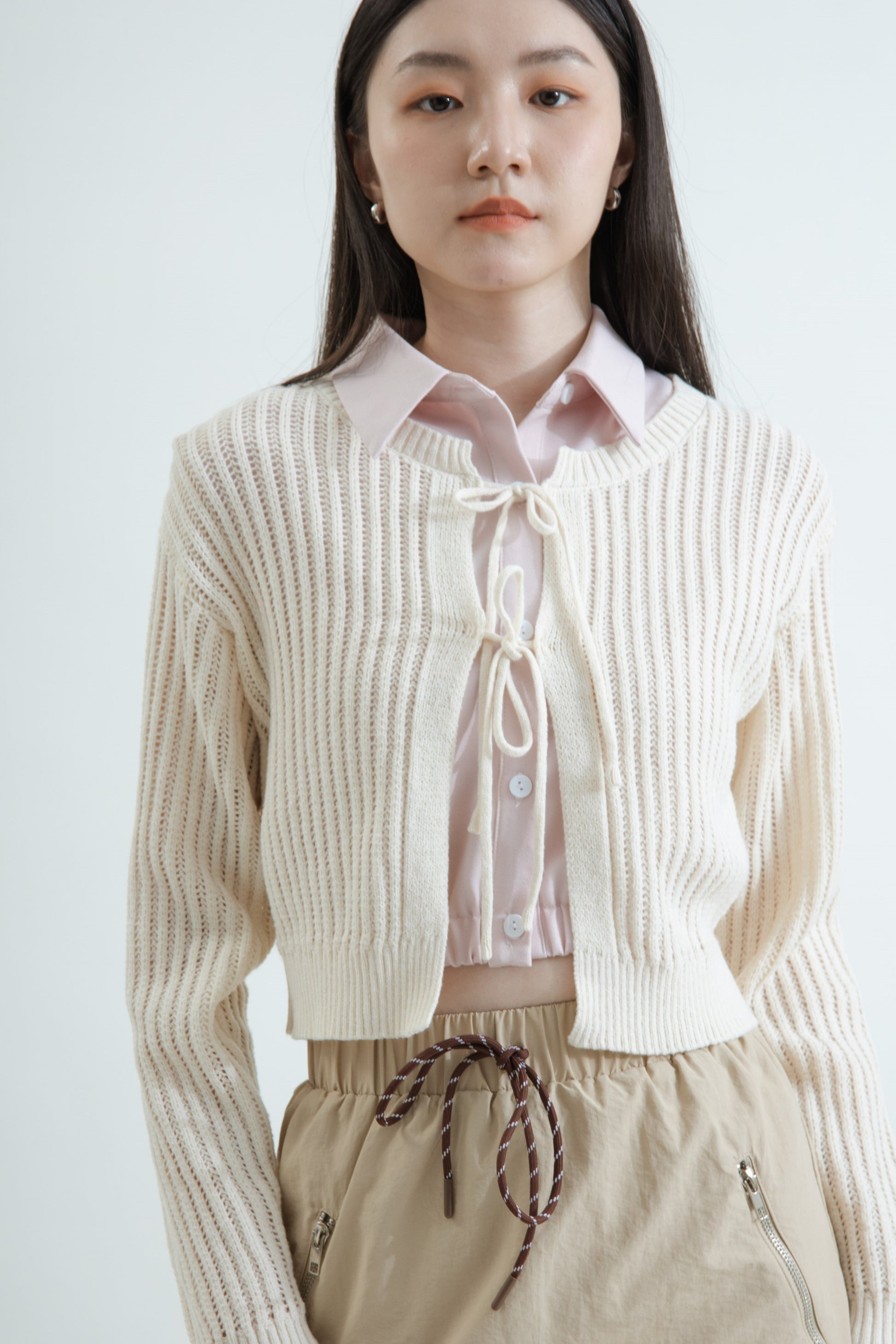 Eco Hollow Front-Tie Knit Cardigan (Beige)
