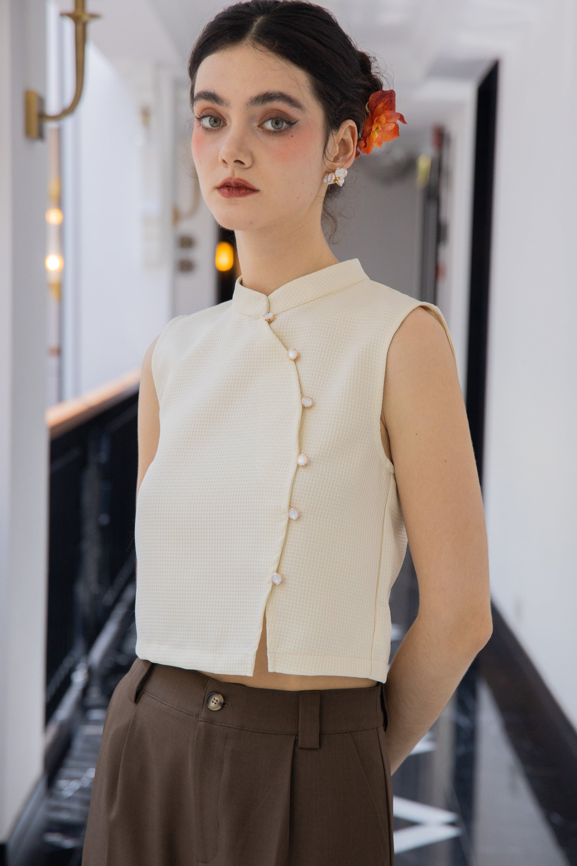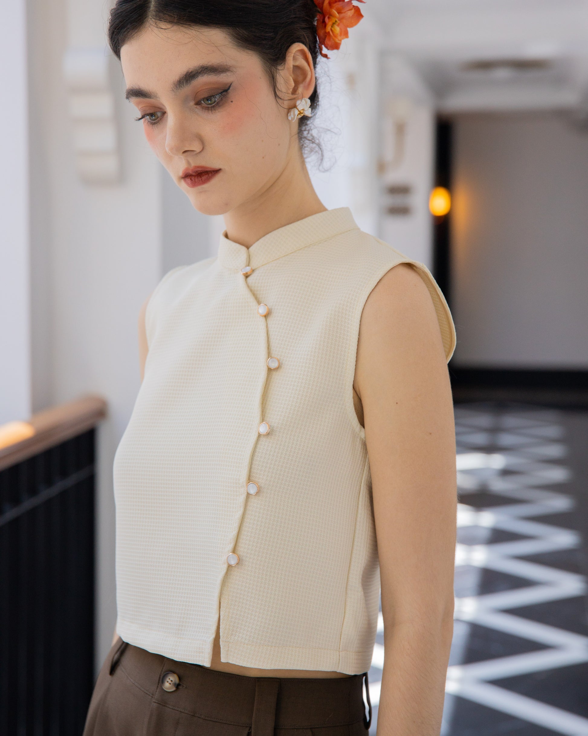 Elysse Mandarin Collar Side Buttons Cheongsam Top, made from 100% polyester, features a textured plaid fabric that adds depth and dimension to the design. With white jade buttons and a mandarin collar, this sleeveless top exudes a minimalist and versatile charm, perfect for creating elegant yet casual looks.