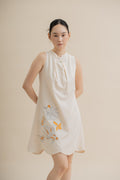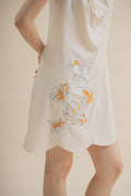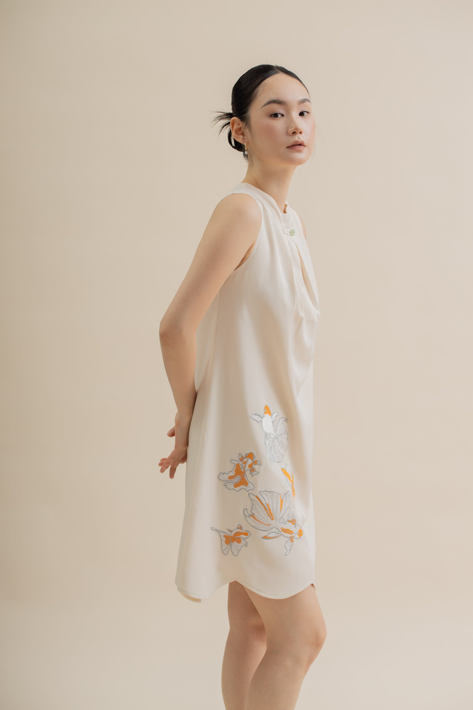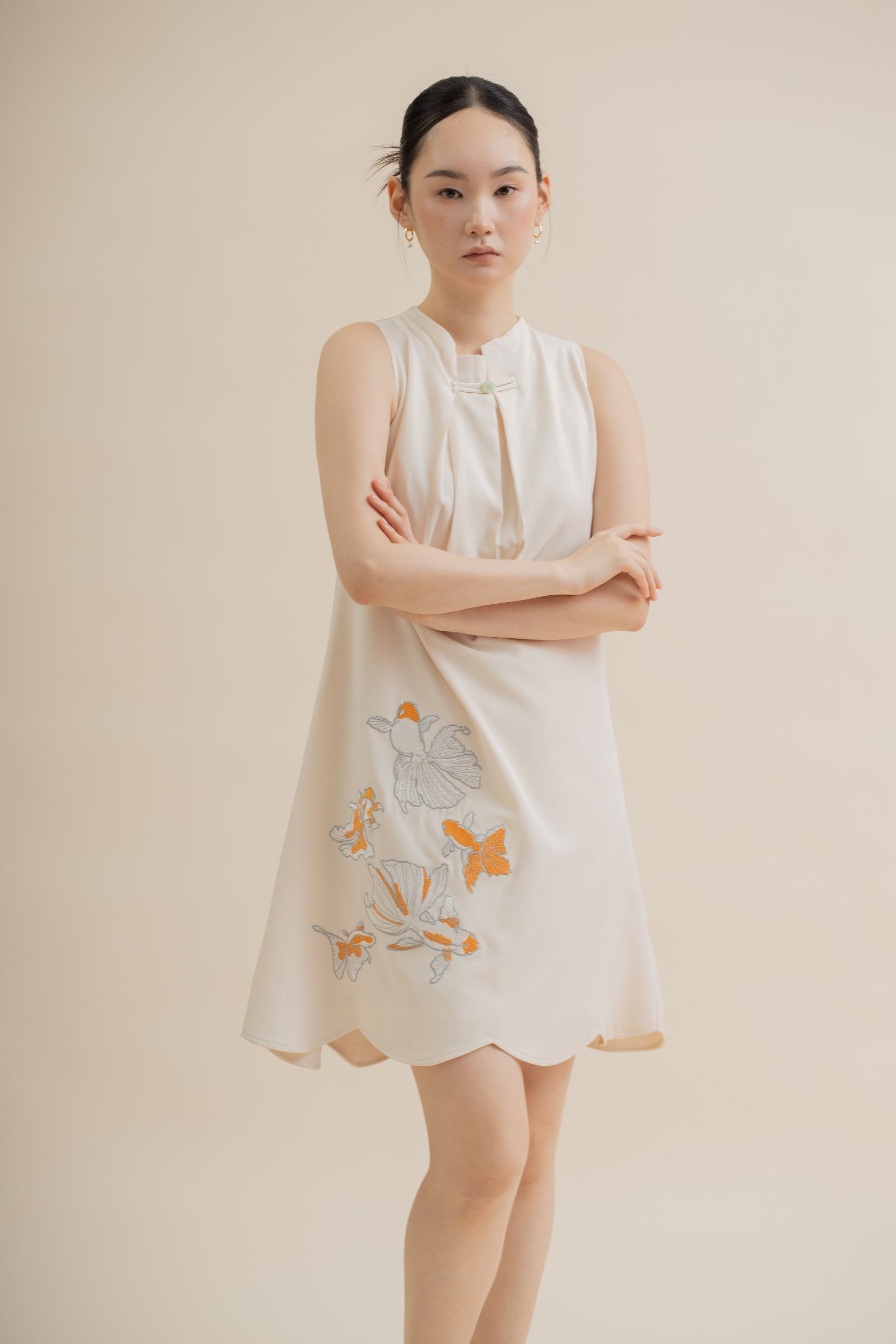 Goldfish Embroidery Pleated Sleeveless Dress (Beige)