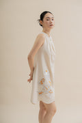 A poetic balance of grace and movement, this dress captures the beauty of goldfish embroidery — a symbol of prosperity and harmony — set against a serene blue backdrop. Crafted from a smooth blend of 95% Polyester and 5% Spandex, it offers a soft yet structured drape that flatters the figure. Pleated details at the chest add dimension and refinement, while the sleeveless cut keeps the look fresh and versatile.