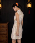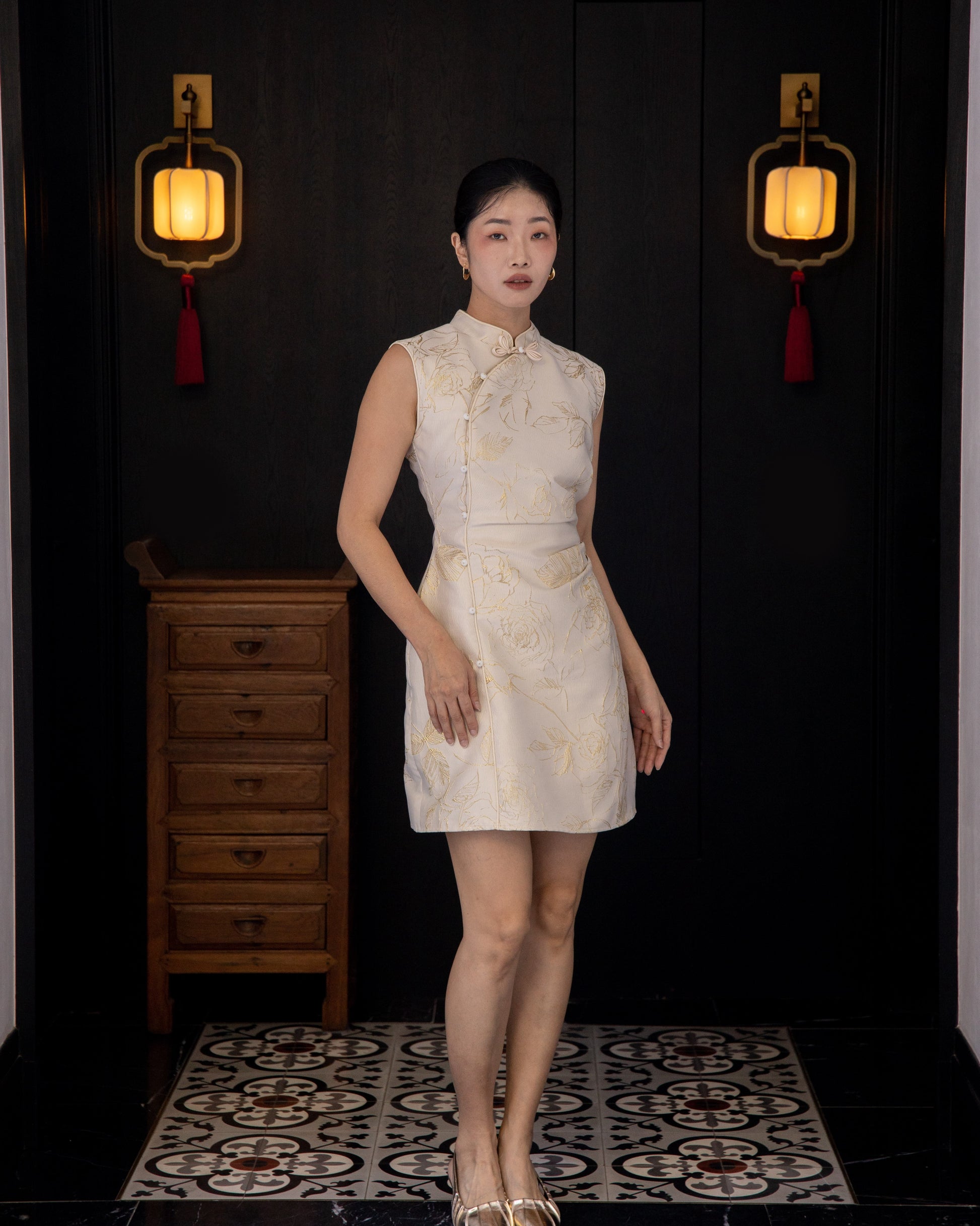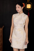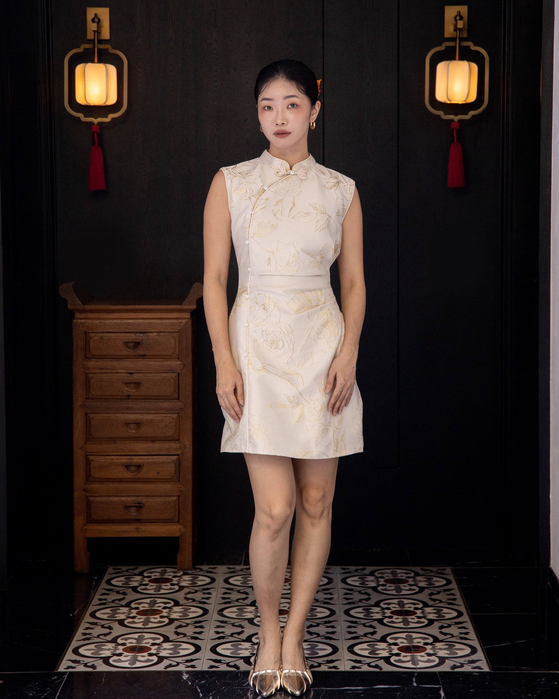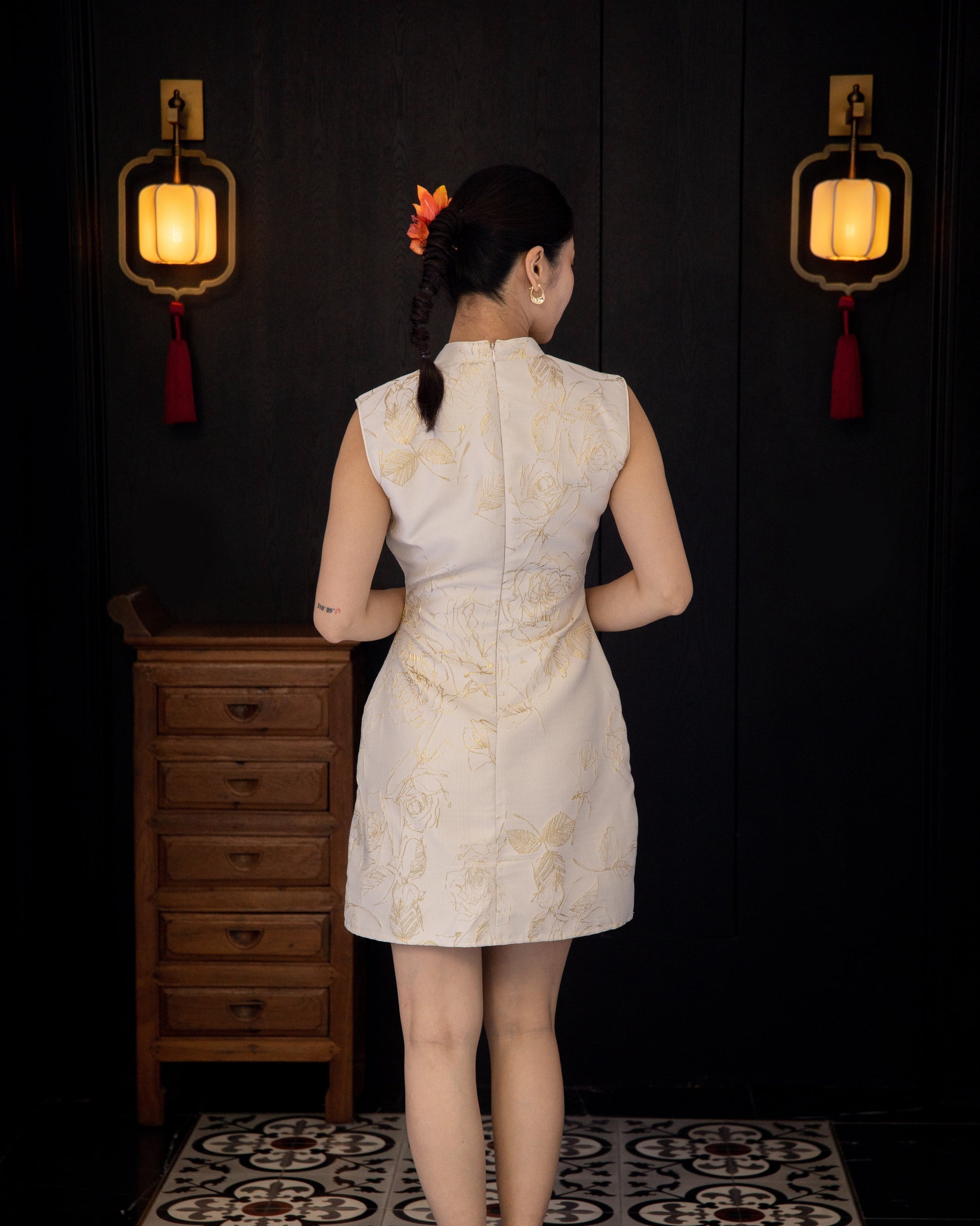 Floral Gold Gathered Cheongsam Dress (Beige)