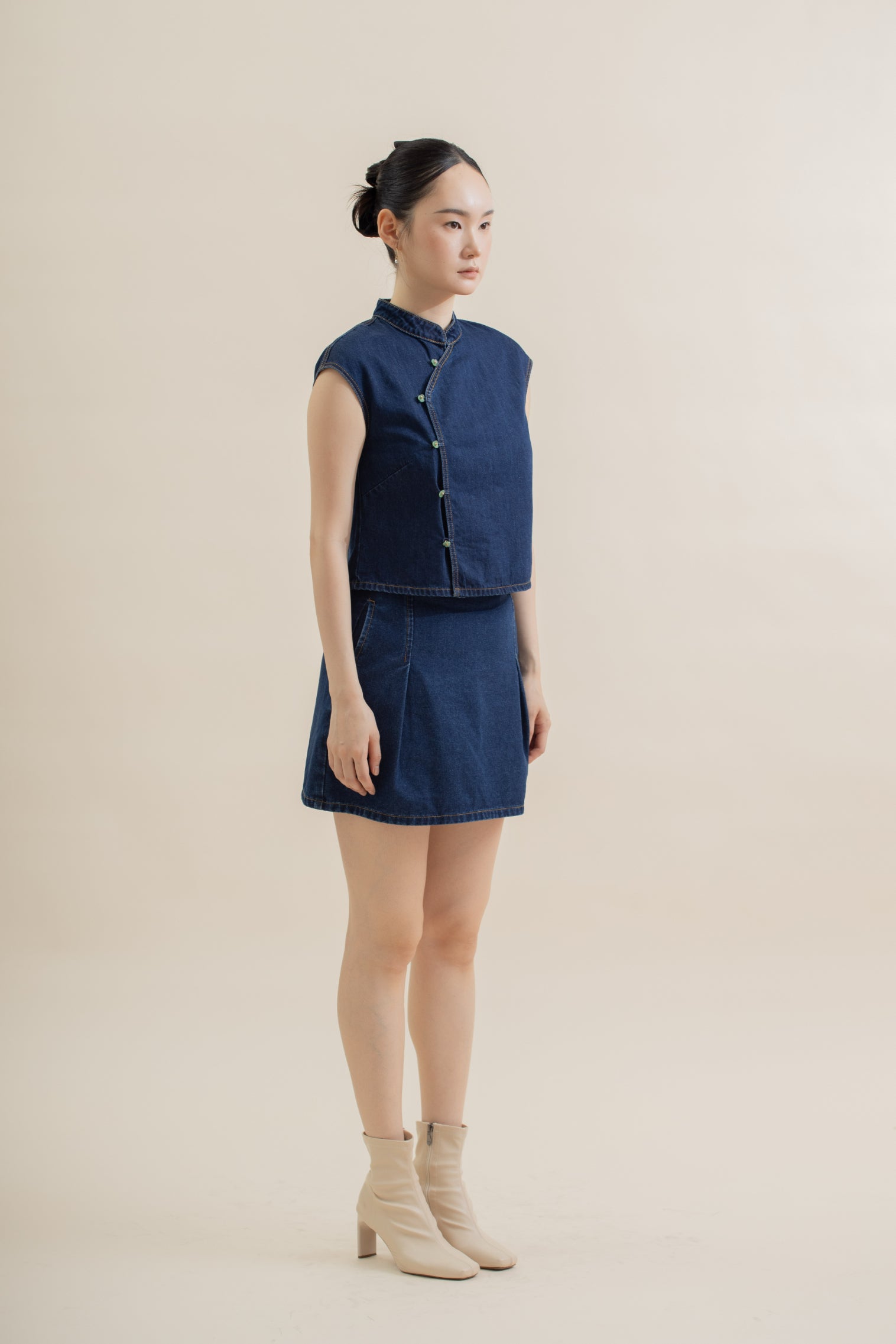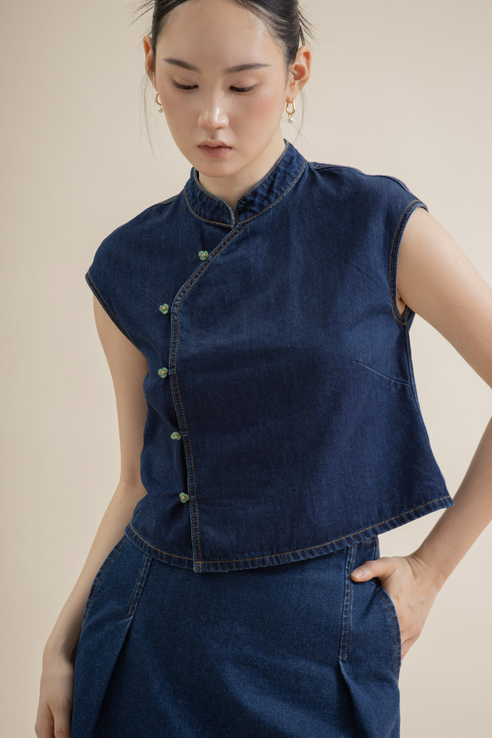 Floral Jade Button Denim Cheongsam Top (Dark Denim)