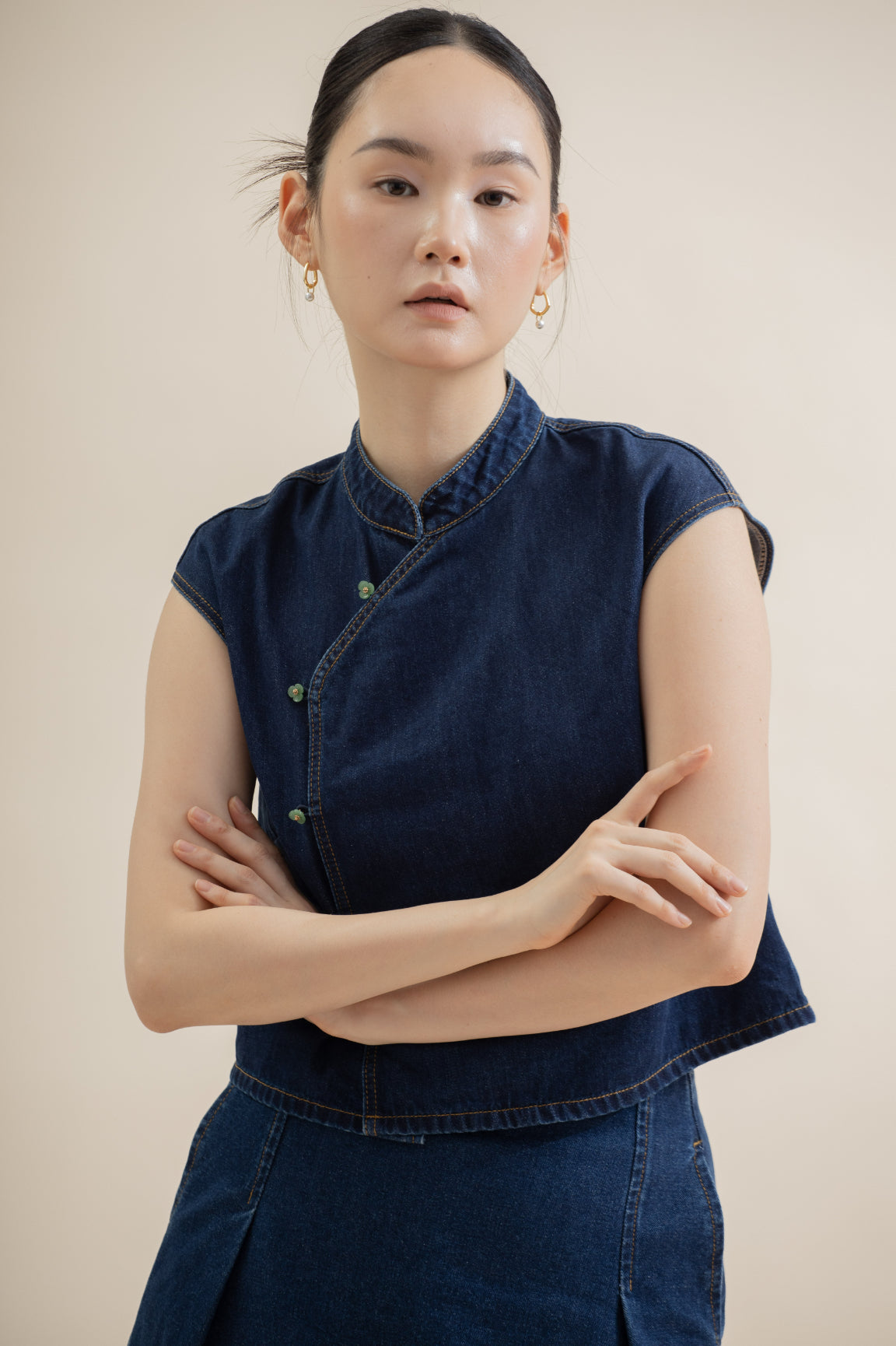 Tradition meets modern ease. Crafted from 100% cotton denim in a dark wash finish, this cheongsam-inspired top features jade-like side buttons and cap sleeves for a graceful yet casual look. Perfect for adding a touch of heritage charm to your daily style.