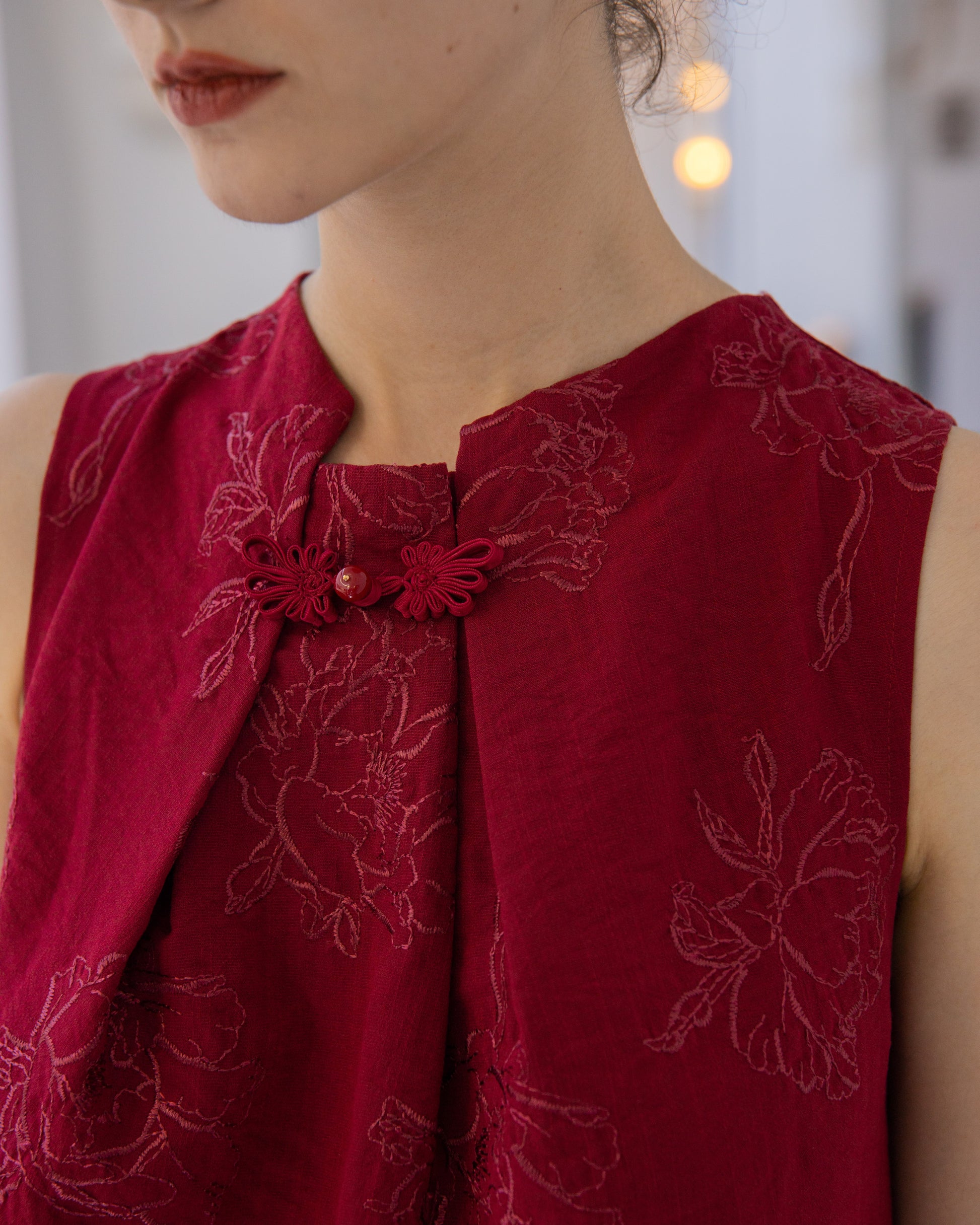 Floral Rouge Pleated Neckline Cheongsam Dress, a stunning red dress with intricate floral embroidery, exudes an air of elegance and grace. Featuring a pleated neckline, it offers a flattering A-line design that shapes the figure beautifully. The dress is finished with traditional Chinese knot and red jade buttons, alongside a comfortable lining for all-day wear. Perfect for a refined and timeless look.
