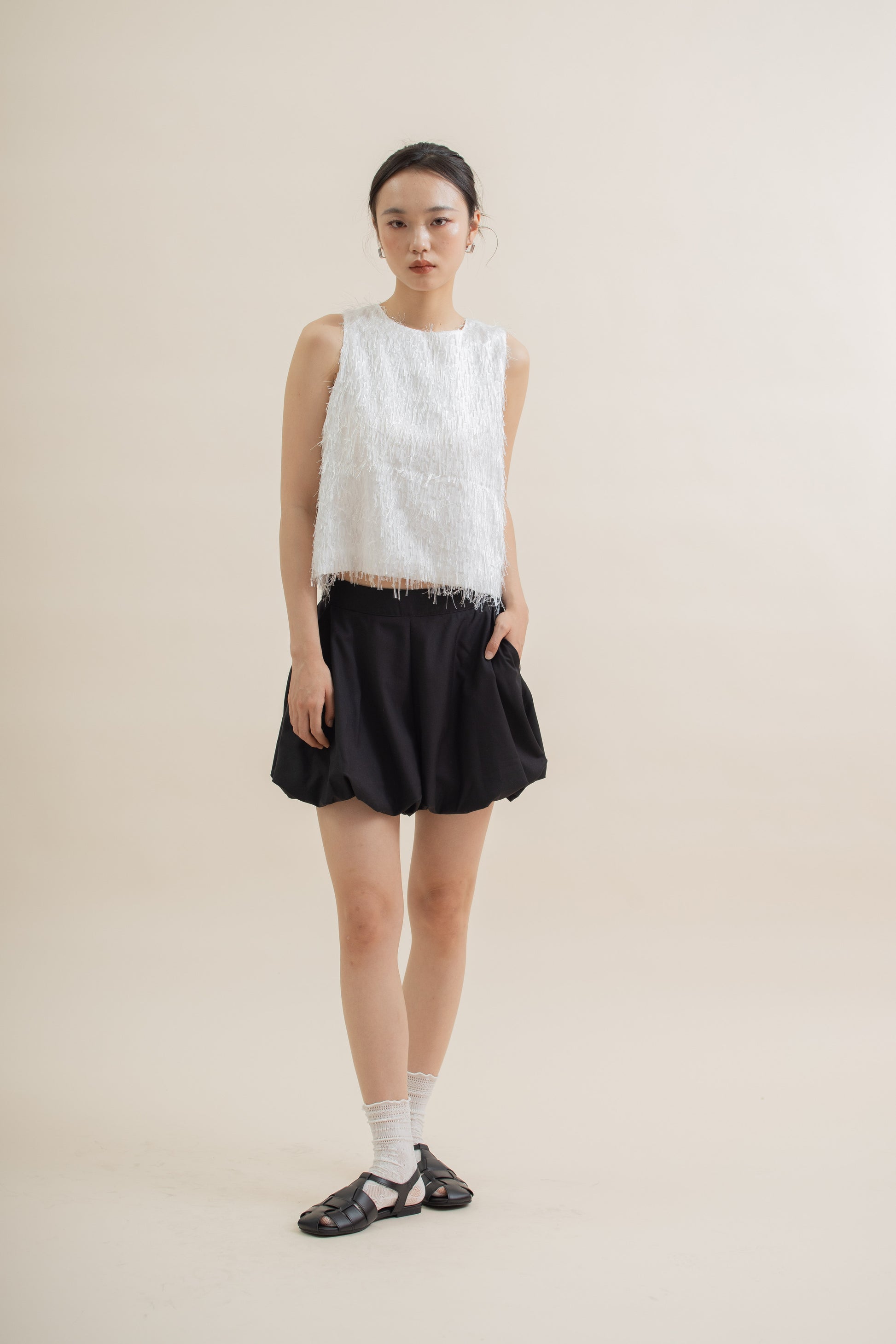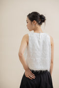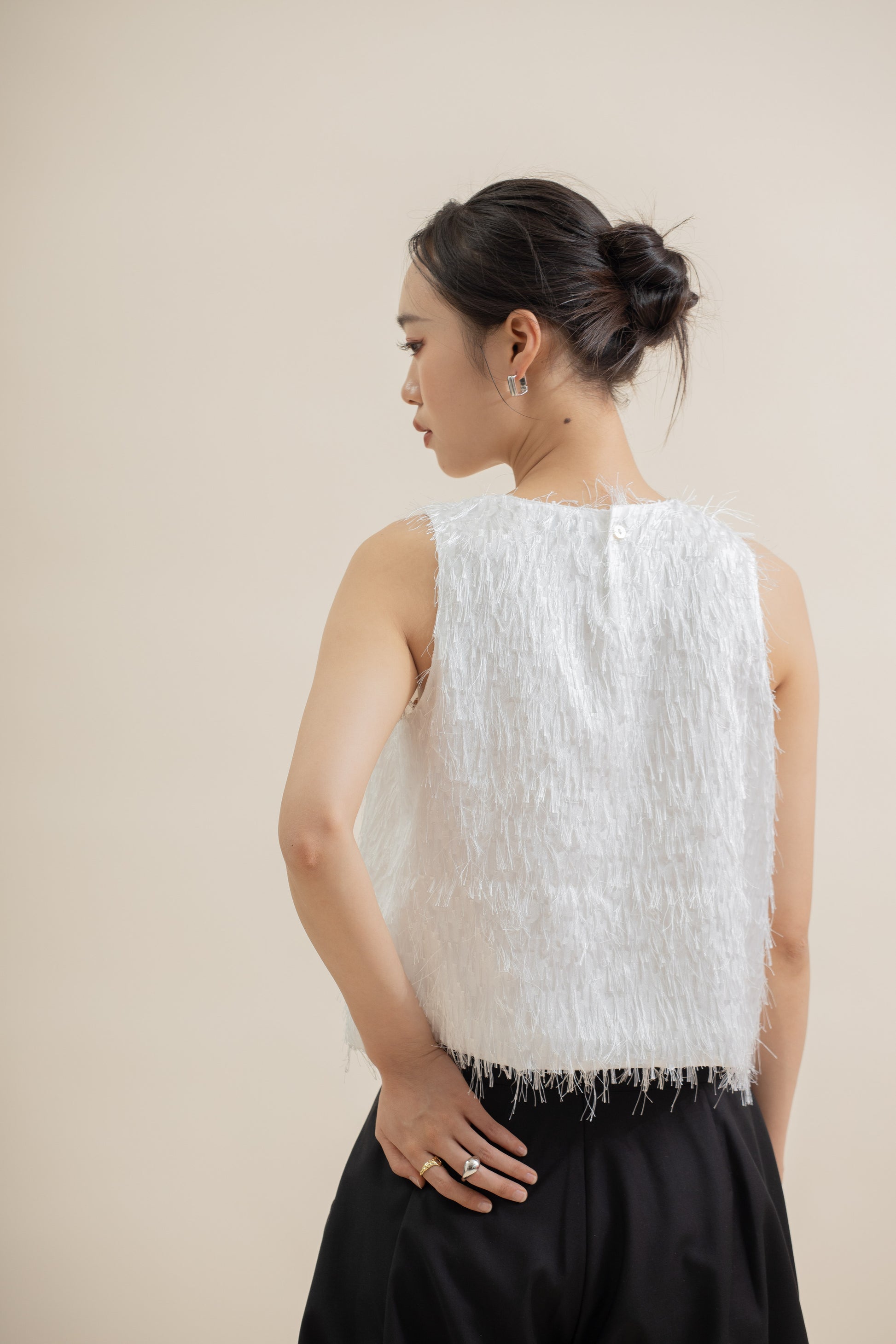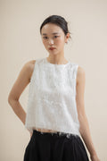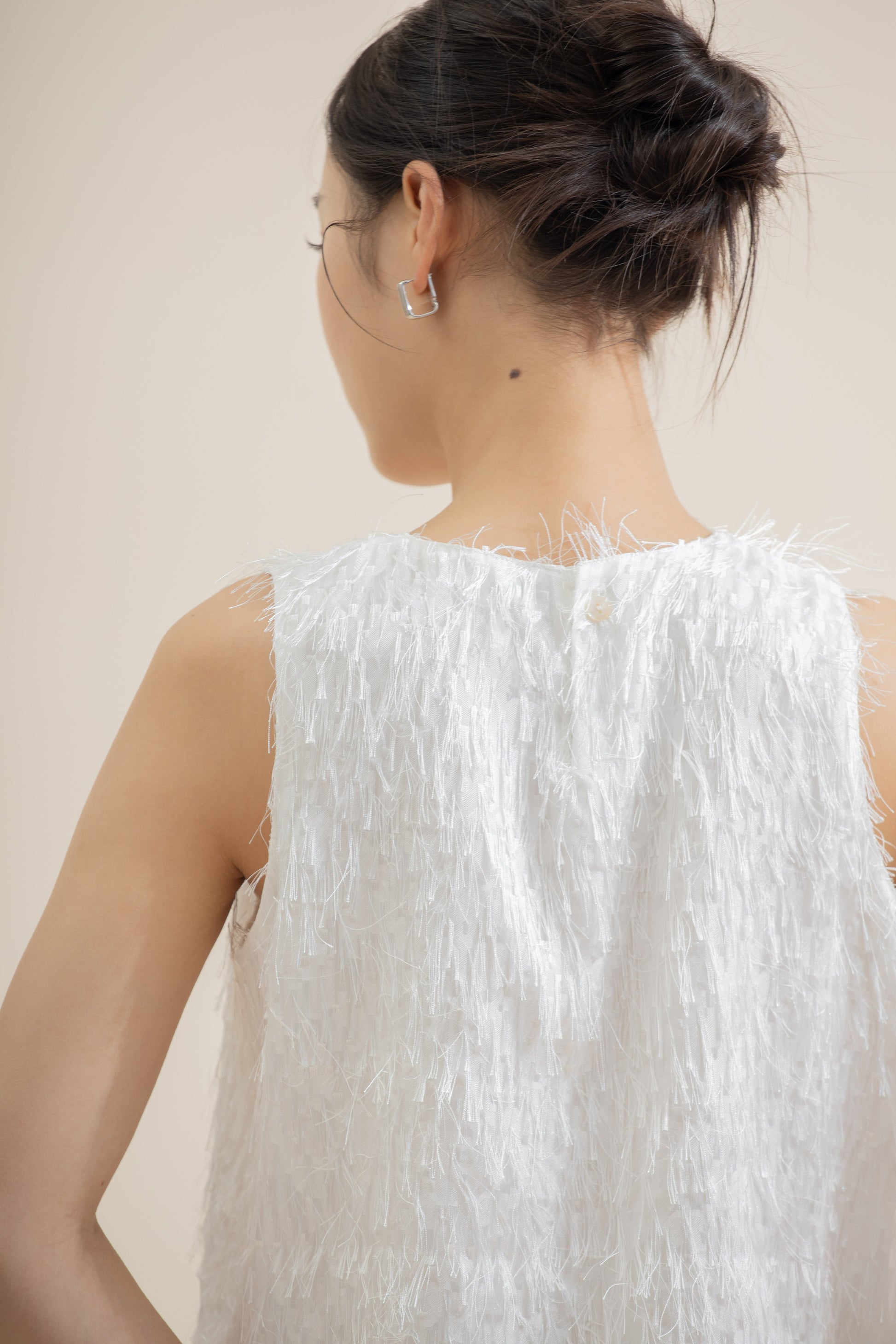 Chic and contemporary — this sleeveless top stands out with its soft fringe-textured fabric that adds subtle movement and dimension. Crafted from 100% polyester, it’s lightweight, breathable, and holds its shape beautifully.