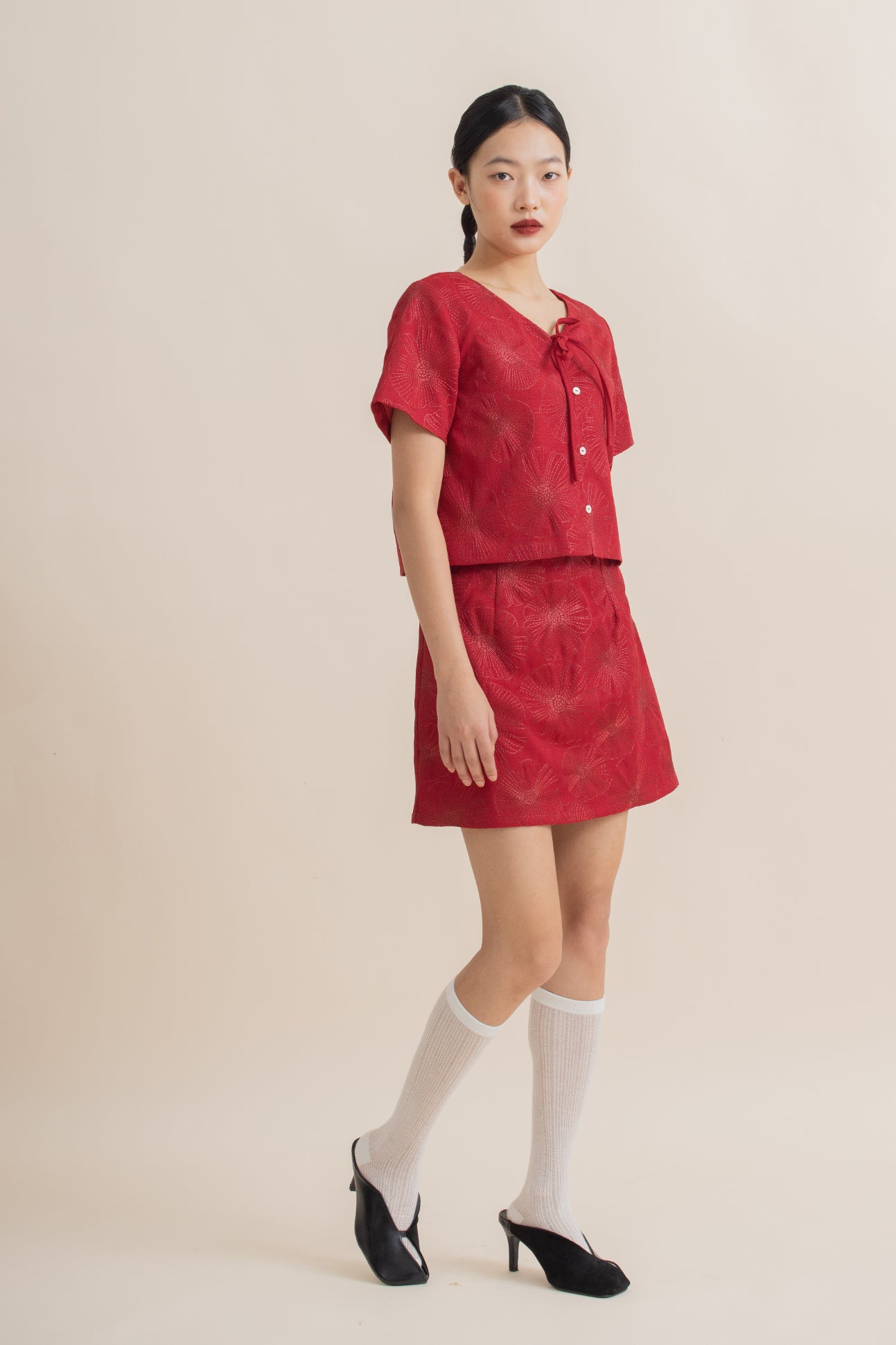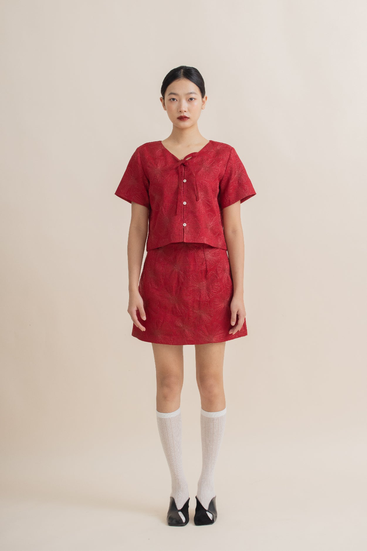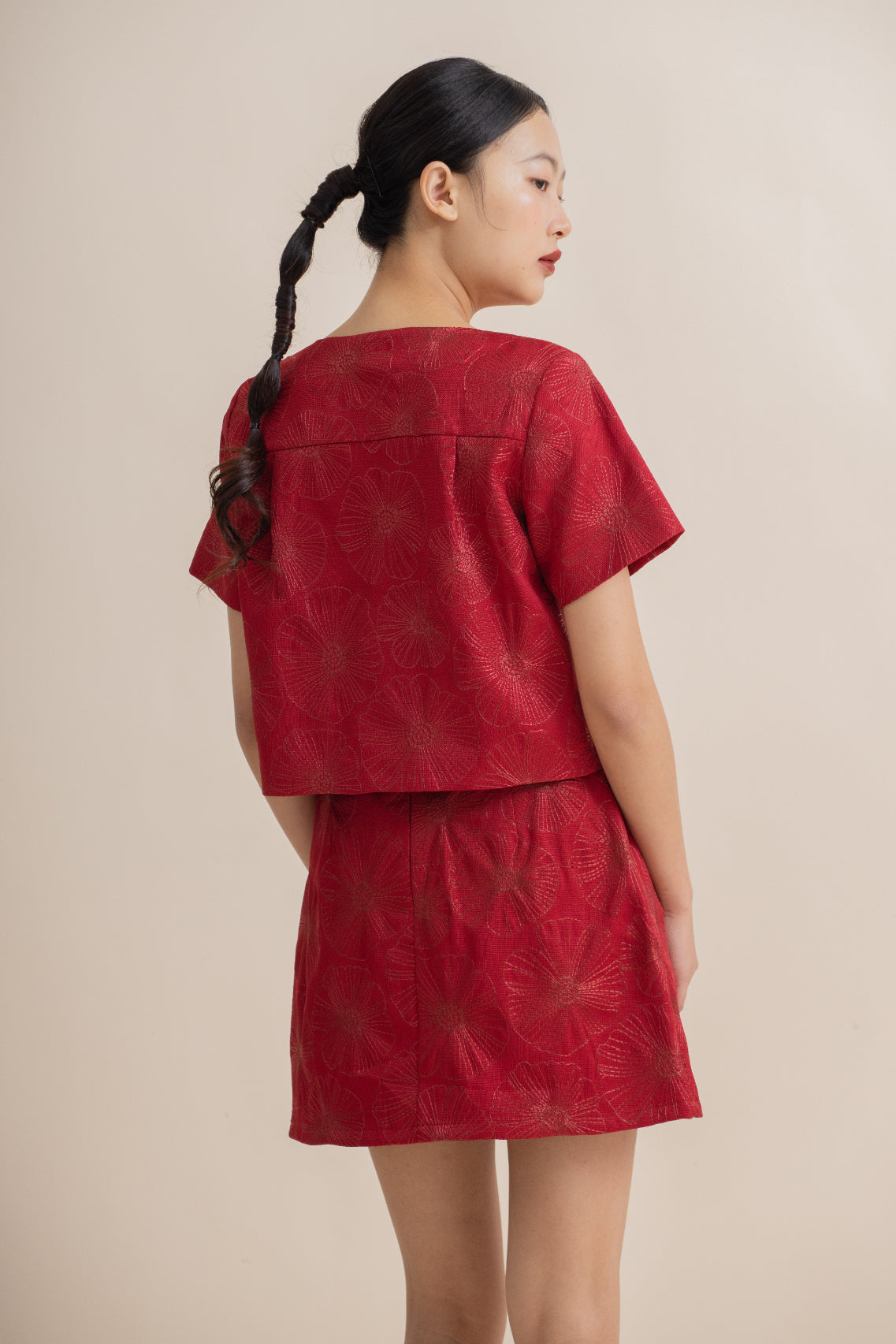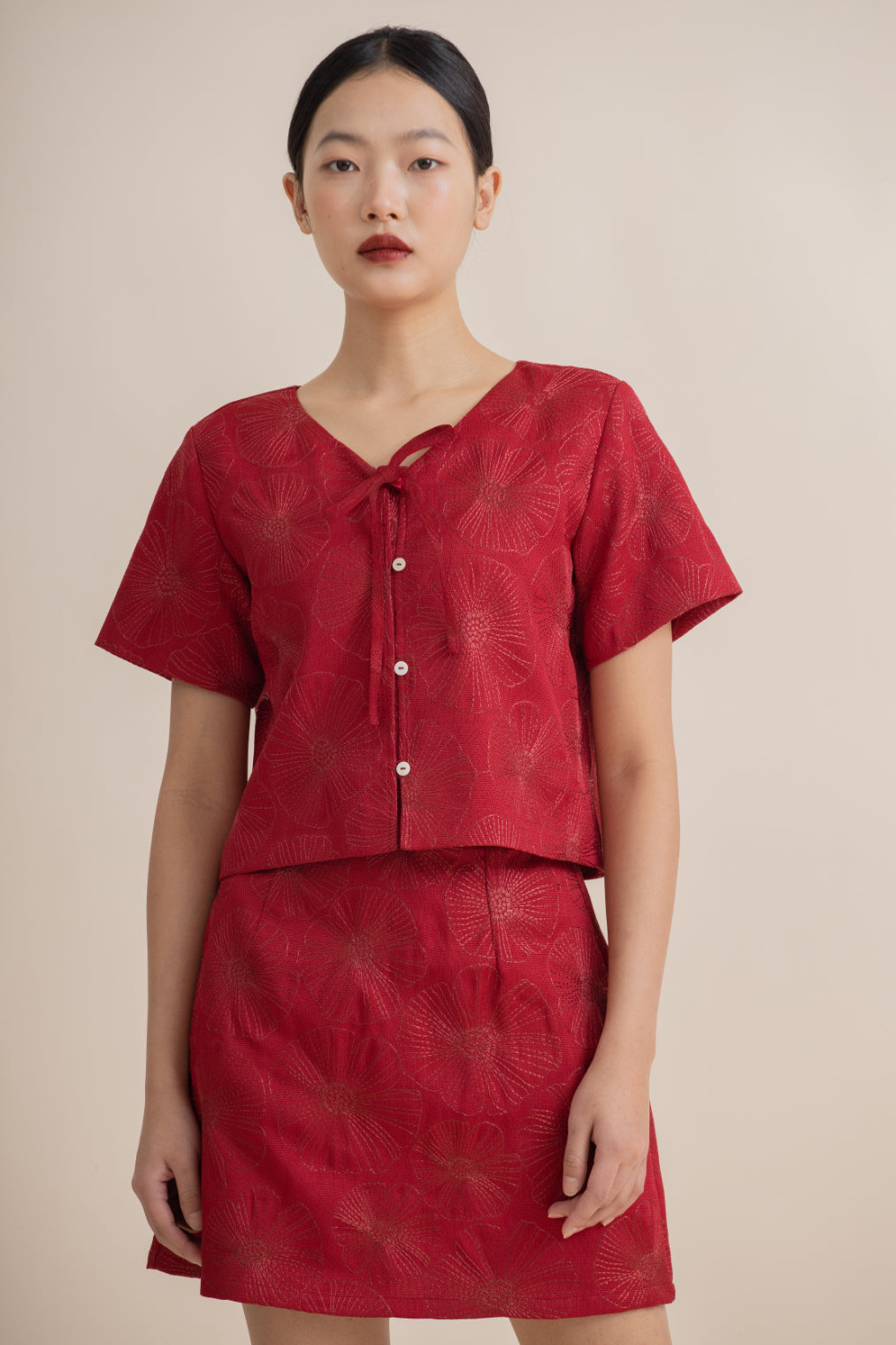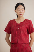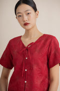 Full Blossom Embroidery Ribbon Short Sleeve Top (Red)