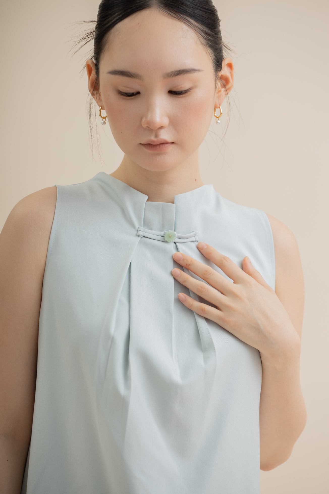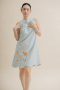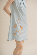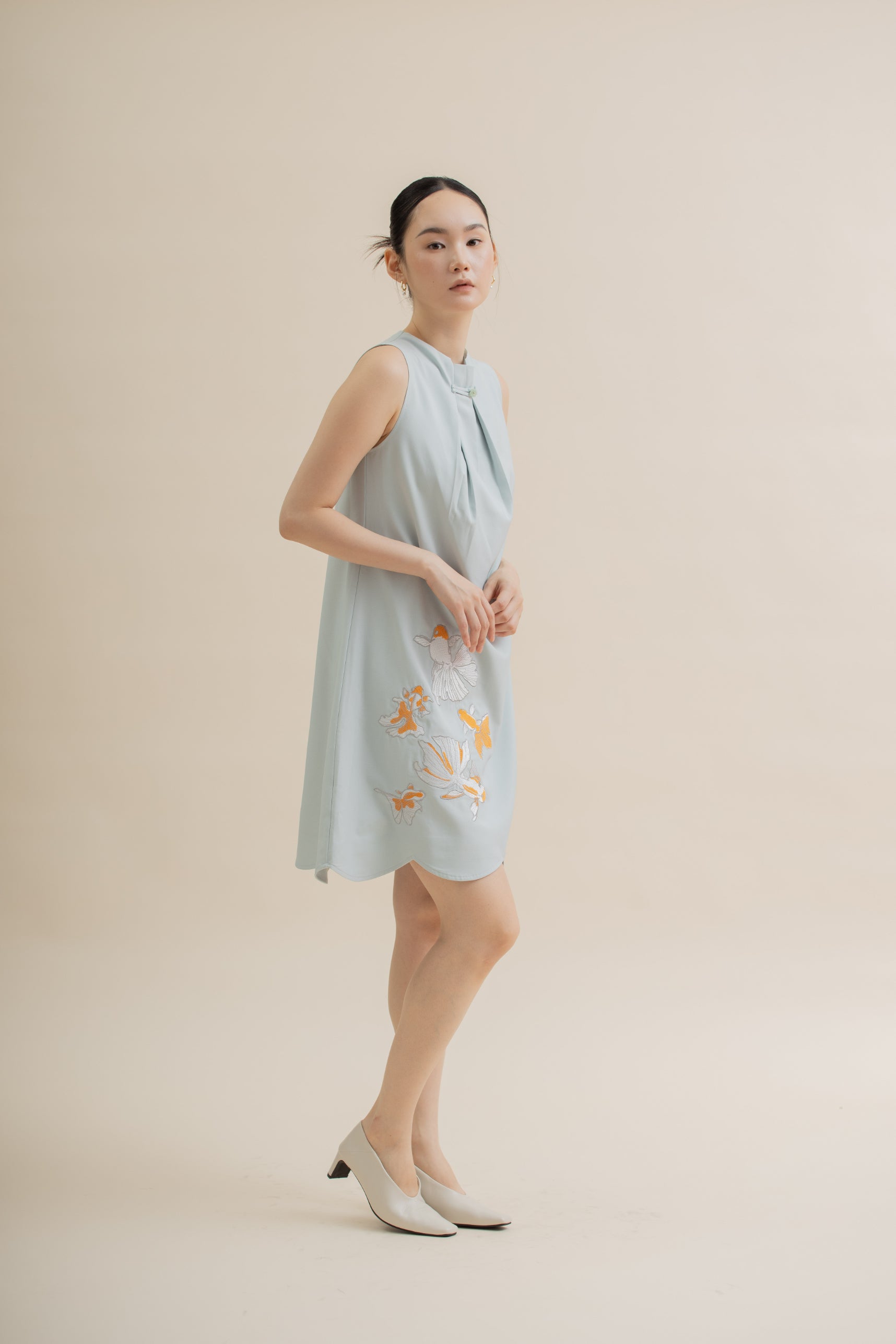 A poetic balance of grace and movement, this dress captures the beauty of goldfish embroidery — a symbol of prosperity and harmony — set against a serene blue backdrop. Crafted from a smooth blend of 95% Polyester and 5% Spandex, it offers a soft yet structured drape that flatters the figure. Pleated details at the chest add dimension and refinement, while the sleeveless cut keeps the look fresh and versatile.