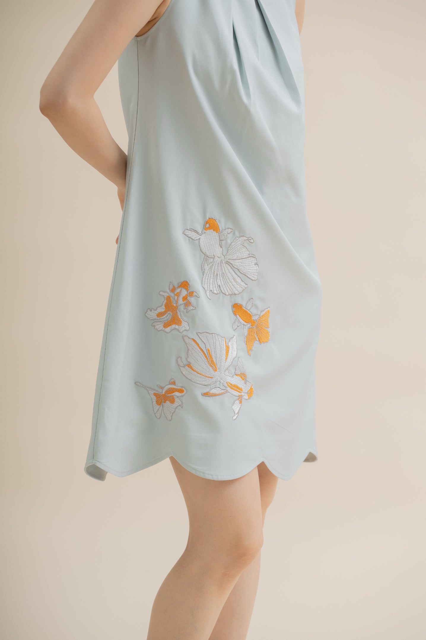 Goldfish Embroidery Pleated Sleeveless Dress (Blue)