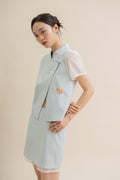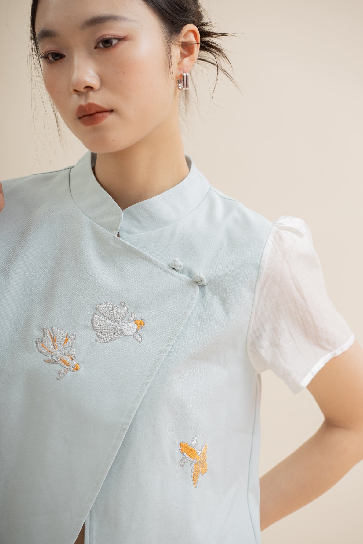 Goldfish Embroidery Sheer Sleeve Cheongsam Top (Blue)