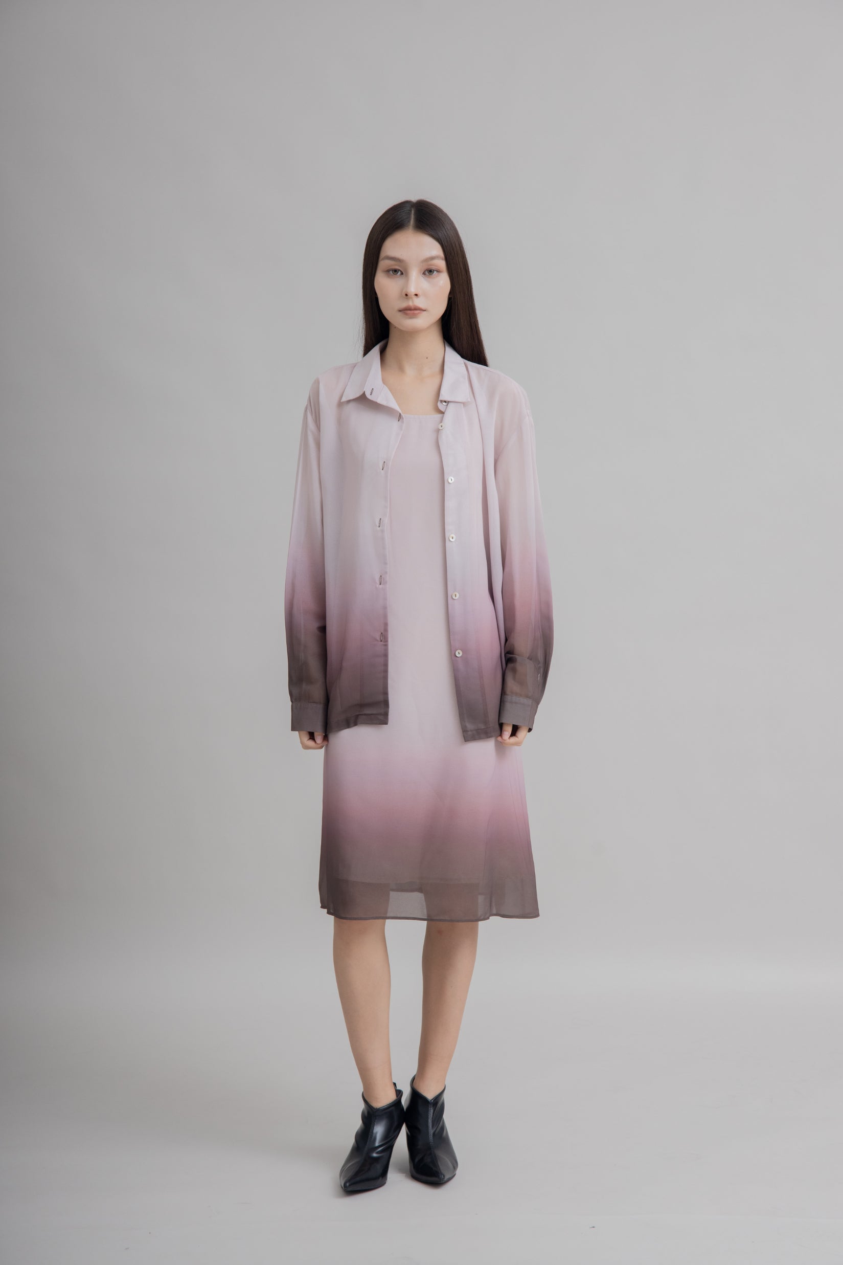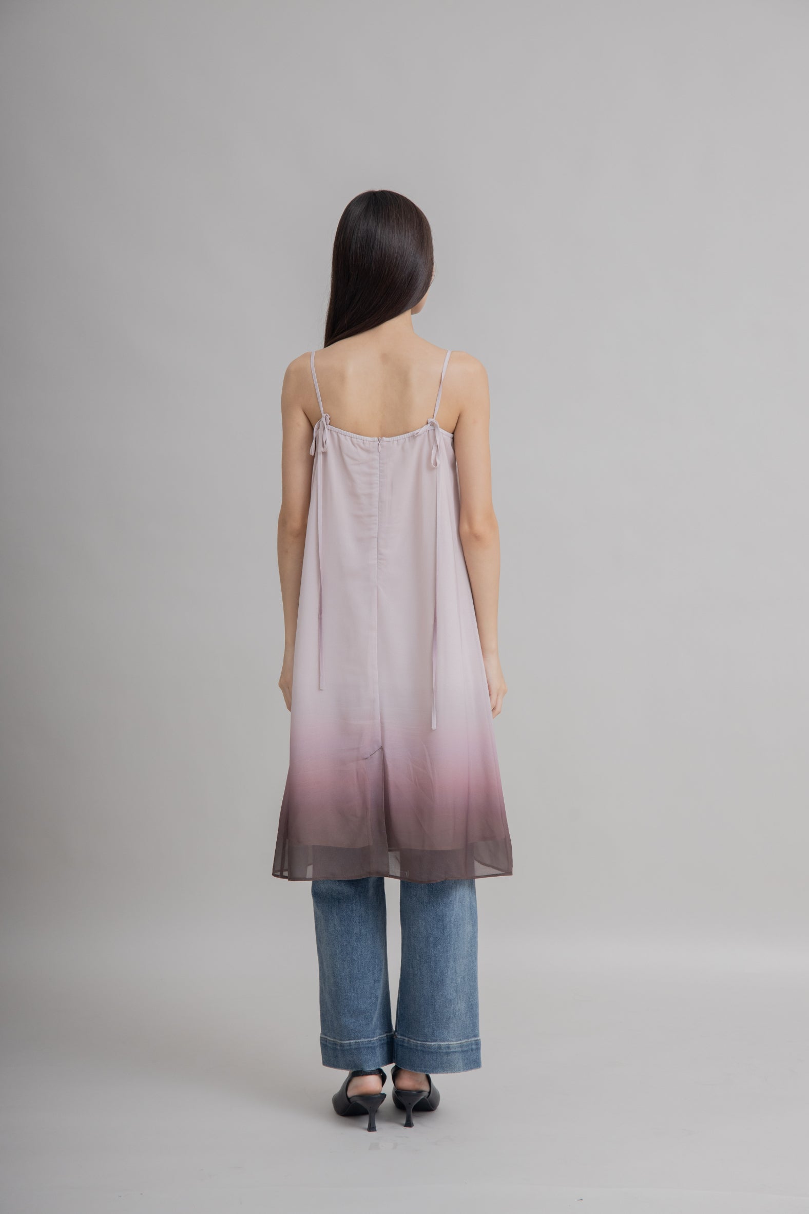 Effortless elegance in full flow. This strap long dress is made from a lightweight blend of 98% polyester and 2% spandex, designed to drape beautifully with a hint of stretch. The standout detail lies in its pink-to-brown gradient hem, creating a soft, flowing transition of color that moves gracefully with every step. With its airy sheer finish and timeless silhouette, it’s the perfect piece for both daytime charm and evening sophistication.