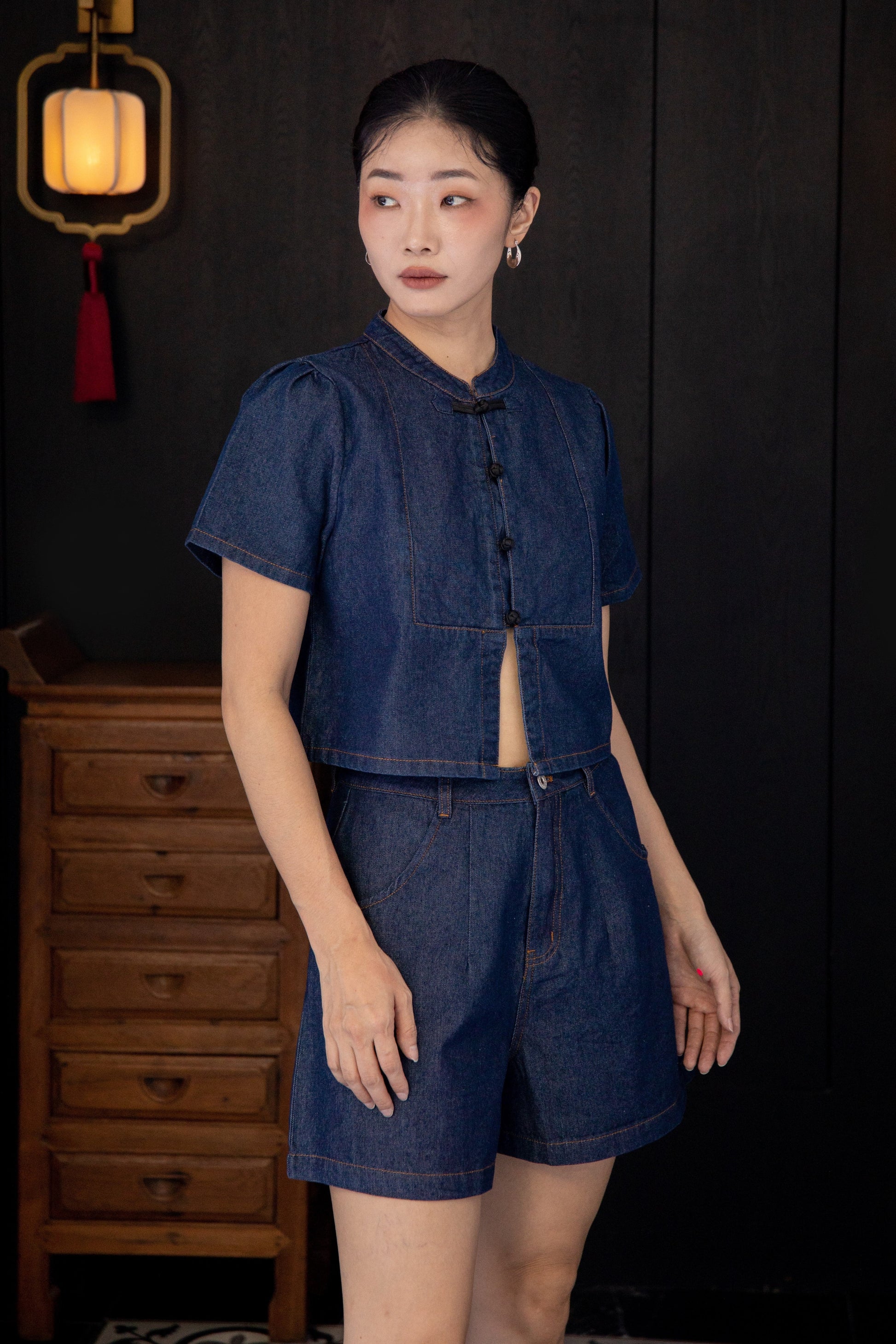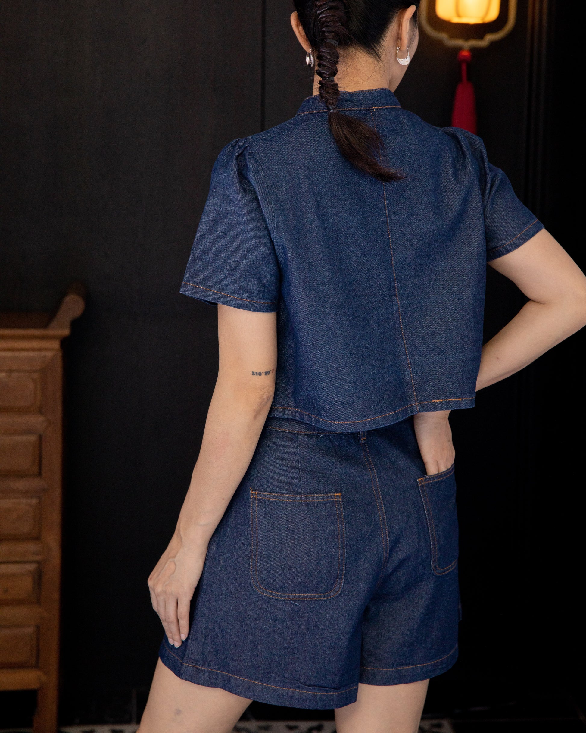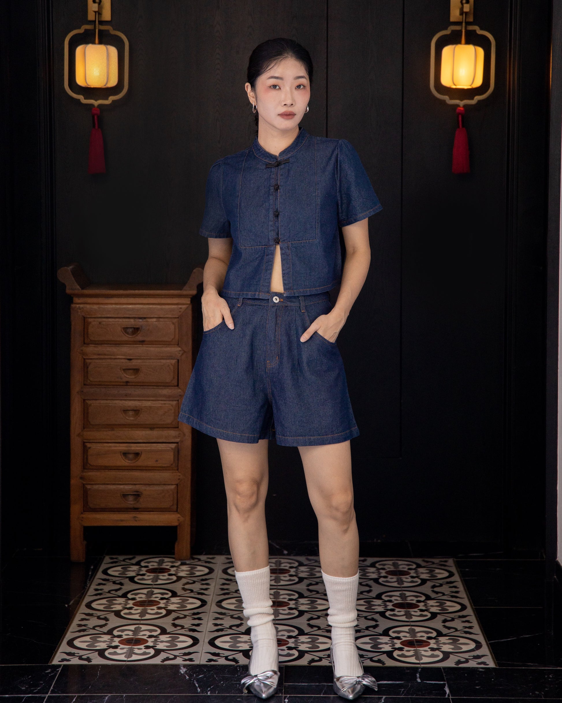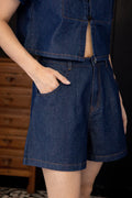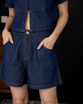 The Printed Pocket A Line Denim Shorts, crafted from 100% cotton, feature a unique A-line cut for a flattering fit. The pockets are accented with delicate blue-and-white porcelain fabric, adding a touch of artistry to the classic denim design. With two side pockets and two back pockets, these shorts combine practicality with style. Perfect for adding a creative twist to your everyday look.