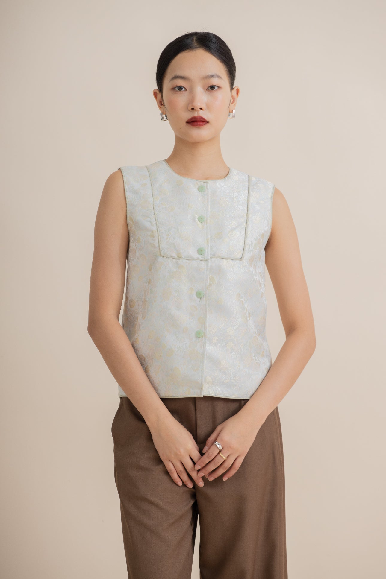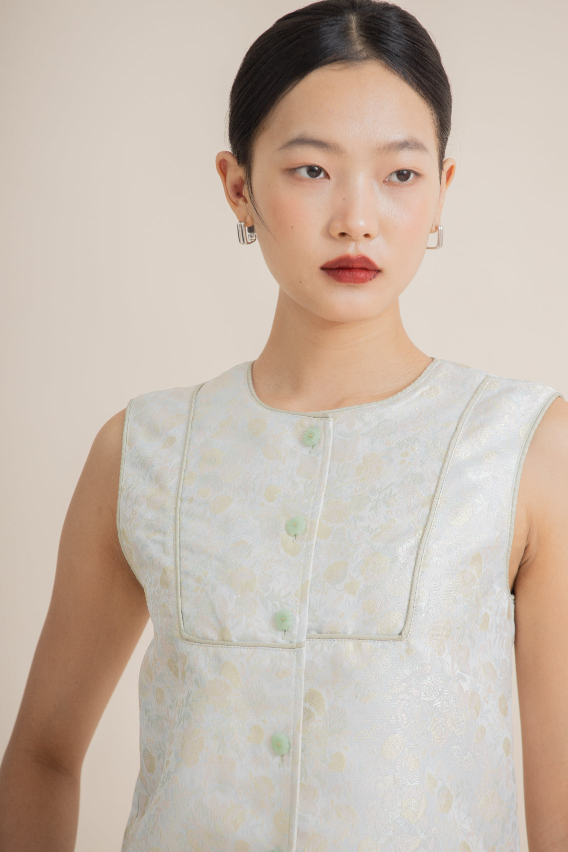 A graceful sleeveless top crafted from 100% Polyester, featuring an elegant jacquard floral pattern that adds subtle texture and depth. The design is finished with delicate jade-colored flower button details, giving it a classic cheongsam touch. Light, feminine, and refined—perfect for elevating everyday looks with a hint of tradition.