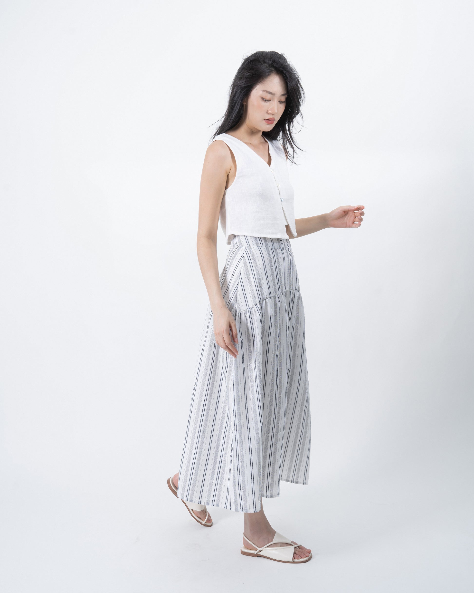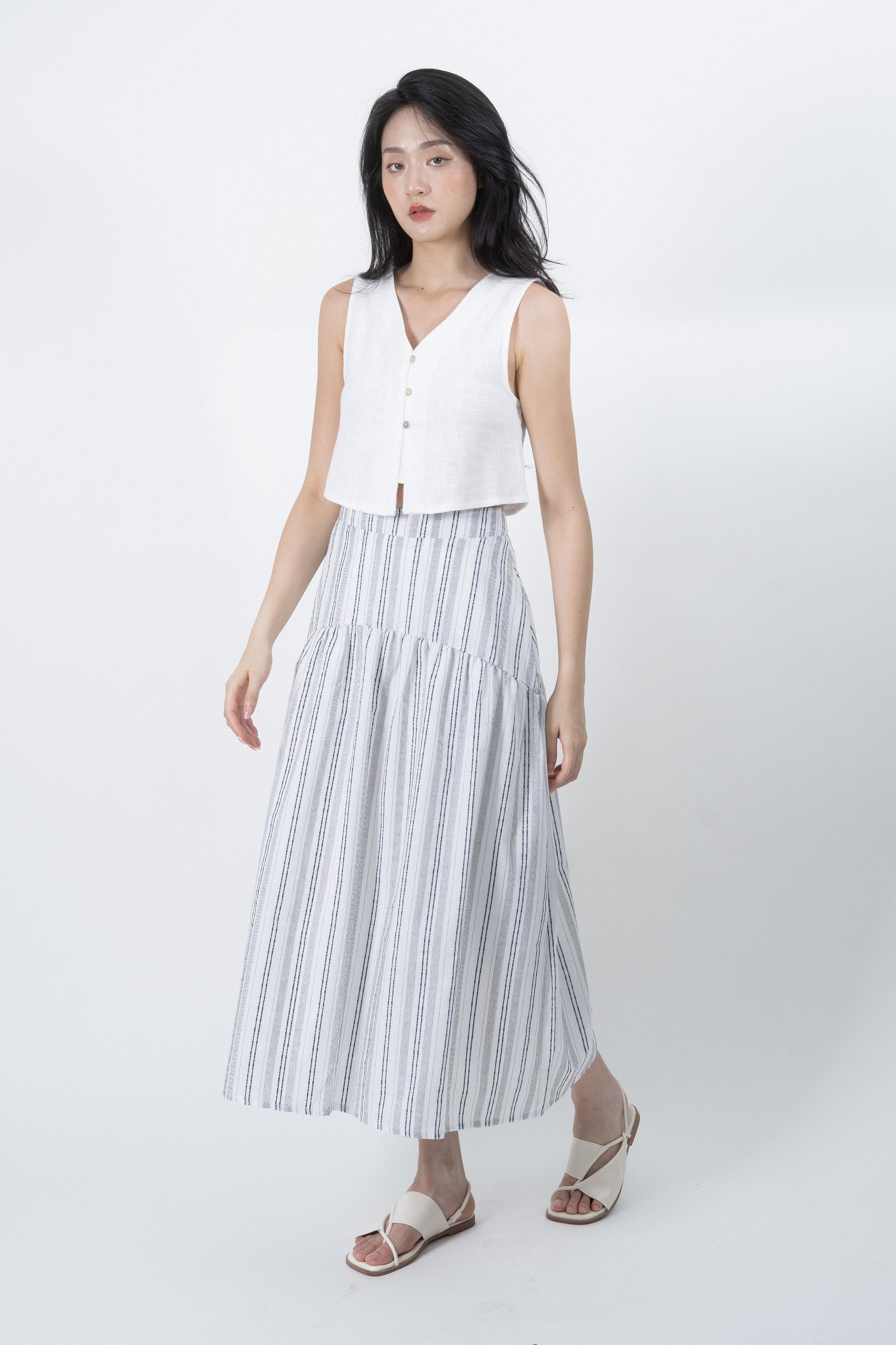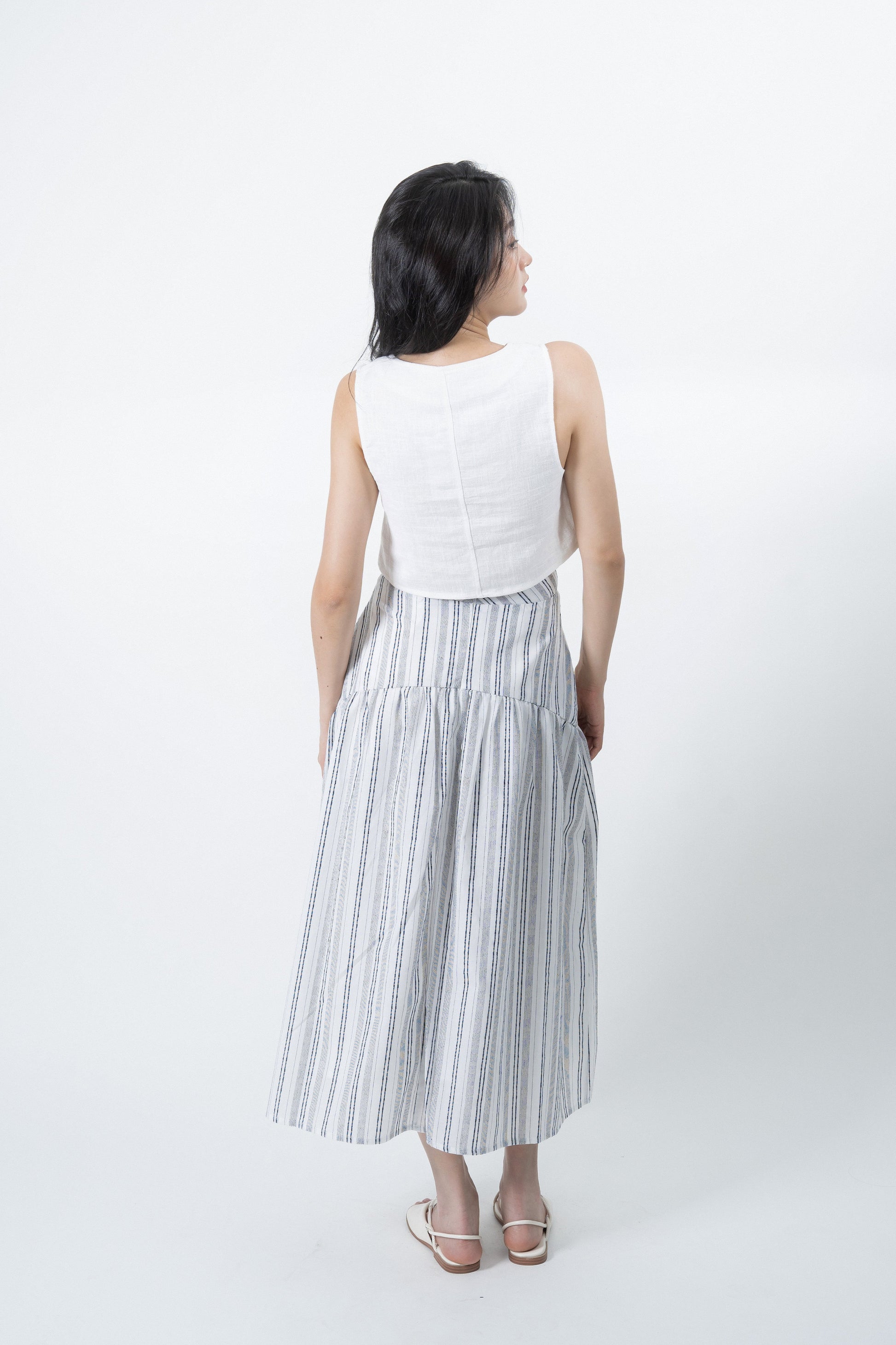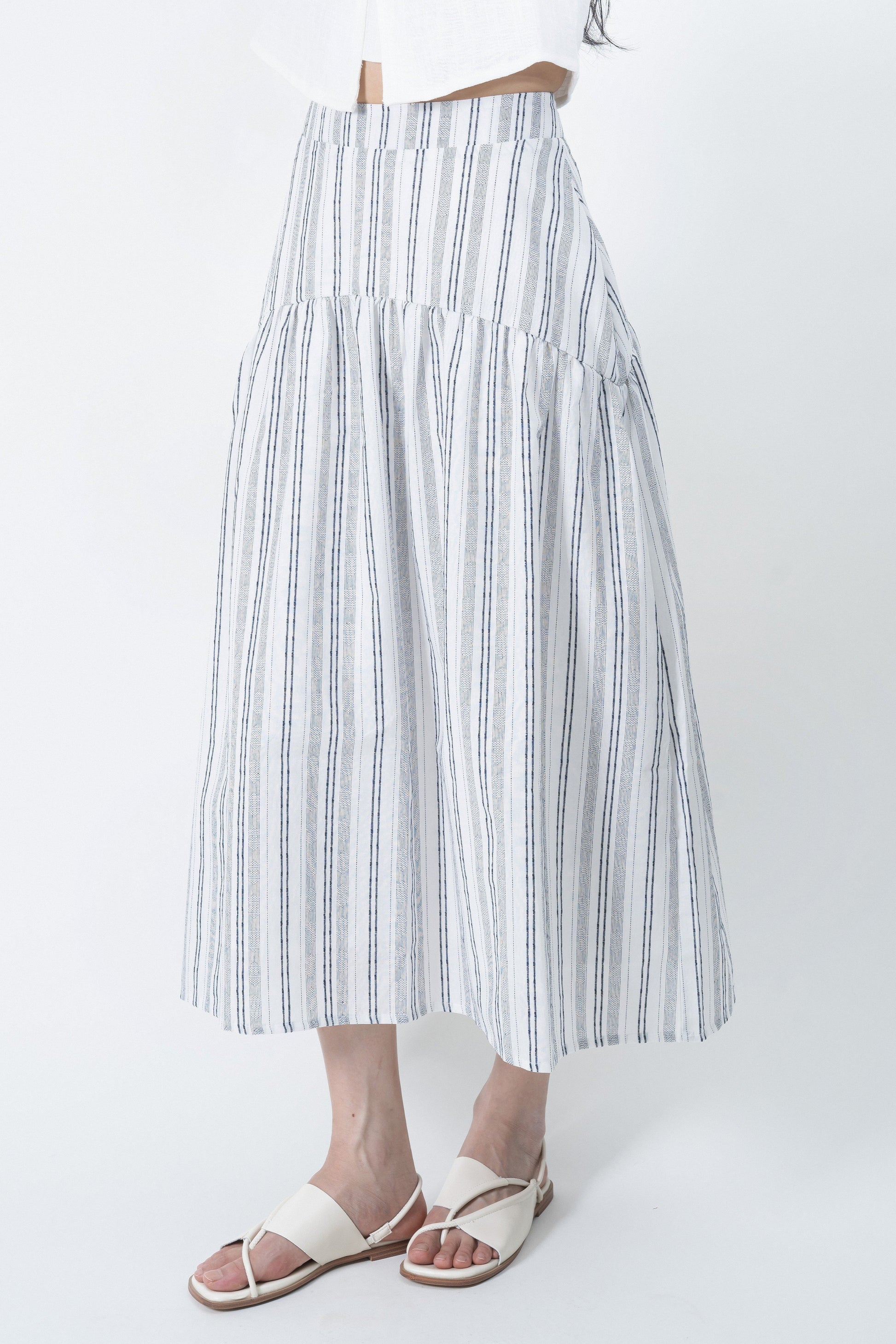 Easily transition from work to the beach with our maxi flare skirt. Pair it with a tank top or blouse to effortlessly achieve different looks. Crafted from airy 100% cotton, it keeps you feeling refreshed all day long. With its simple, light, and striped design, it embodies the essence of a perfect summer look.