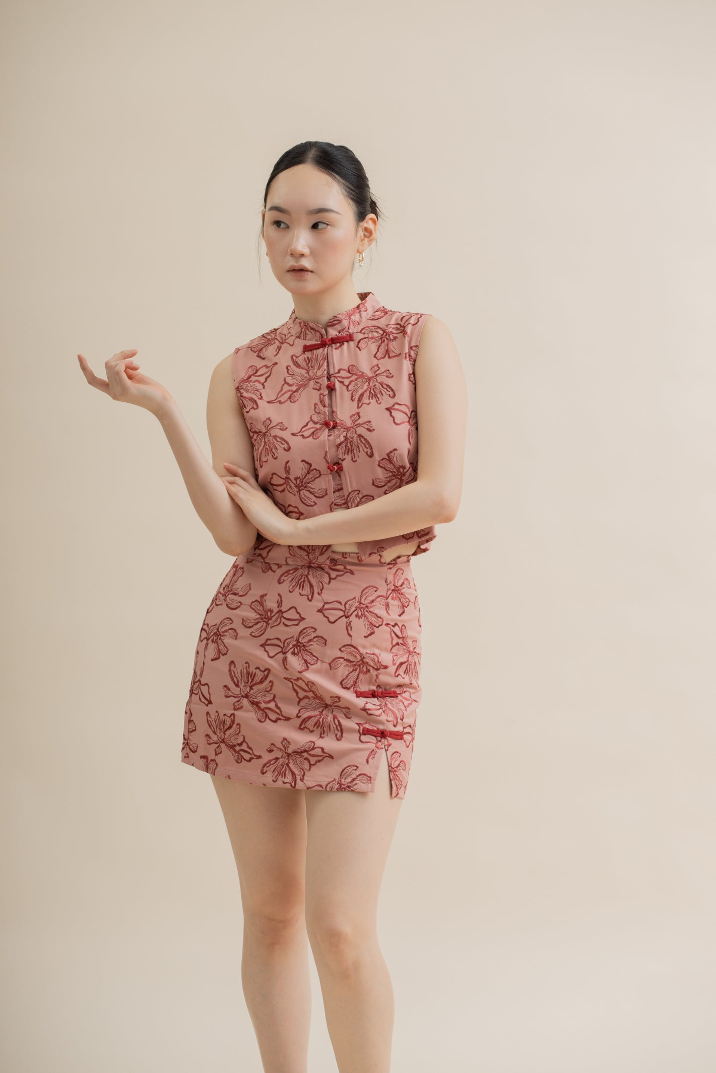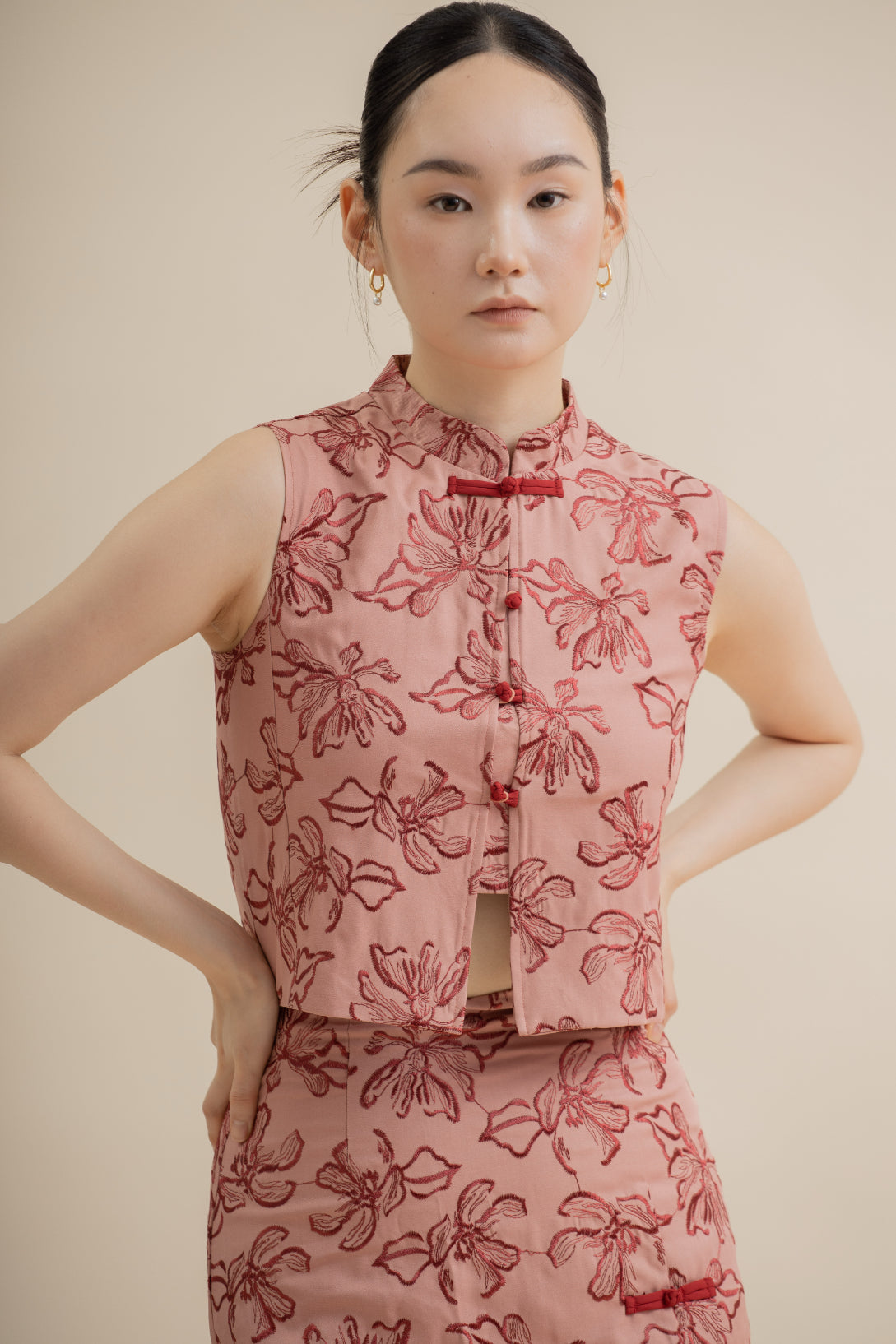 A modern take on classic elegance — this cheongsam-inspired top blends traditional charm with everyday wearability. Crafted from a soft, slightly stretchy fabric (95% Polyester, 5% Spandex), it features delicate floral embroidery that adds texture and refinement to the look. The mandarin collar and curved piping detail highlight its oriental touch, while the sleeveless cut keeps it light and versatile for layering or standalone styling.