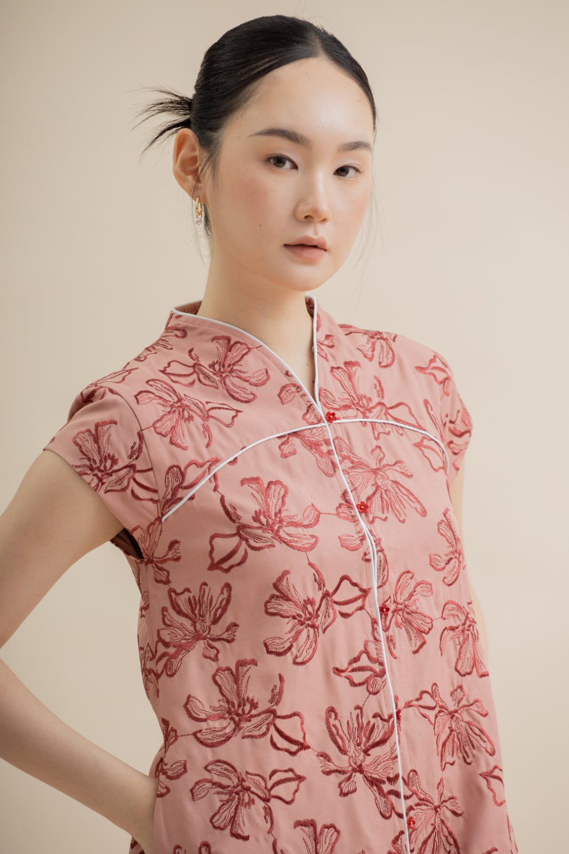 A modern reinterpretation of timeless elegance — this dress features the delicate floral embroidery that defines the collection, now in a flowing, slightly A-line silhouette. The V-neckline adds a touch of softness, while the button-down front is adorned with glossy oriental buttons that echo classic cheongsam detailing. Crafted from a smooth, lightly stretchy blend of 95% Polyester and 5% Spandex, it flatters the body while offering all-day comfort.