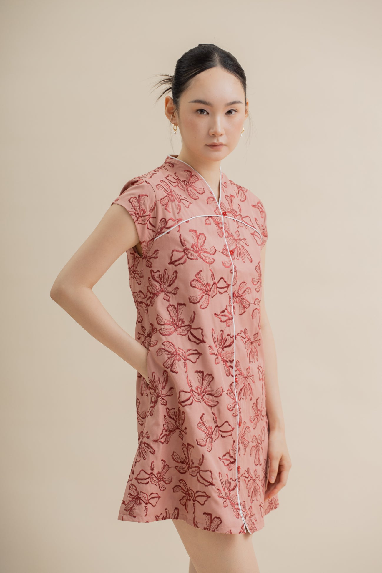 LingHua Embroidery V Neck Cheongsam Dress (Pink)