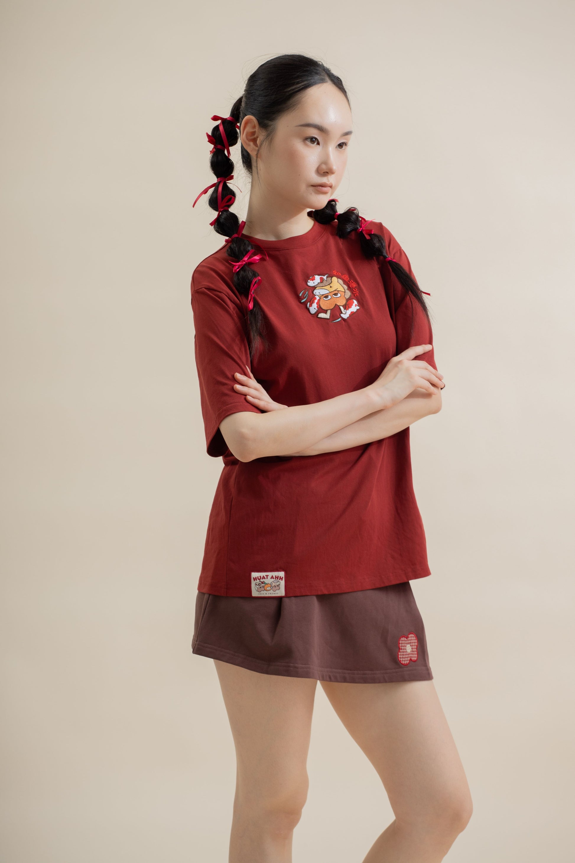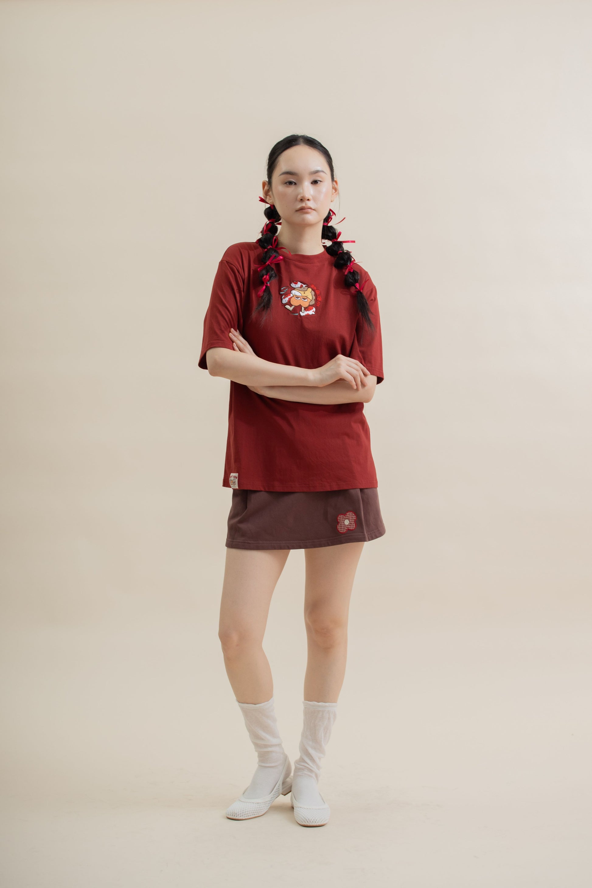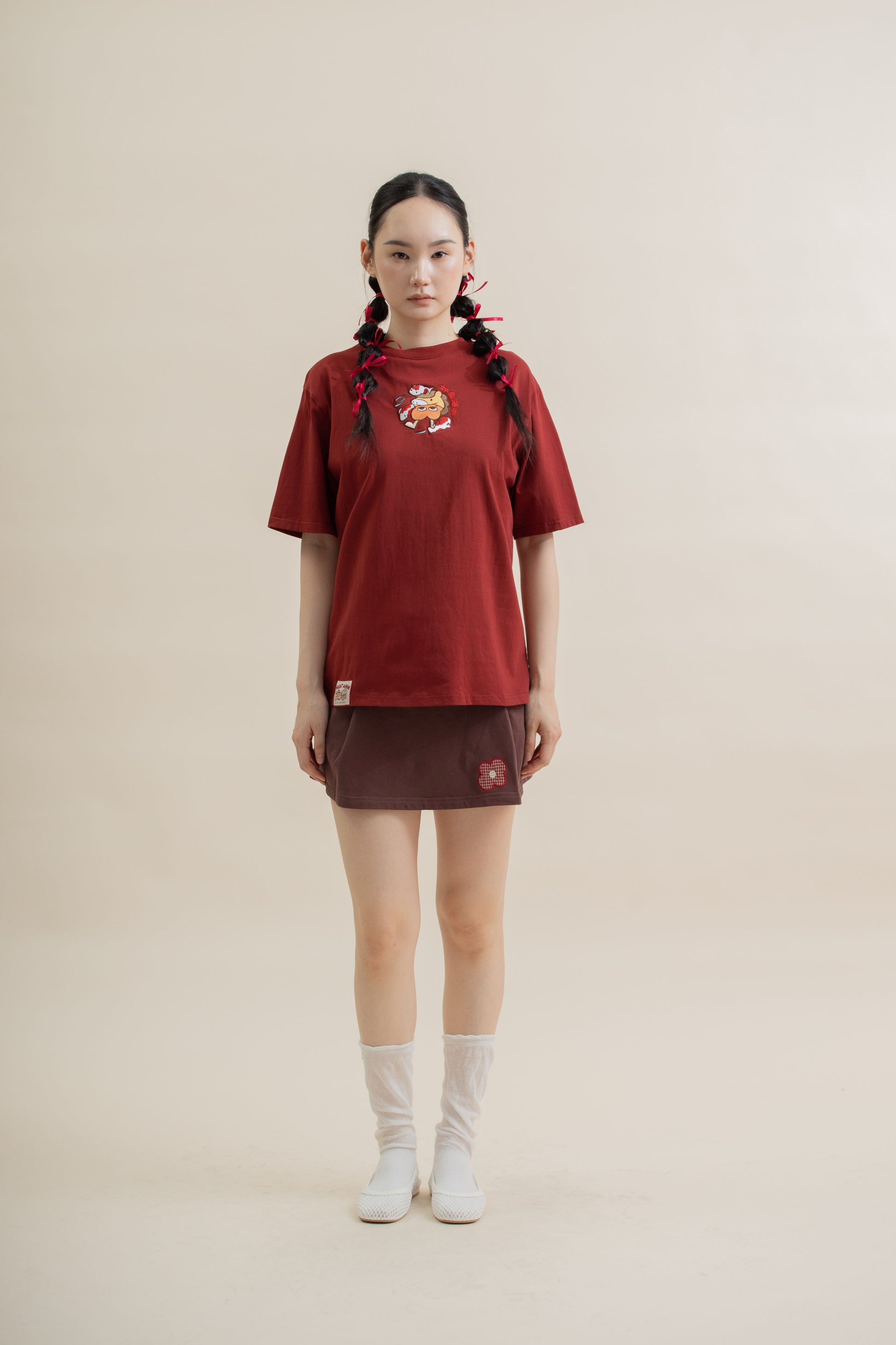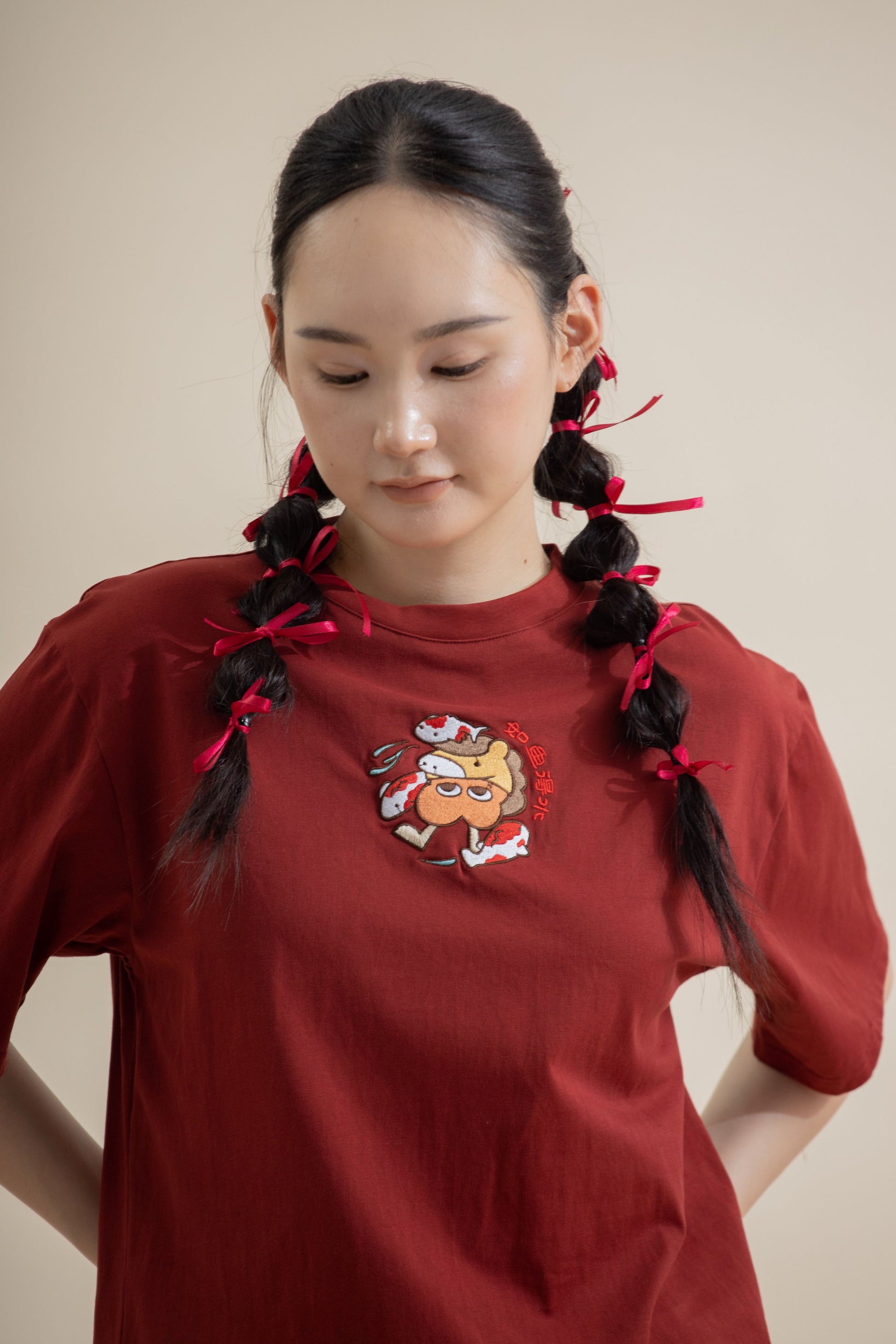 Make a statement with this oversized maroon tee from LULU, featuring a charming embroidery of Lulu in a horsehead costume surrounded by playful fish and the uplifting phrase “如鱼得水”. Crafted from 100% soft cotton, it offers a relaxed fit and all-day comfort, perfect for pairing with jeans, shorts, or skirts. A fun, whimsical tee that blends cultural charm with casual style.