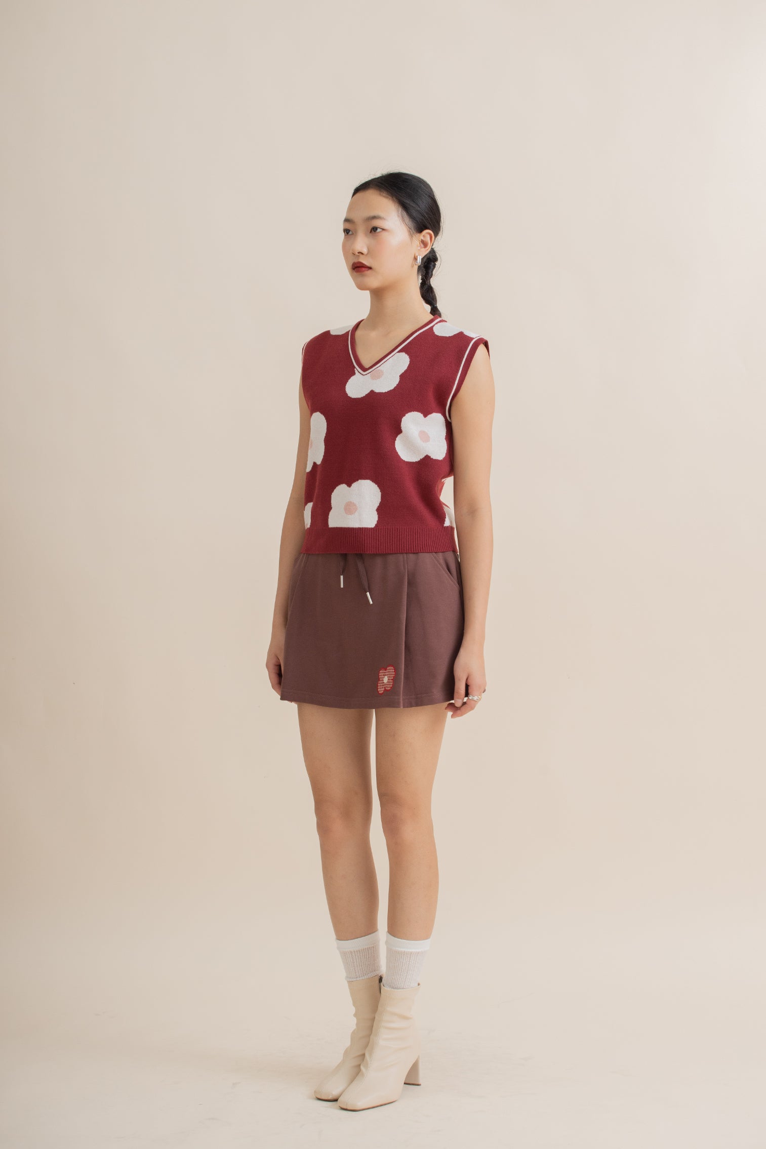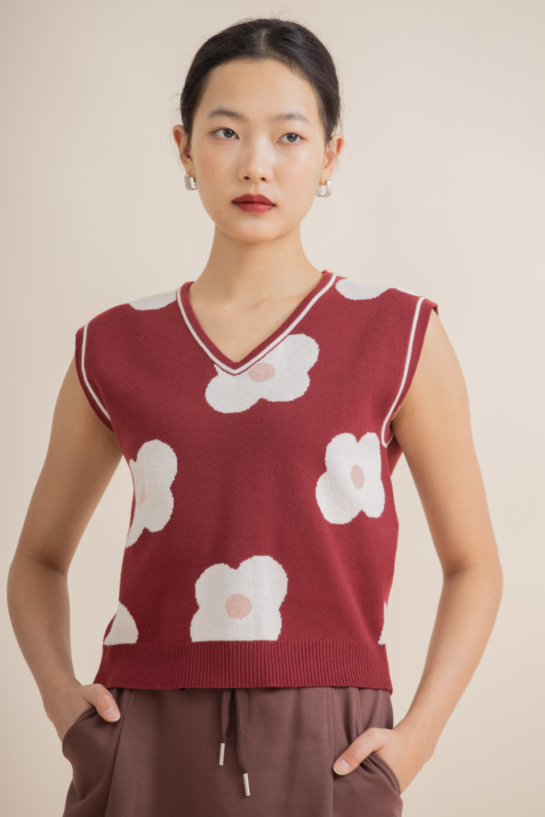 The LULU Blooming Knitted Vest is crafted from 90% Recycled Polyester and 10% Nylon, using GRS-certified eco-friendly fabric. This sleeveless V-neck knit vest features delicate pink floral patterns, bringing a youthful and lively charm. Designed for versatility, it can be worn alone or layered to create different looks. The fabric is soft, stretchy, and breathable, ensuring all-day comfort.