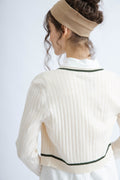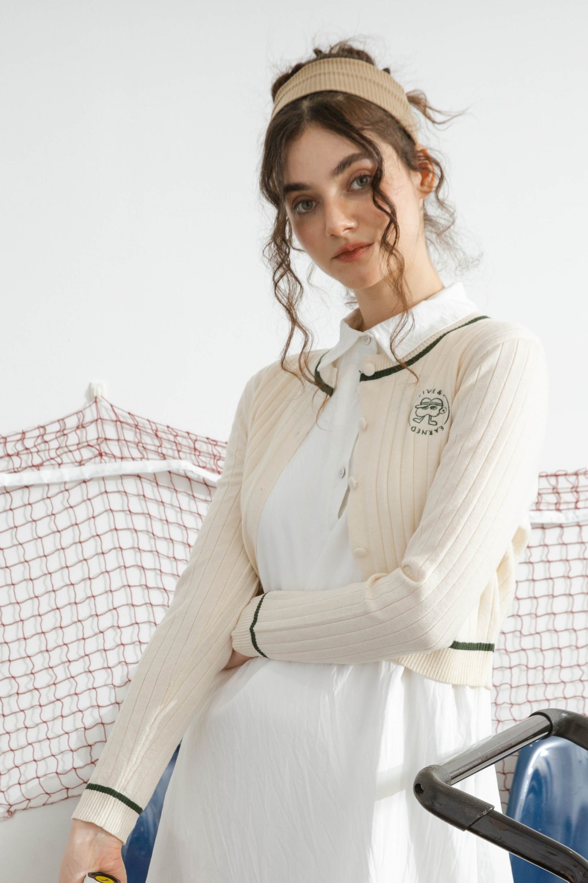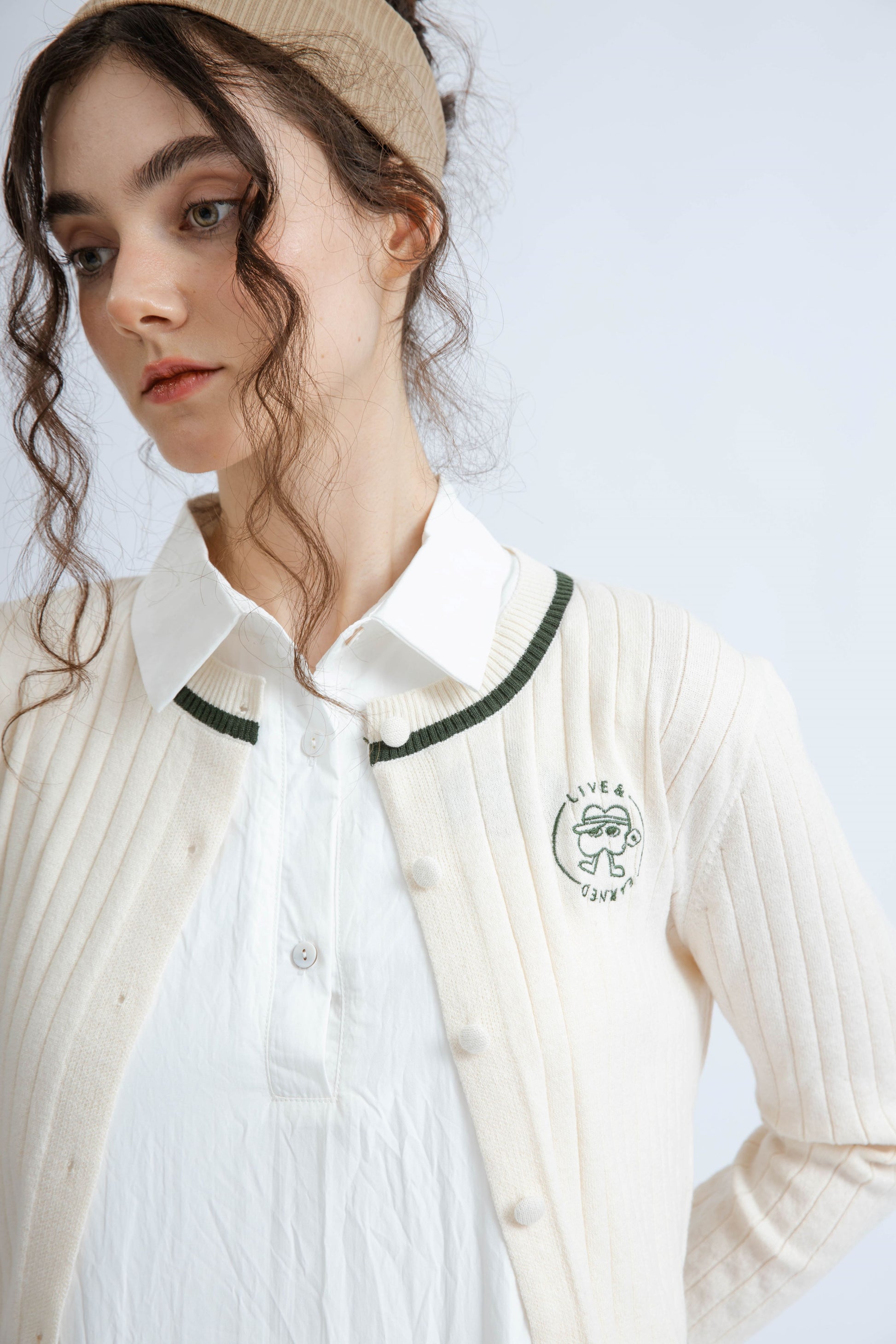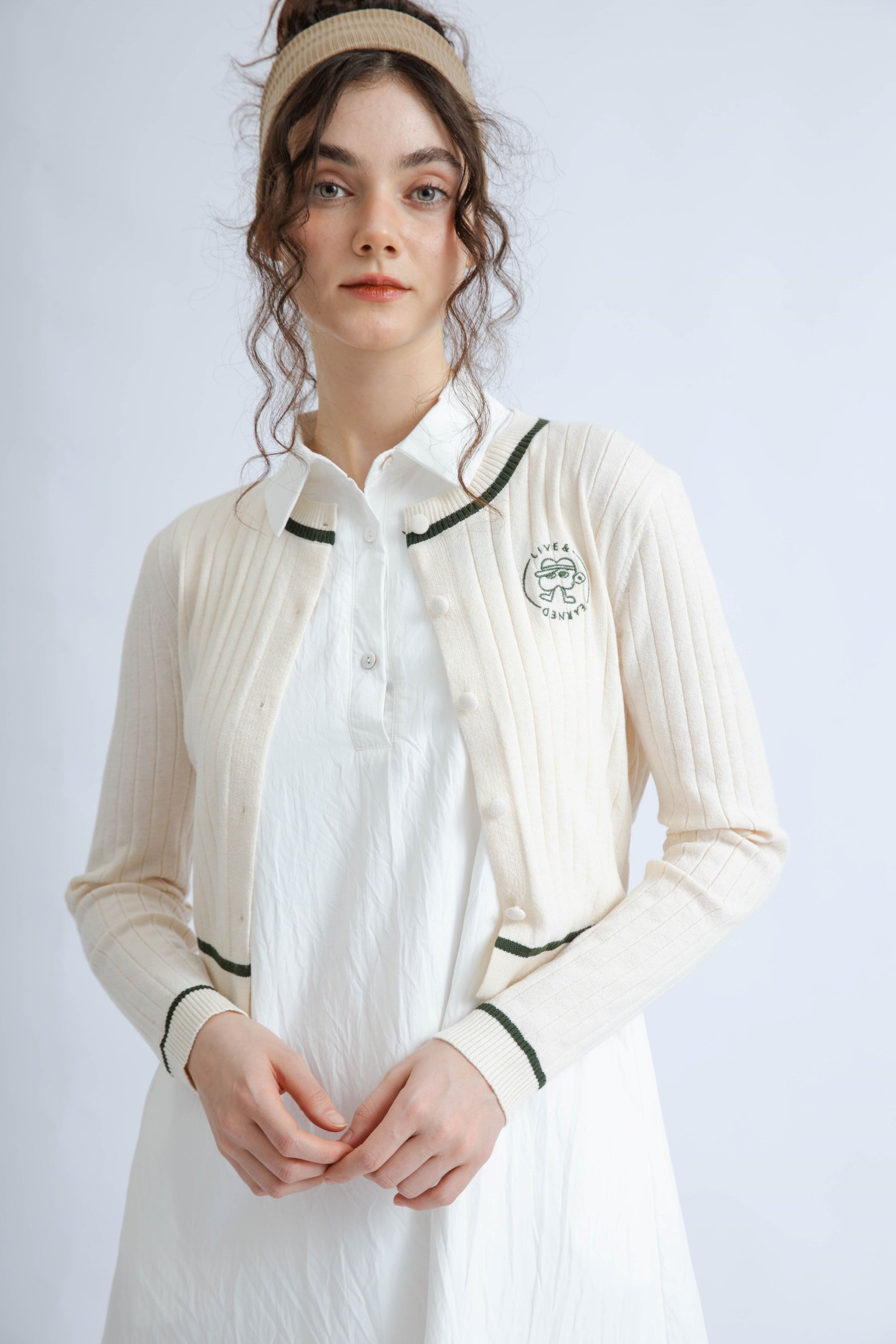 Soft, playful, and perfectly detailed — this Contrast Trim Knit Cardigan adds charm to your everyday layering. Made from 90% recycled polyester and 10% nylon, it offers a cozy yet sustainable touch you’ll feel good about. In a warm beige knit, it’s framed with a fresh pop of green outlining the edges for a sweet contrast that stands out. A small, cute embroidery at the front adds a whimsical touch of personality, making this cardigan as fun as it is cozy.