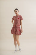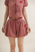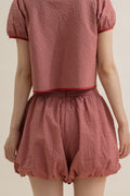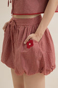 Sweet and playful with a touch of nostalgia — these puffy shorts feature a charming red plaid pattern, complete with a ribbon tie at the waist and handy side pockets. Made from a soft 65% Cotton,35% Polyester blend, they offer a lightweight, breathable feel and hold their shape beautifully — perfect for pairing with the matching LULU top.