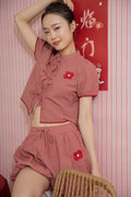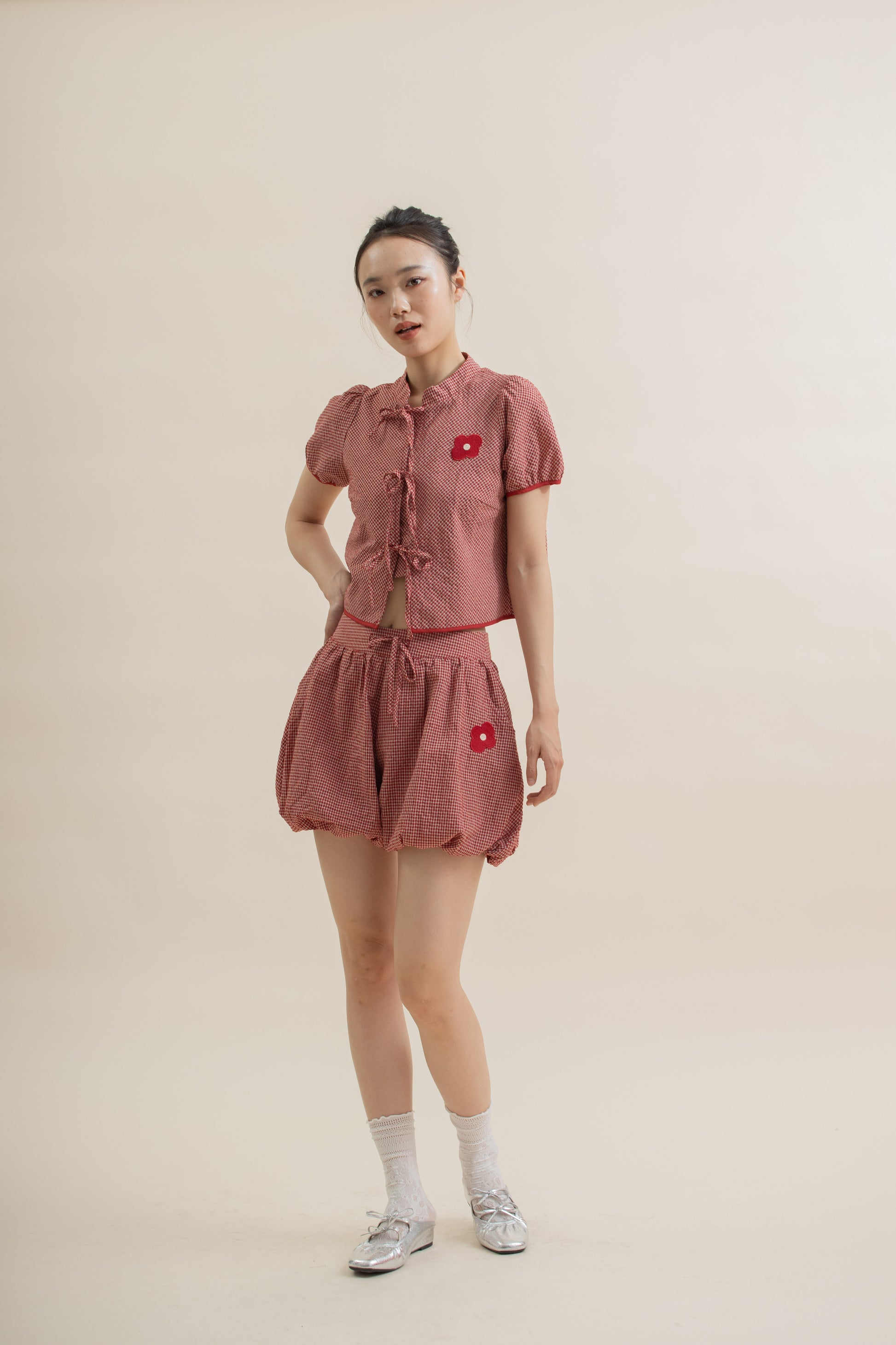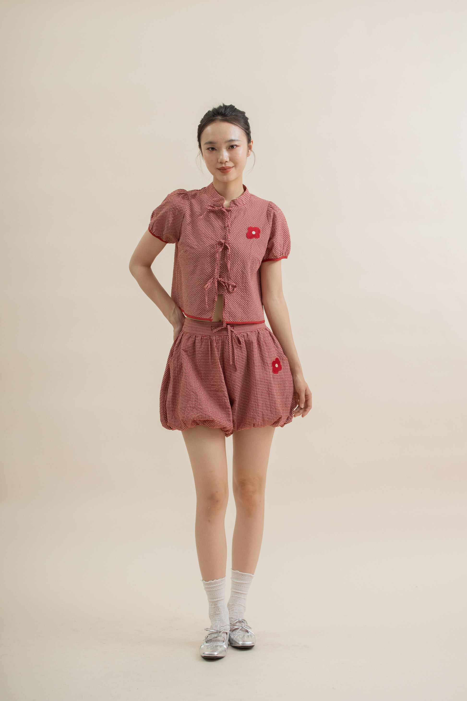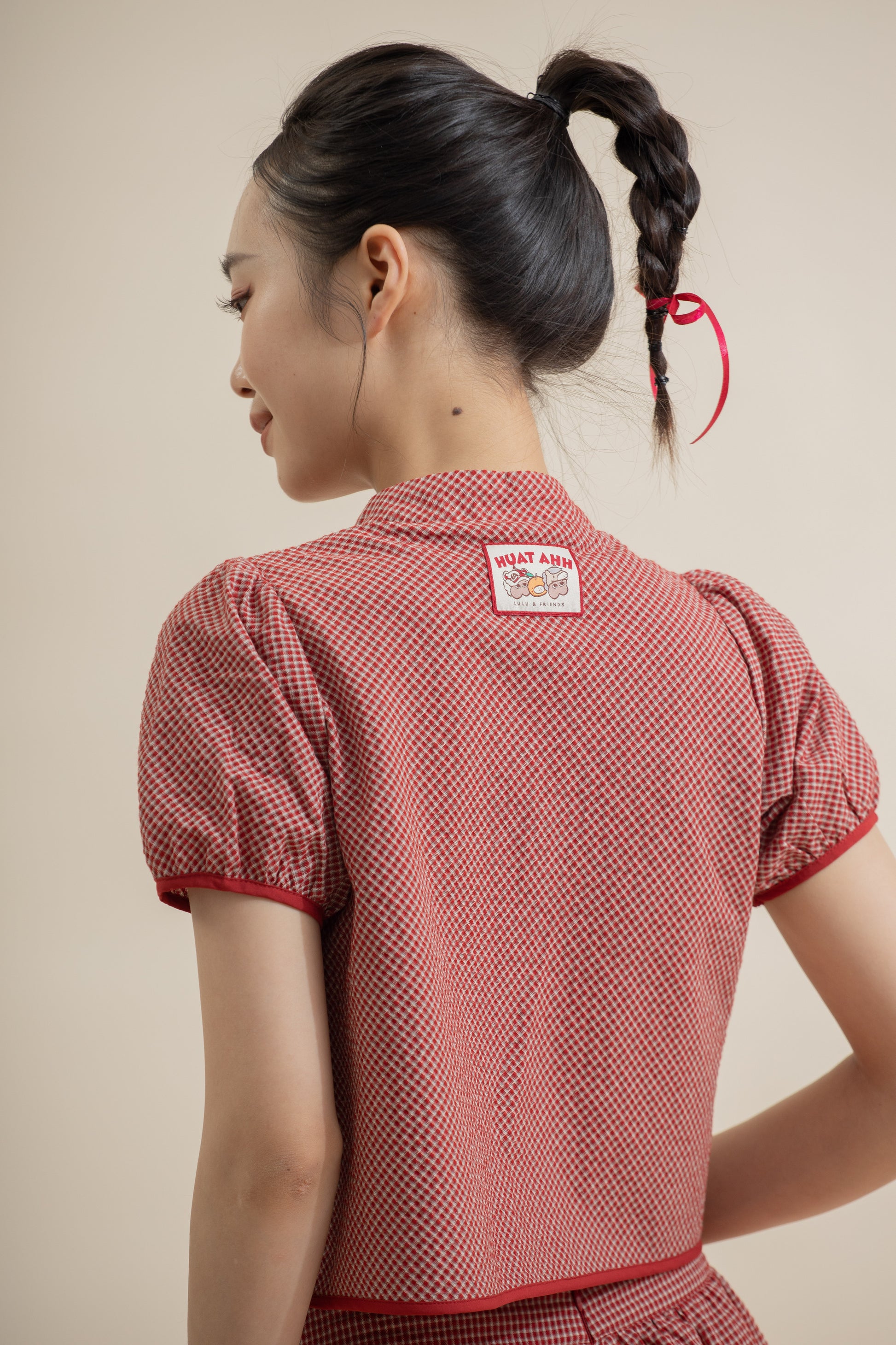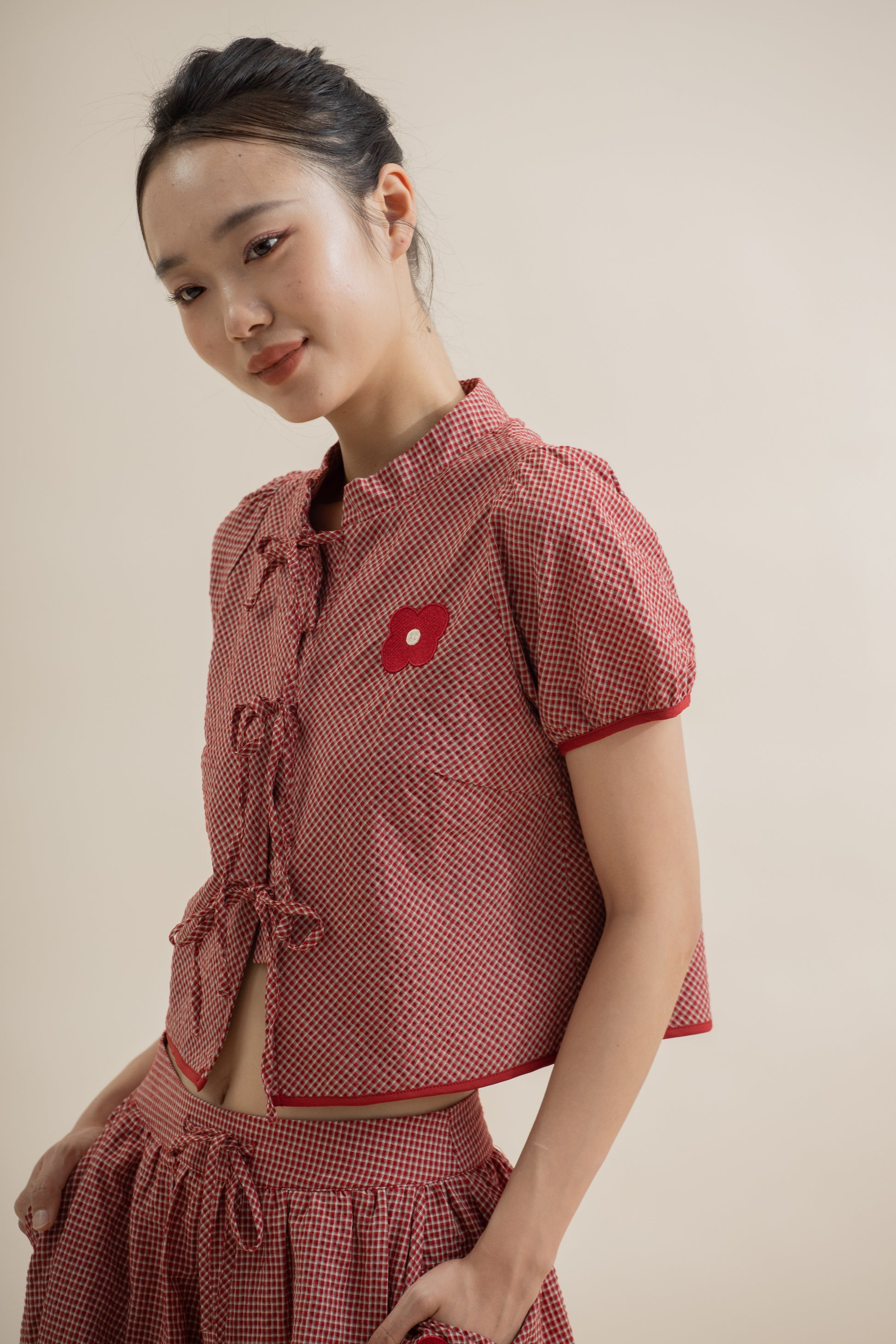 A playful blend of classic charm and modern ease — this red plaid top features a delicate ribbon tie beneath a mandarin collar, adding a soft feminine touch to its structured shape. Crafted from a breathable 65% Cotton,35% Polyester blend, it feels light, comfortable, and perfect for both casual days and festive gatherings.