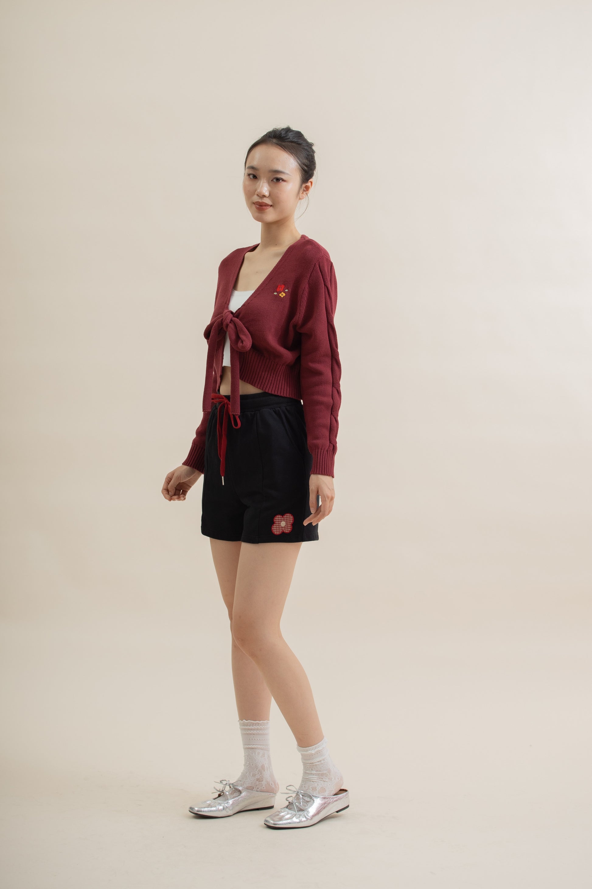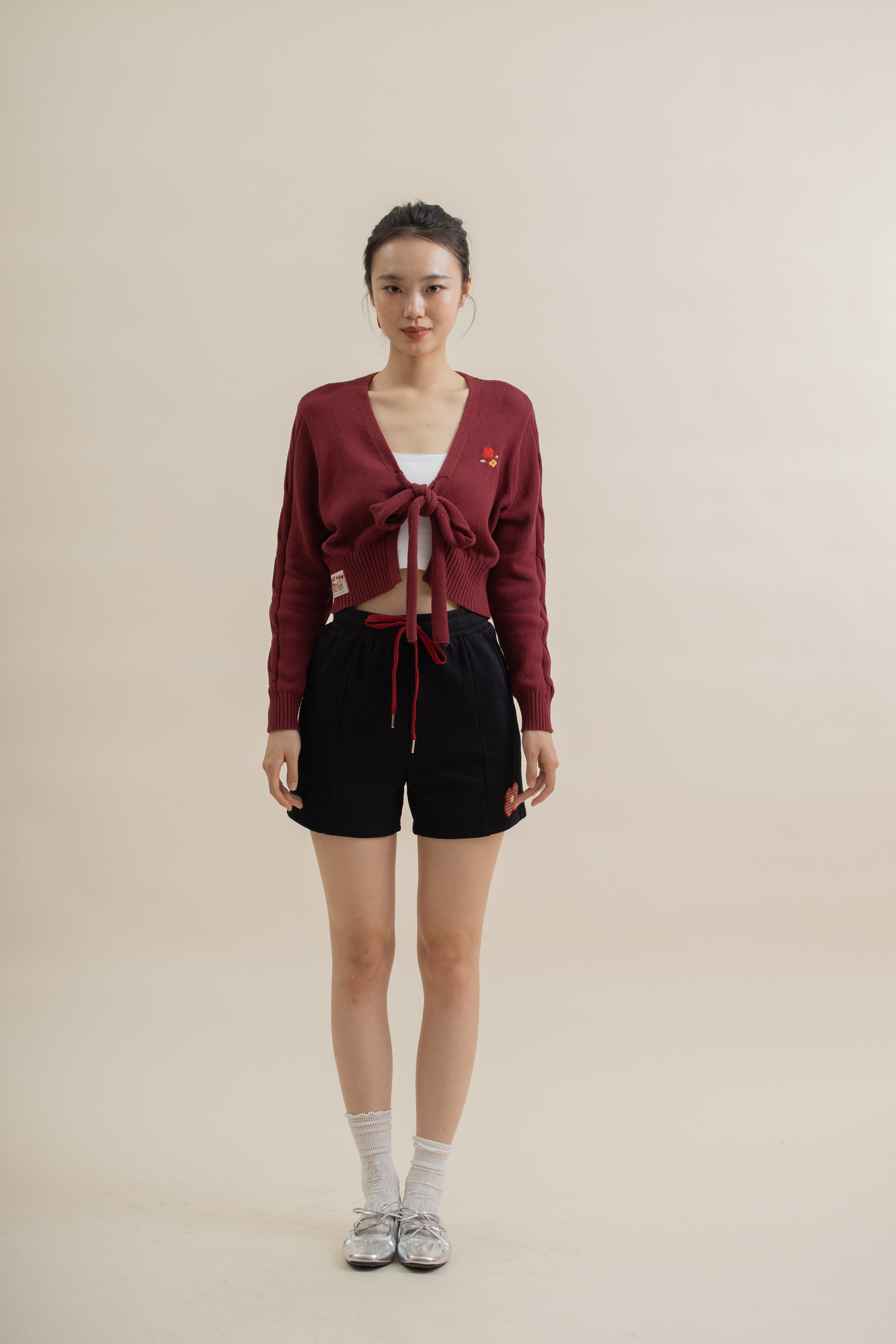 Sweet and delicate — this 100% cotton cardigan features a ribbon tie front, dainty floral embroidery at the chest, and twisted braid knit details along the sleeves. Lightweight yet cozy, it’s the perfect layering piece for adding a touch of softness and charm to your everyday look.