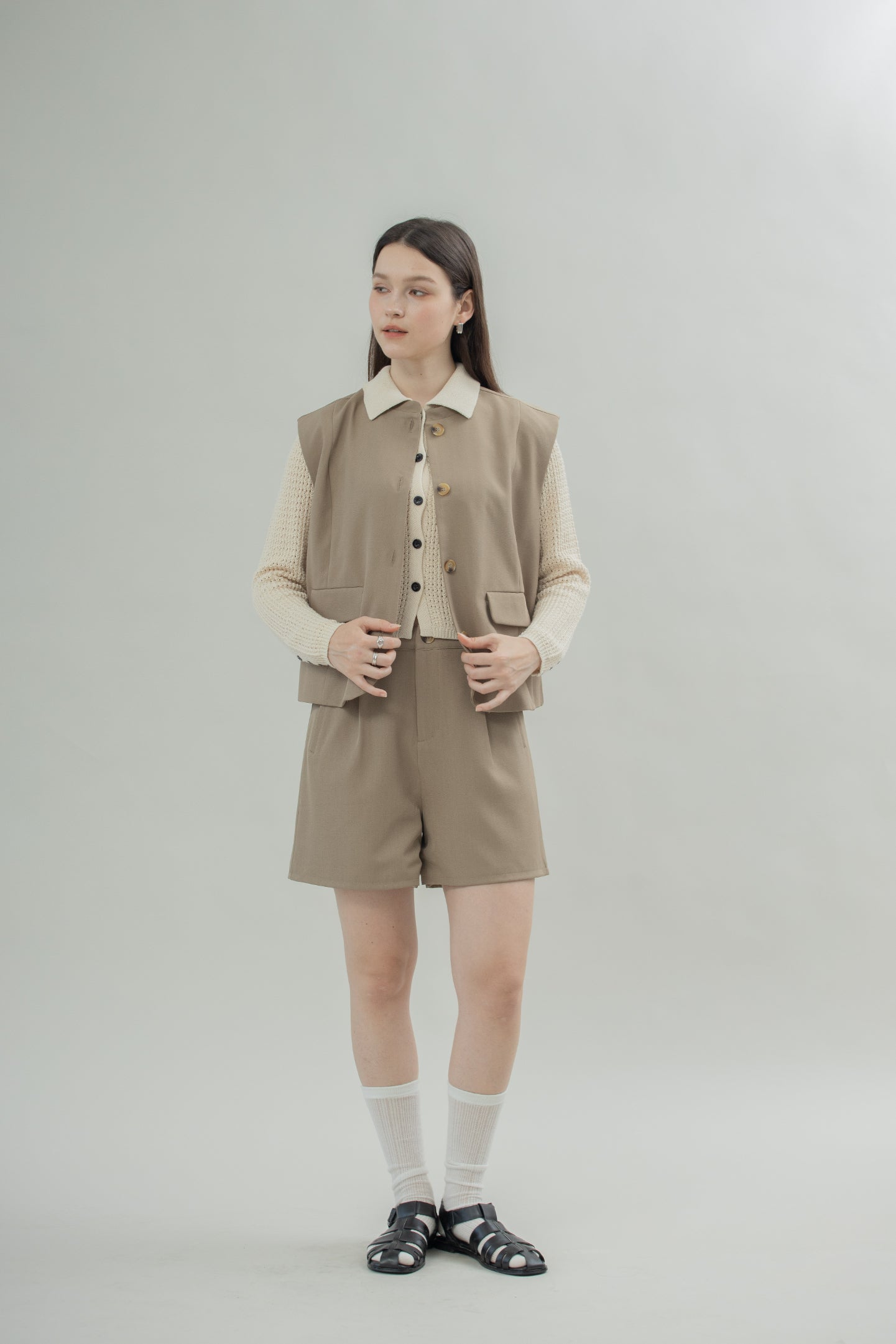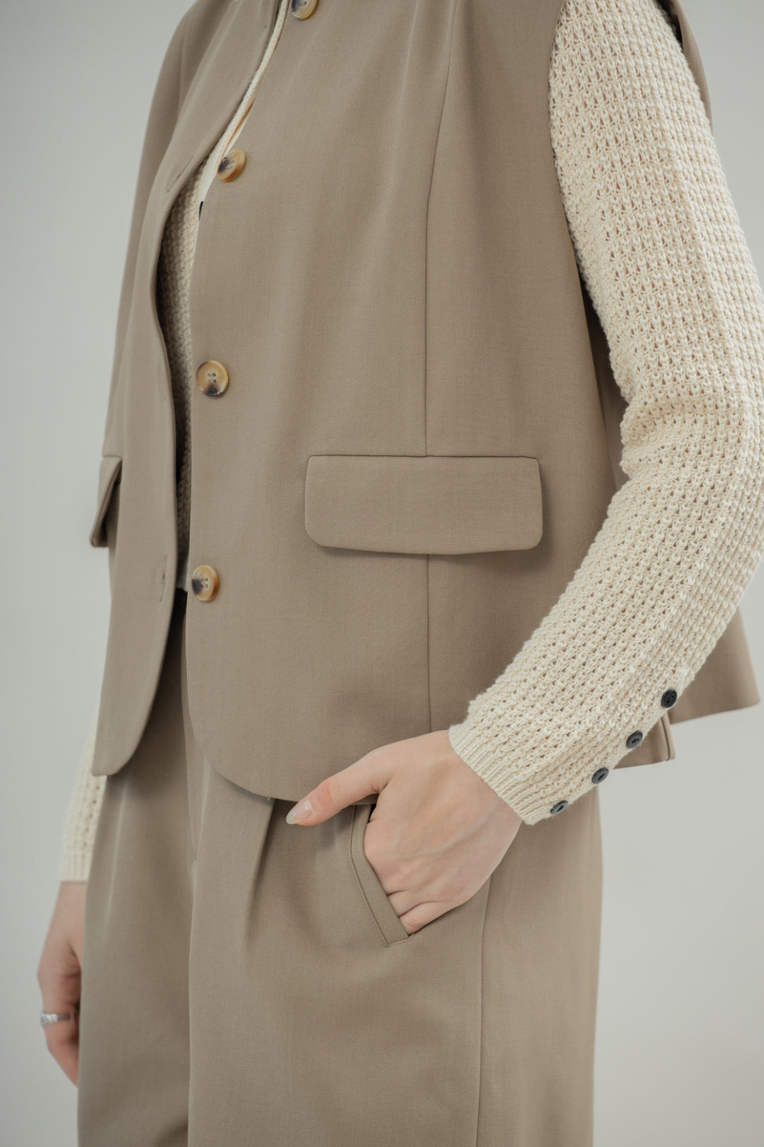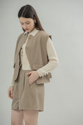 This round neck vest features two functional front pockets that add both style and practicality. Designed in versatile khaki and brown, it brings a warm, earthy tone to any outfit.