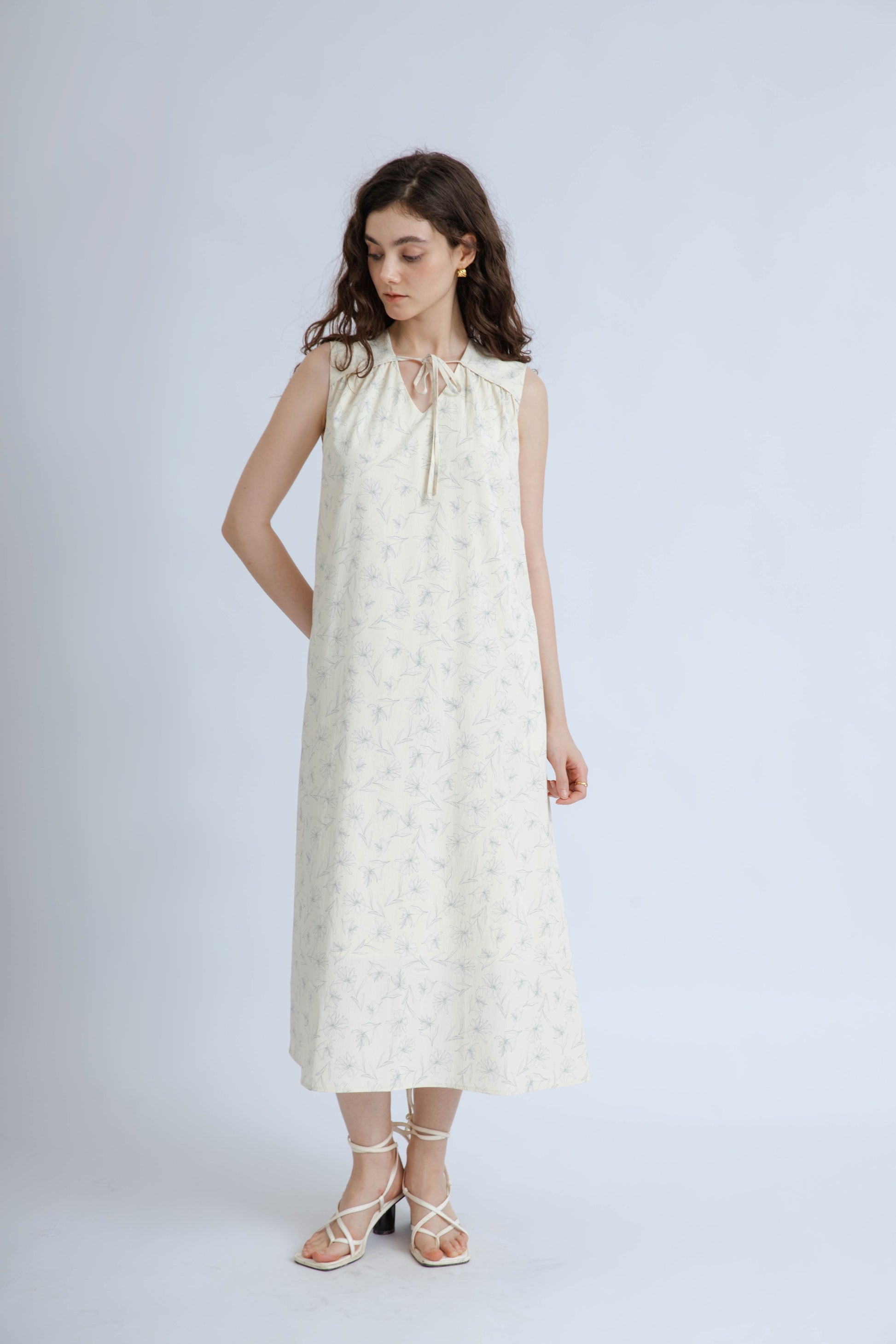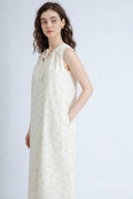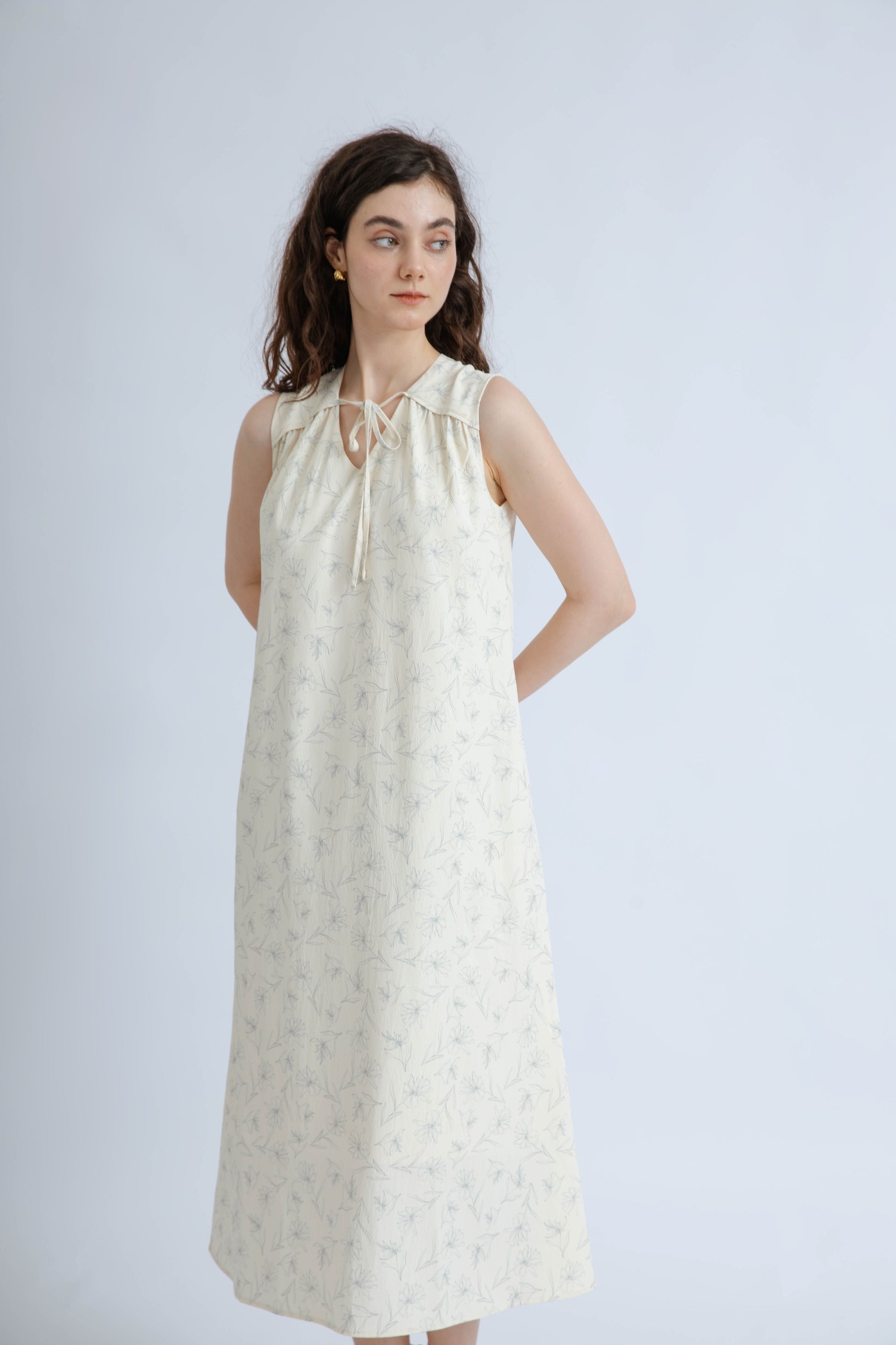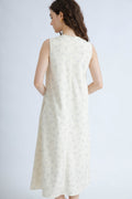 Breeze through the season in effortless elegance with our Floral Dress. Crafted from 100% polyester, this beige maxi dress features a soft, flowing silhouette adorned with delicate blue floral prints for a fresh and feminine look. The sleeveless design and lightweight fabric keep you cool and comfortable, while the full-length cut adds graceful movement and sophistication.