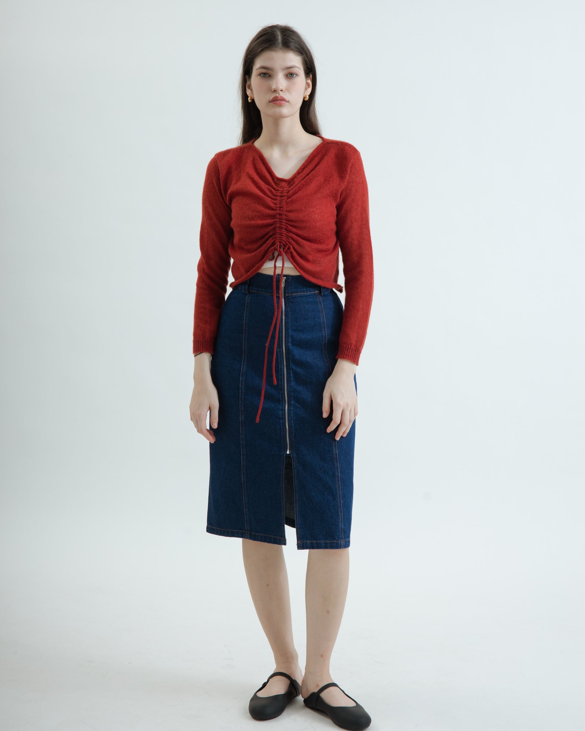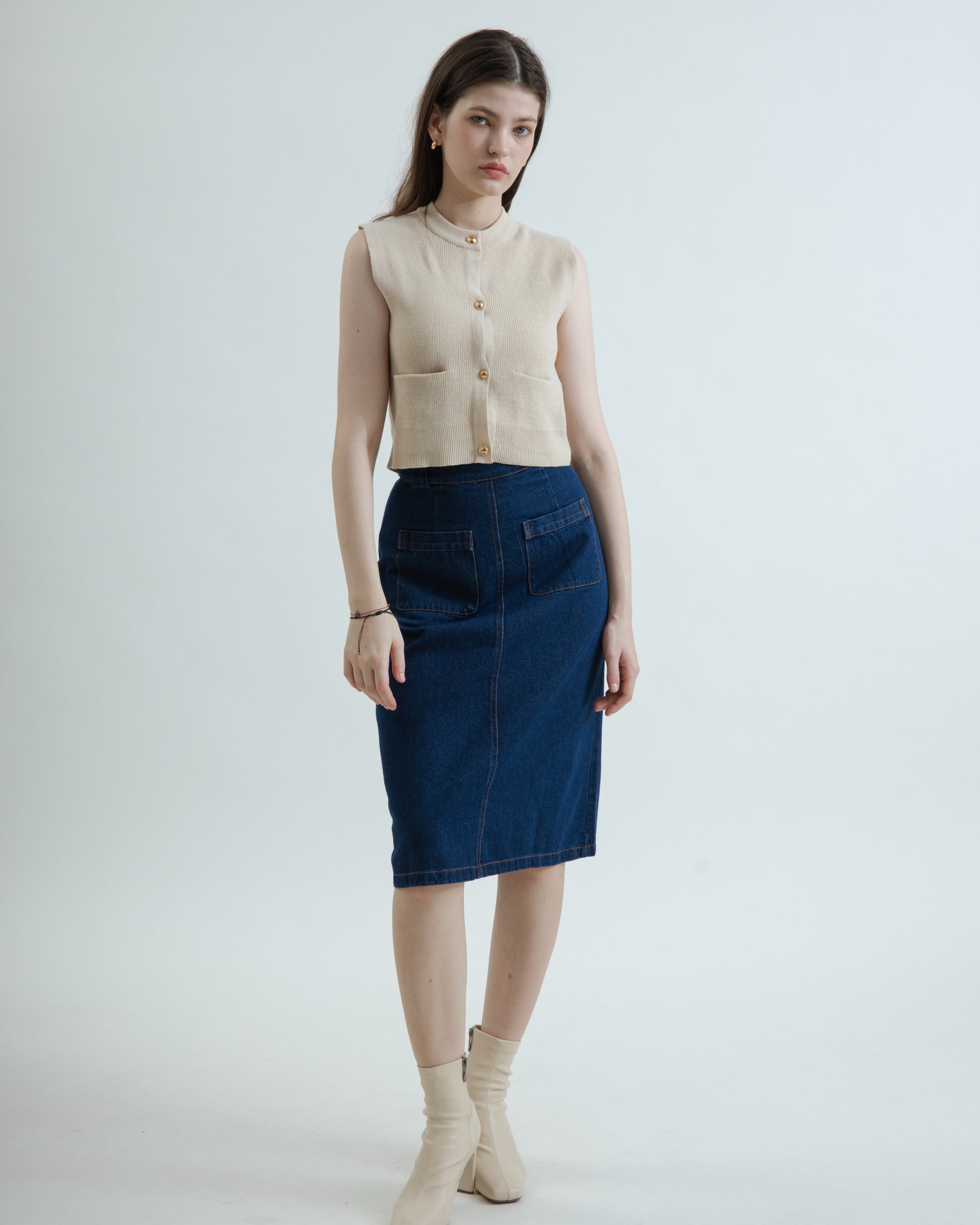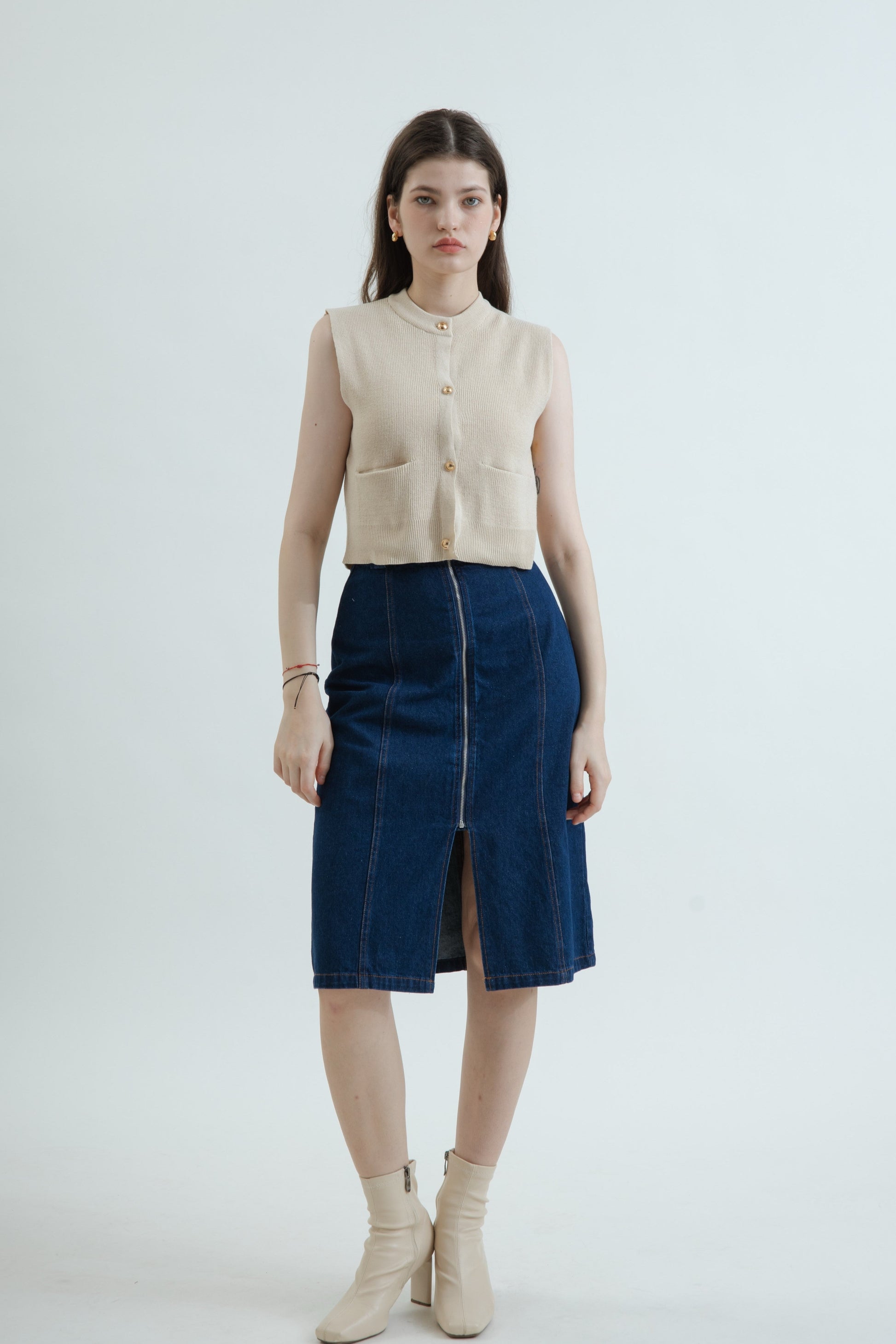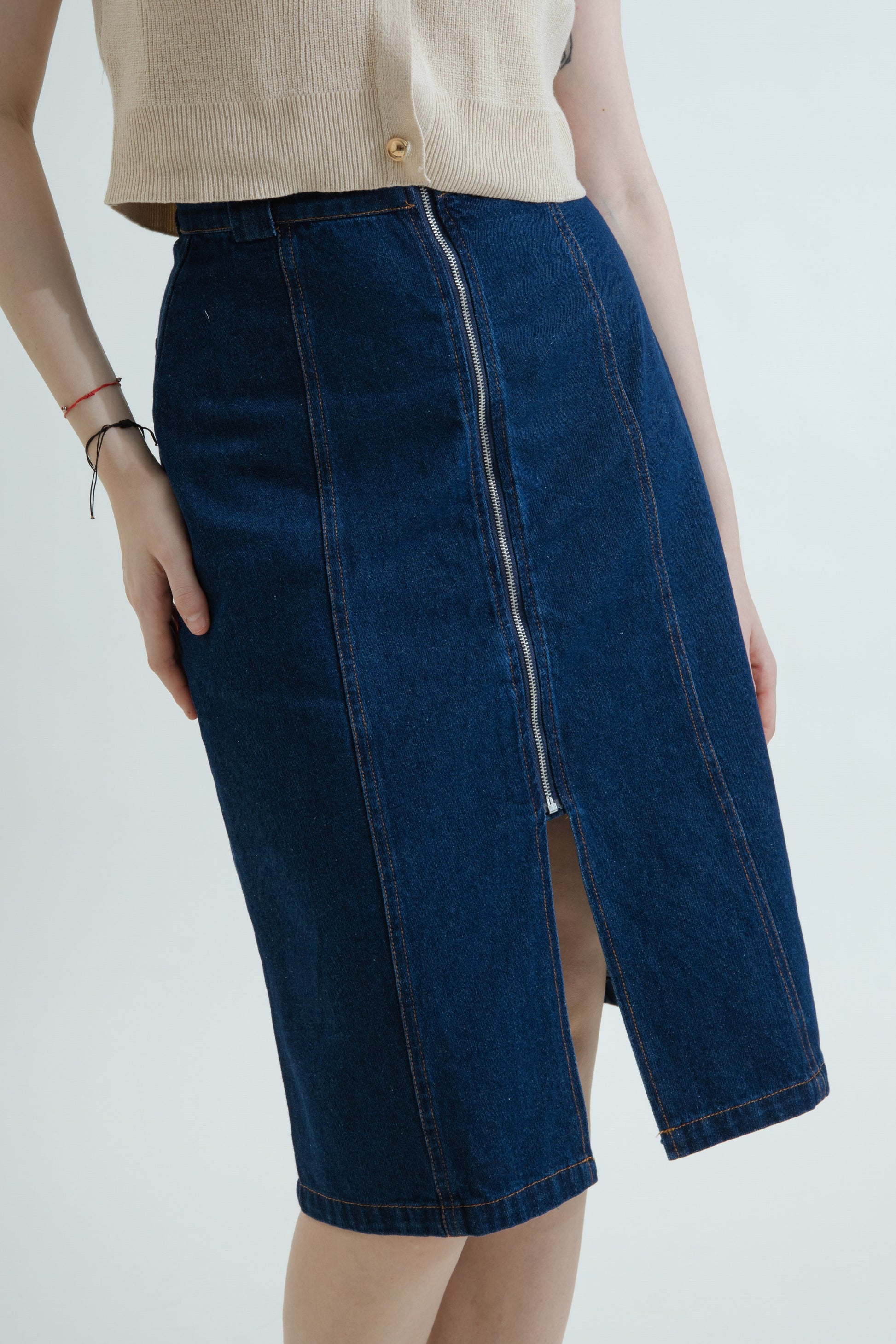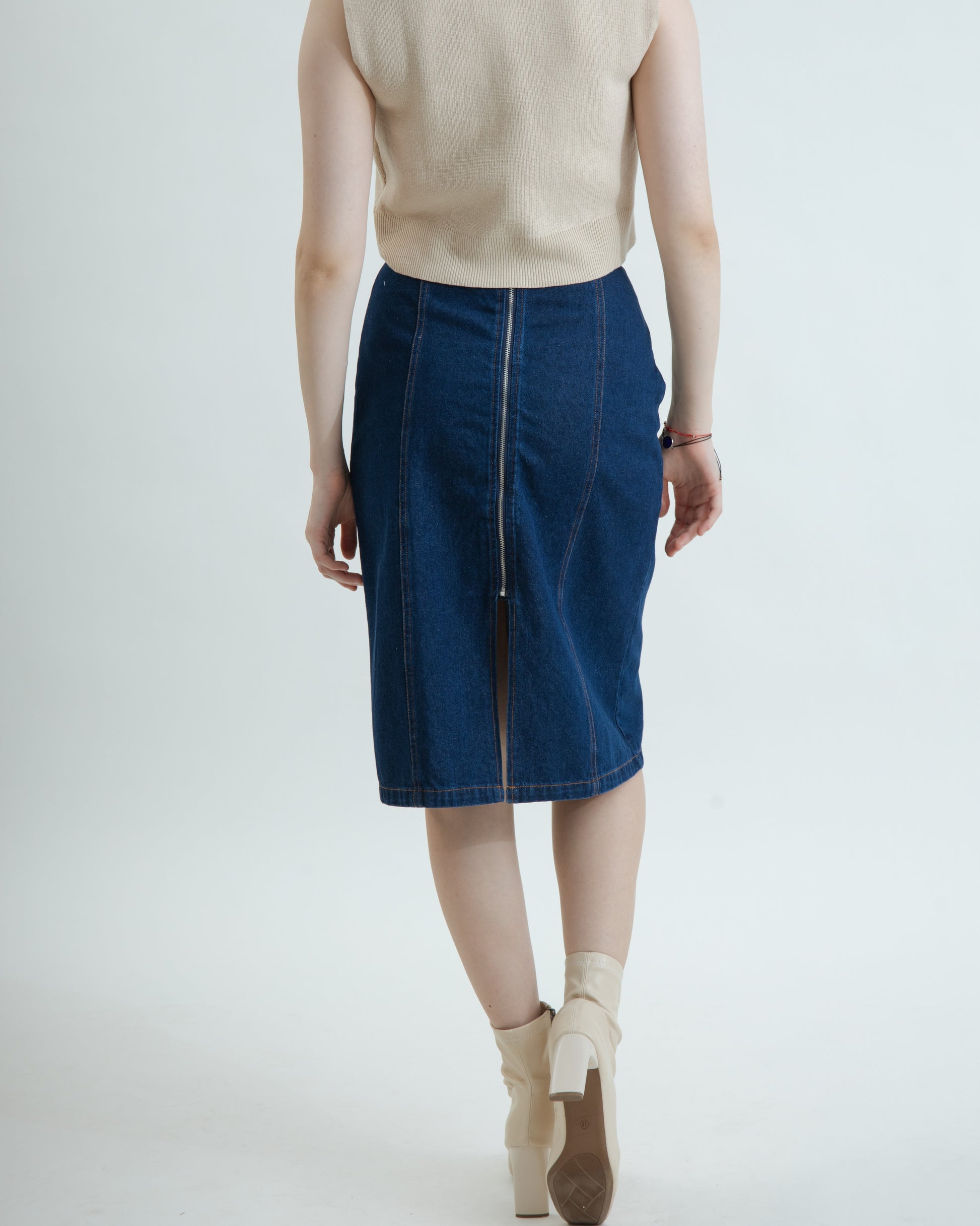Multi-Wear Zipper Denim Skirt, crafted from 100% Cotton, combines a straight-cut silhouette with a center-front zipper detail, adding a stylish and modern touch. Versatile and trendy, this skirt is perfect for creating effortless, everyday looks with a dash of individuality.