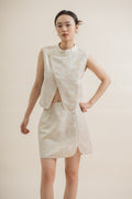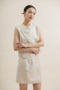 This sleeveless cheongsam top features a soft floral jacquard texture with a modern overlap front design. Crafted from 100% polyester, it drapes smoothly with a subtle sheen that catches the light beautifully.