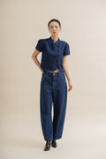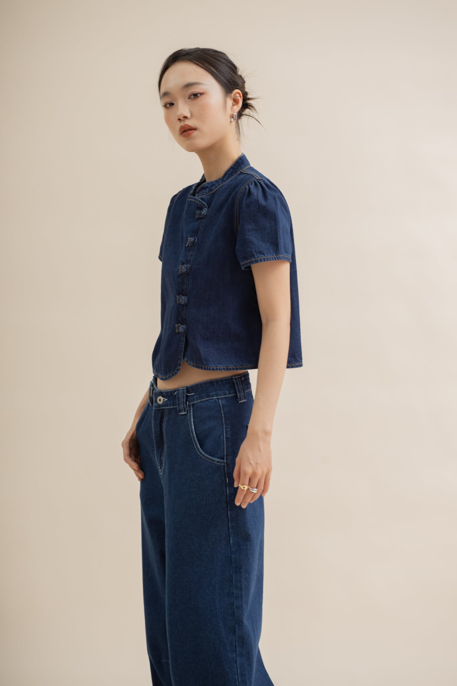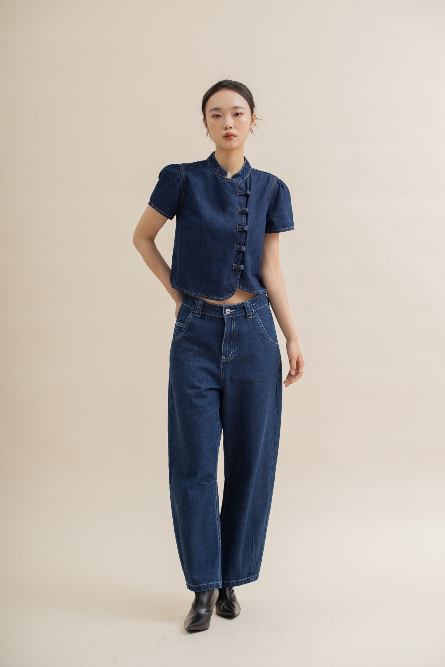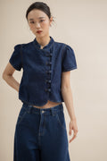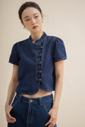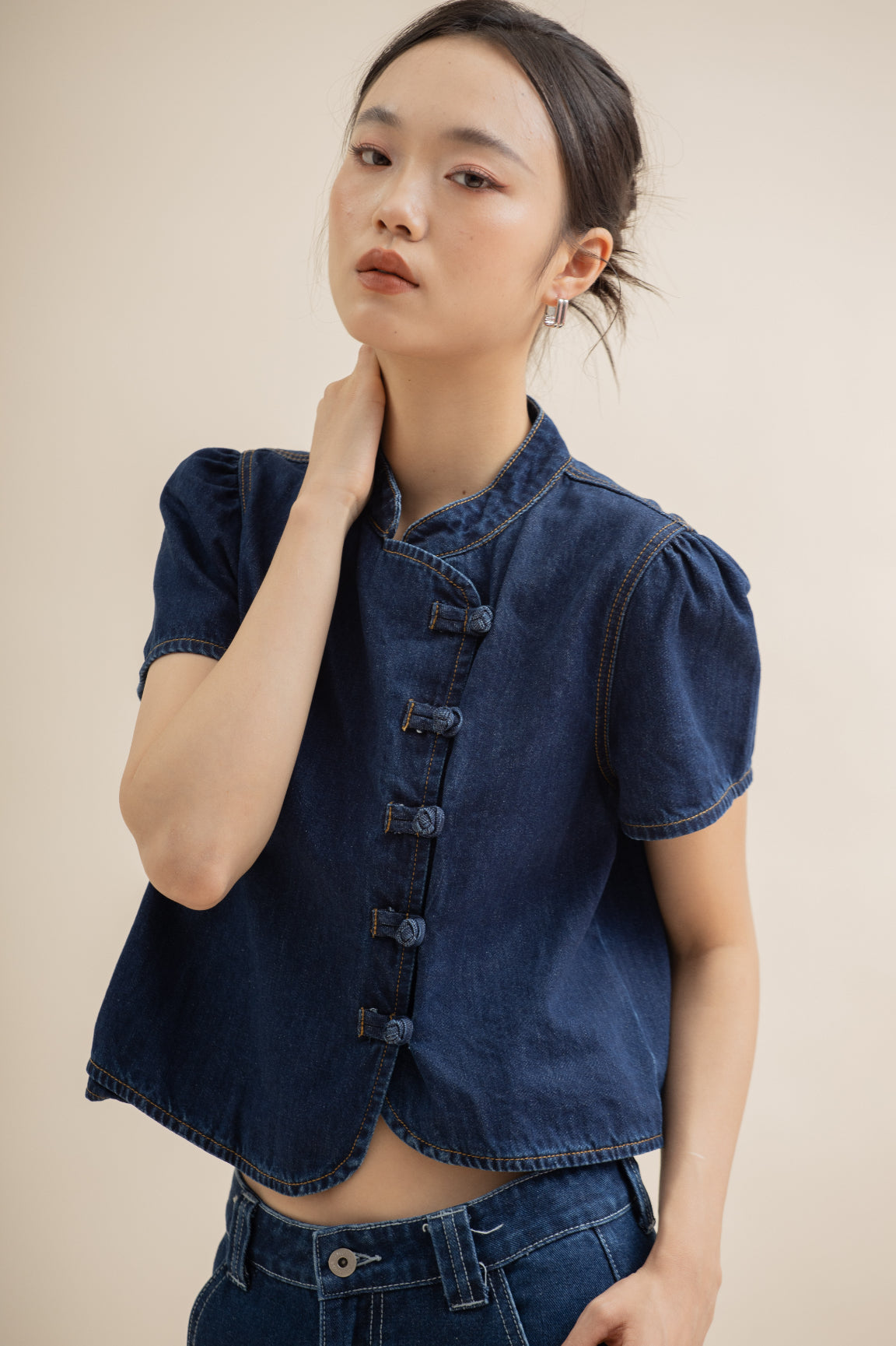 Puffy Sleeve Denim Cheongsam Top (Dark Denim)