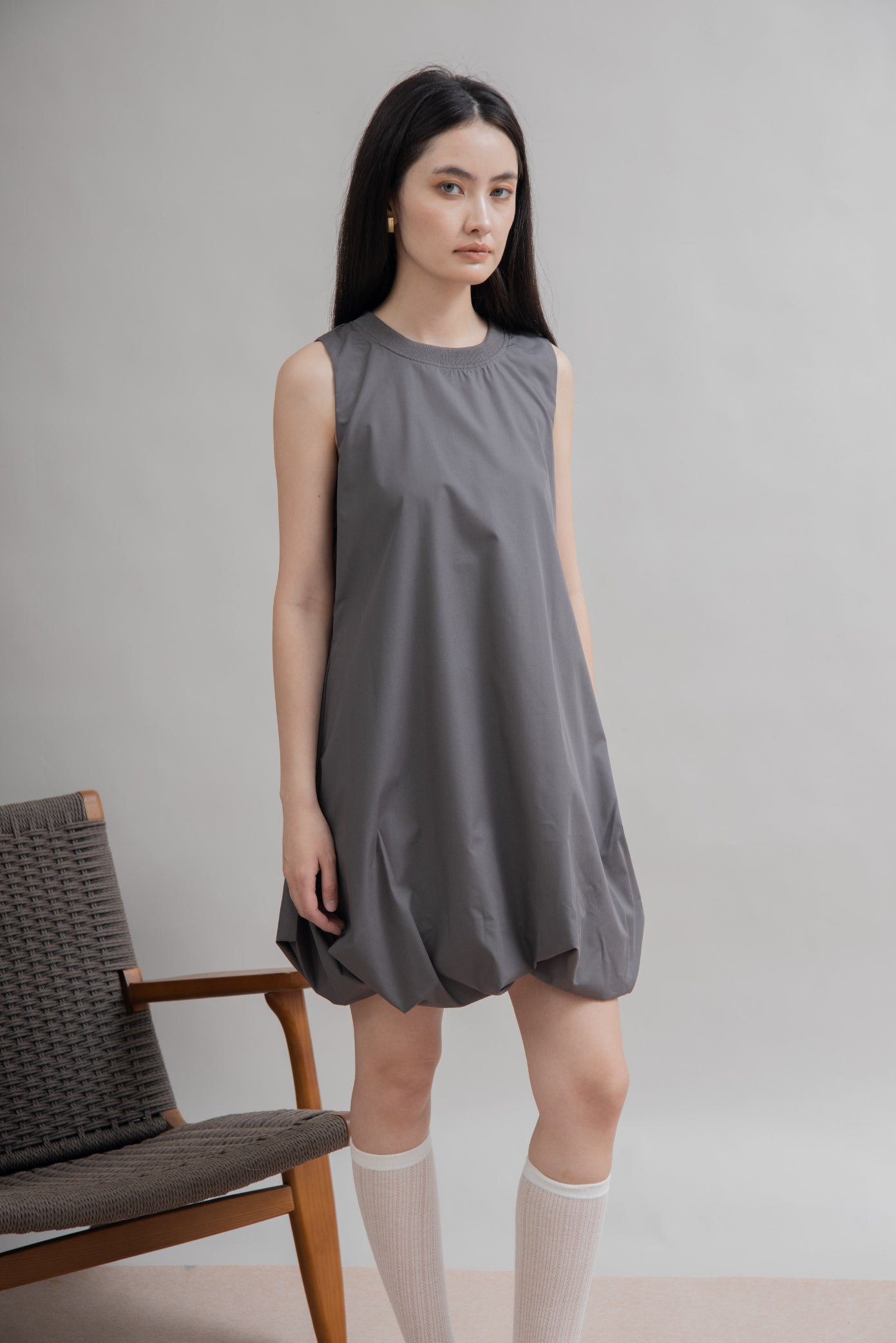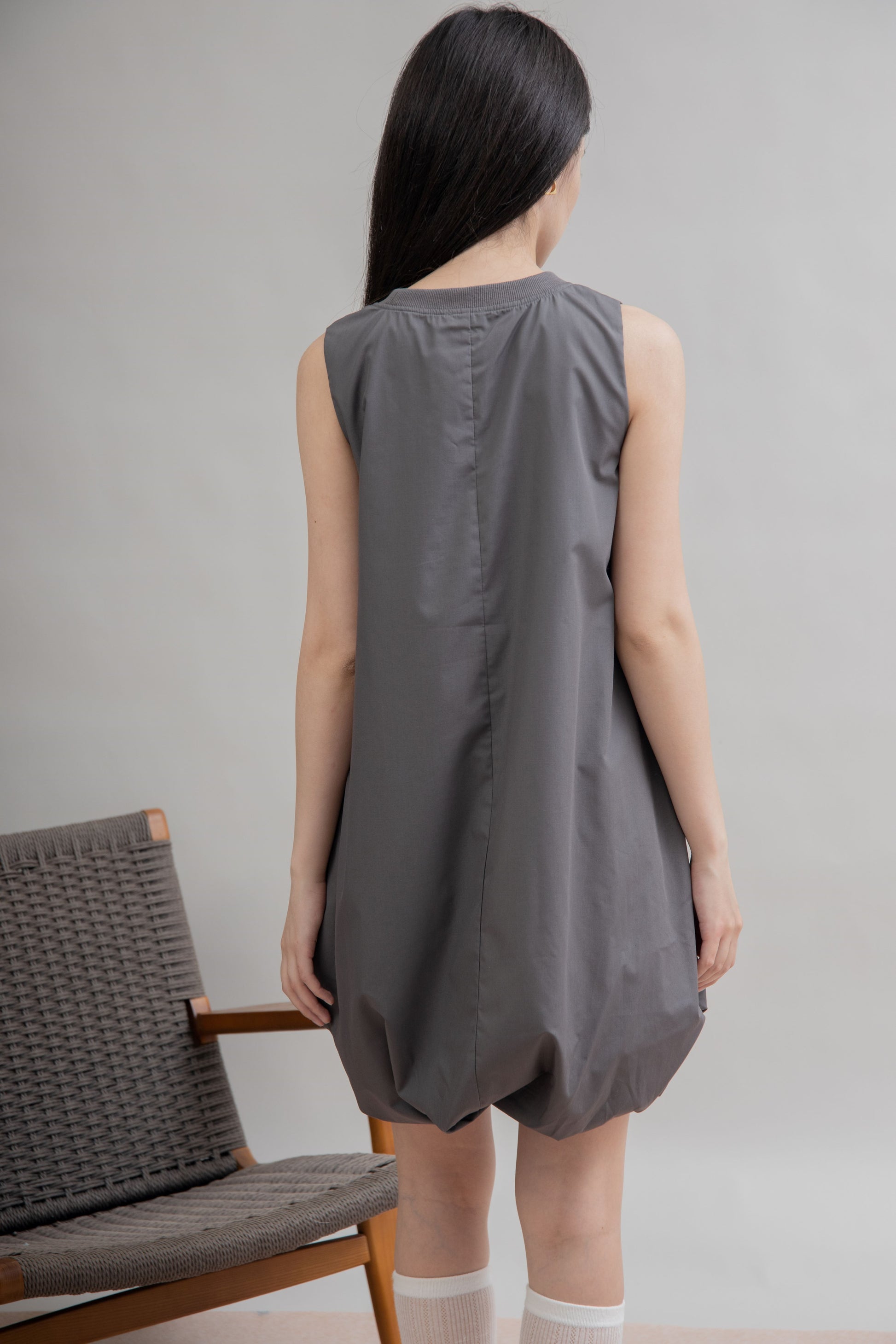 Playful volume meets effortless comfort. This sleeveless short dress features a distinctive puffy balloon hem, creating a soft and sculptural silhouette that flatters with ease. Crafted from a breathable blend of 35% Cotton and 65% Tencel, it drapes beautifully while keeping you cool and comfortable.