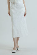 A refined midi skirt crafted from 100% polyester with a subtle textured pattern. Designed with fabric toggle details and a front slit that offers ease of movement and a touch of allure. Tailored to flatter the form while keeping a graceful, polished finish — perfect for both day and evening wear.
