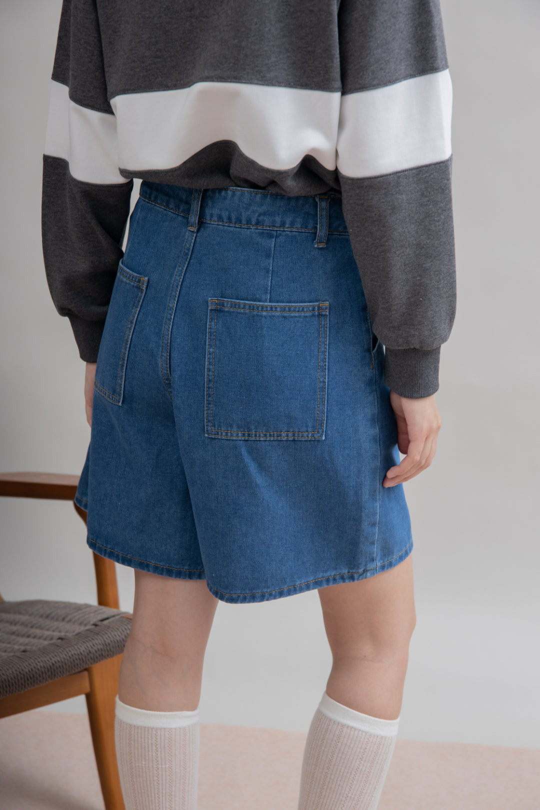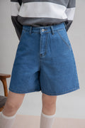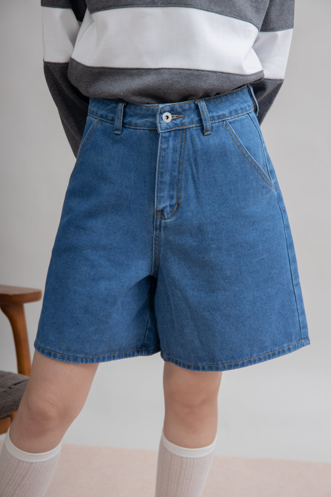 A pair of medium wash mid-length denim shorts designed for timeless everyday wear. Crafted from 73.3% Cotton, 11.7% Polyester, and 15% Viscose, they offer a soft yet durable feel with a comfortable drape. The classic silhouette makes them easy to pair with casual tops or elevated basics for effortless styling.
