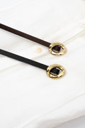 Elevate your outfit with our skinny Belt, the perfect blend of timeless style and understated sophistication. Crafted from high-quality genuine leather, this slim silhouette adds a polished touch to both casual and dressy looks. The distinctive oval-shaped buckle brings a soft, modern edge that complements any ensemble, while the supple leather ensures long-lasting comfort and durability.