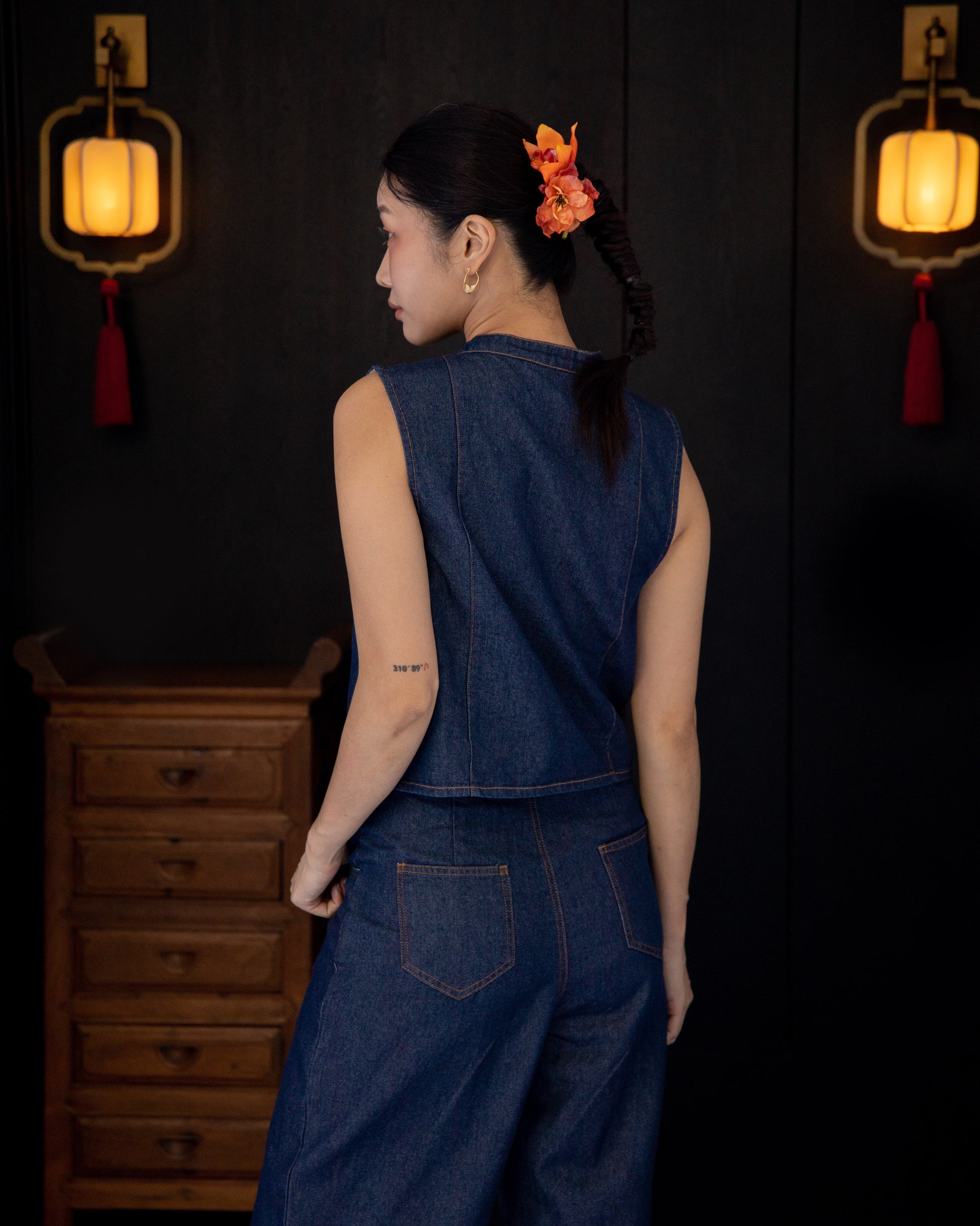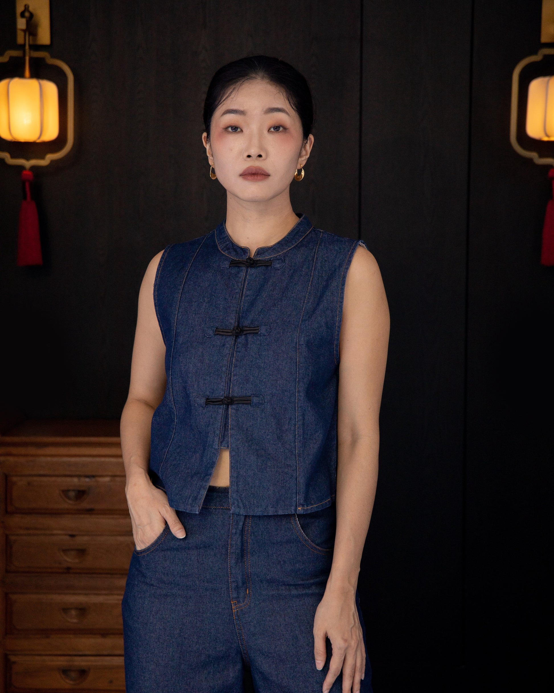 The Sleeveless Cheongsam Denim Top, made from 100% cotton, beautifully blends tradition and modernity. Highlighted by black knot buttons and a sleek, sleeveless design, this top redefines the classic cheongsam style. Its clean lines not only add elegance but also create a flattering fit, making it a chic and versatile wardrobe staple.