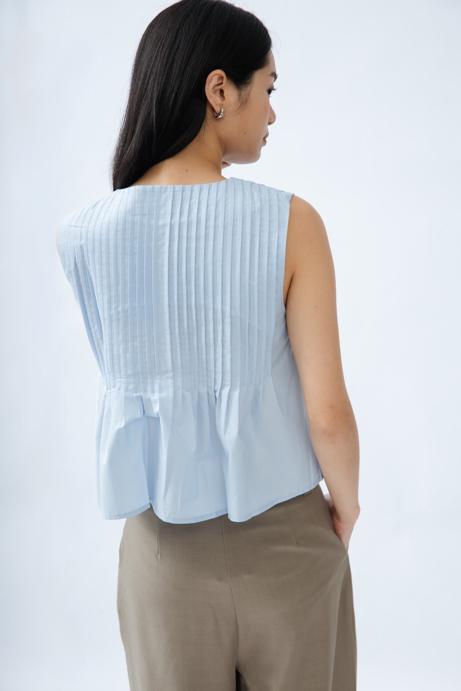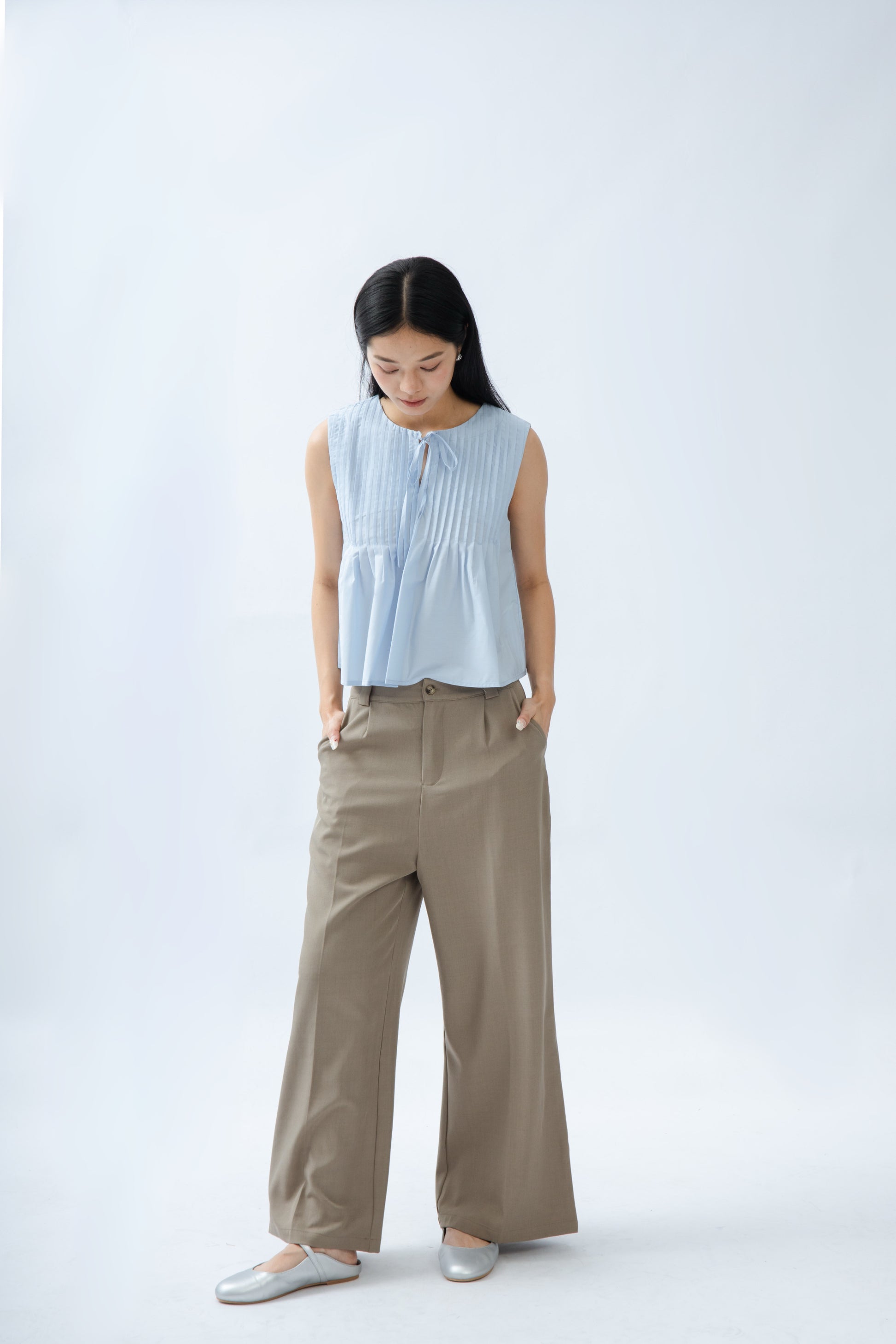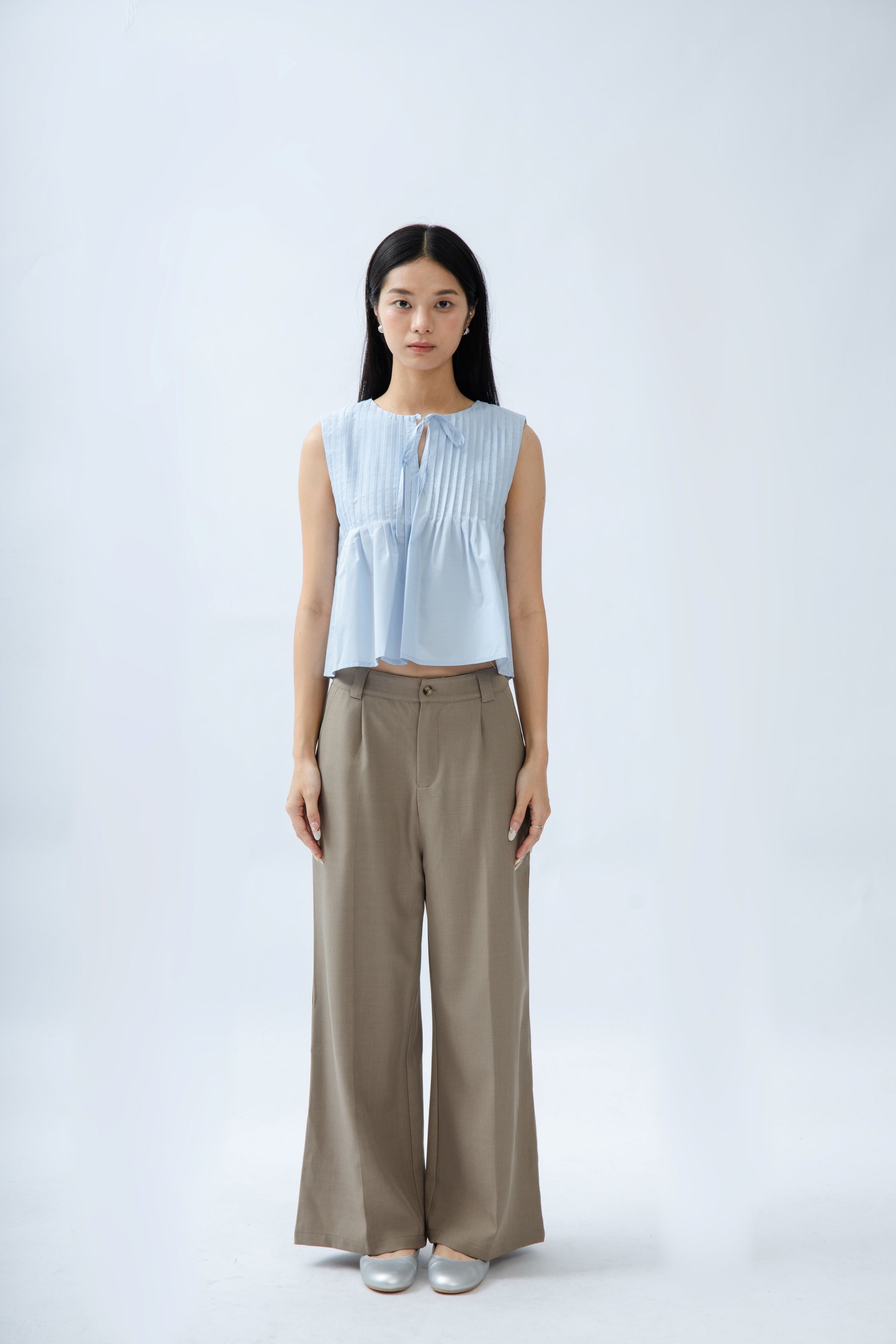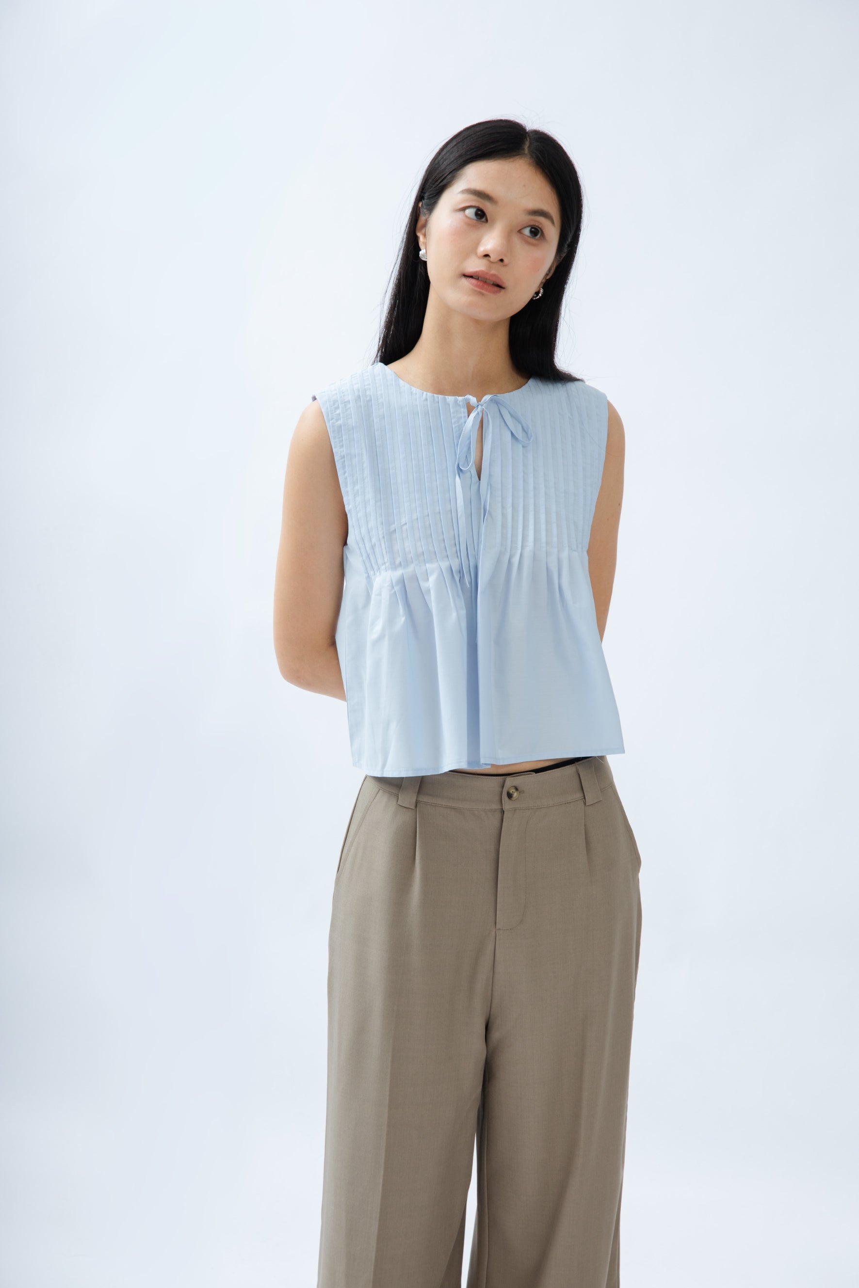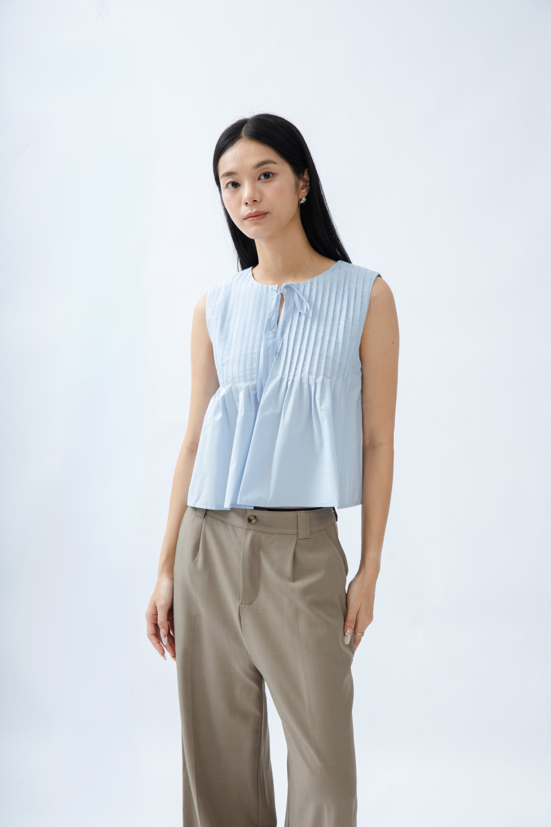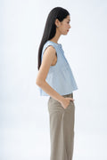 Sleeveless Pintuck Front-Tie Top (Light Blue)