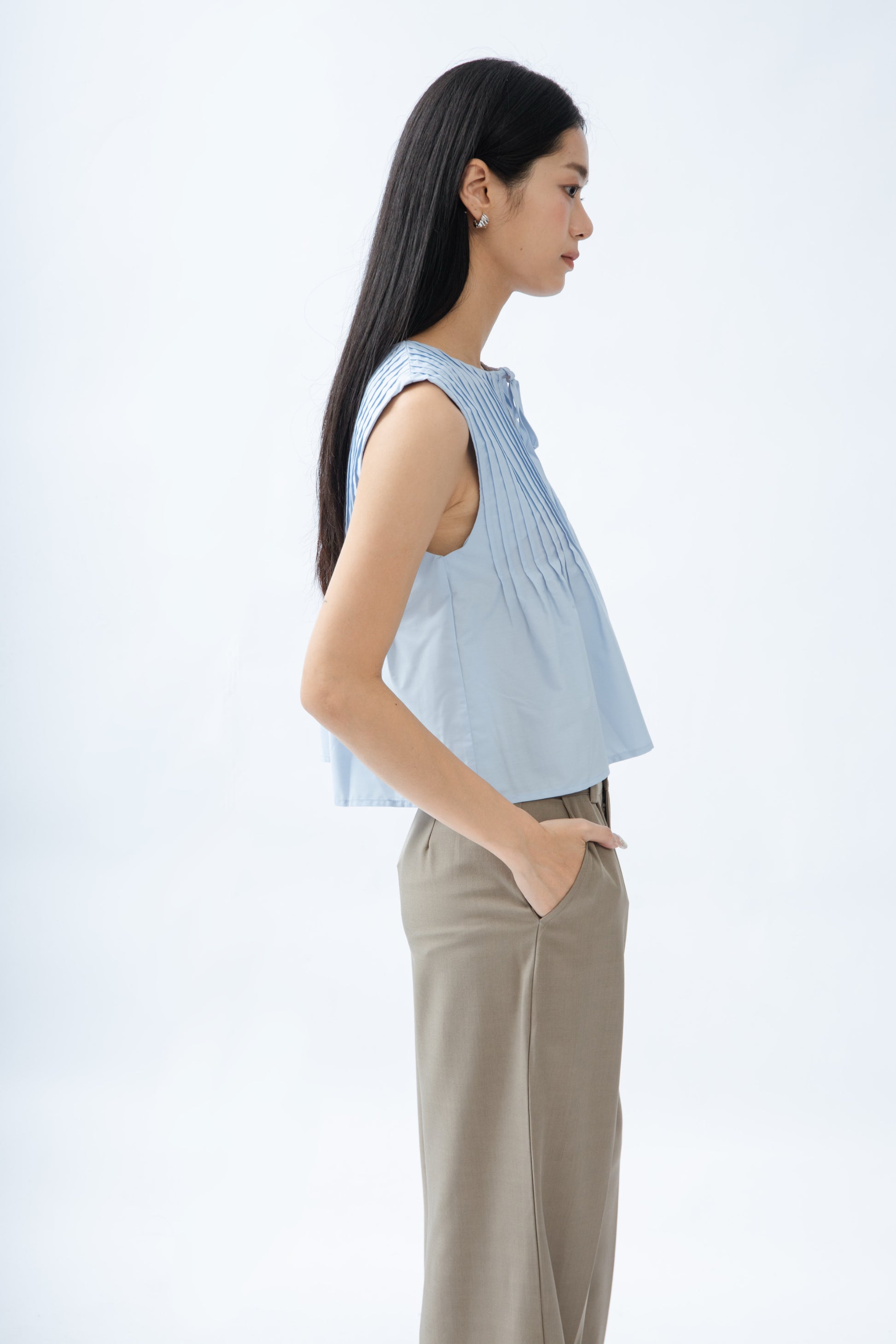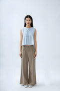 The Sleeveless Pintuck Front-Tie Top, made from a blend of 30% cotton and 70% Tencel, features a stylish round neckline with adjustable drawstrings and refined pintuck pleats, creating a beautifully contoured and modern look.