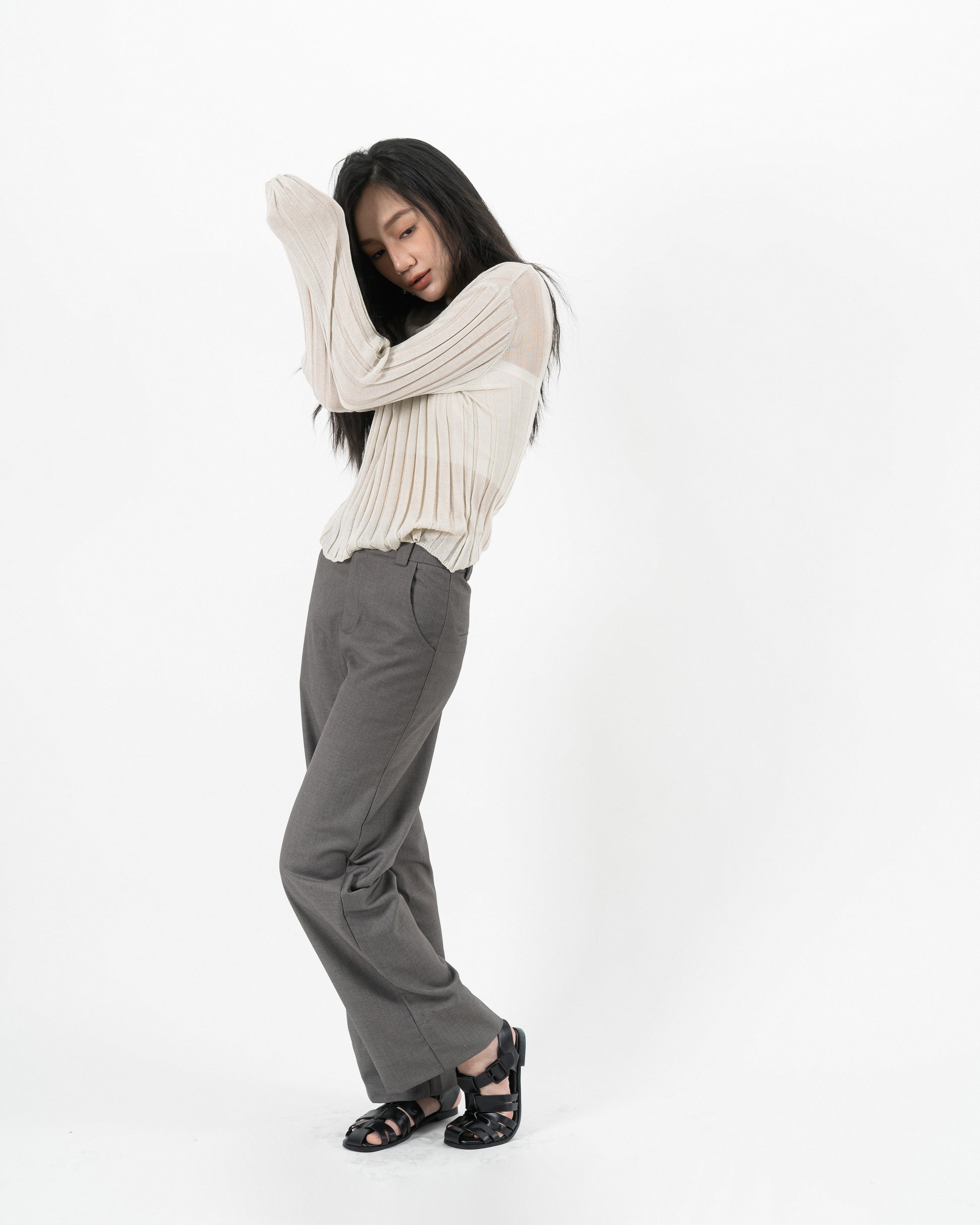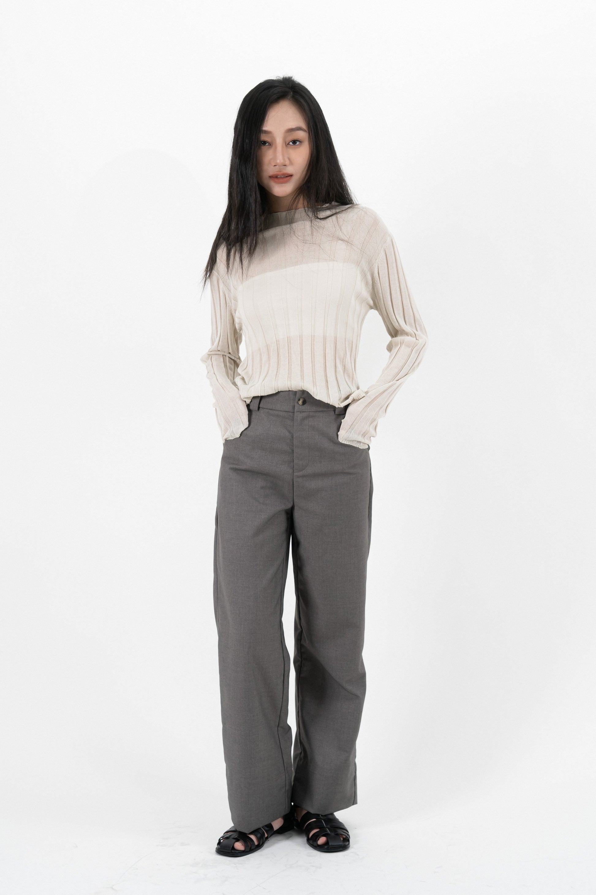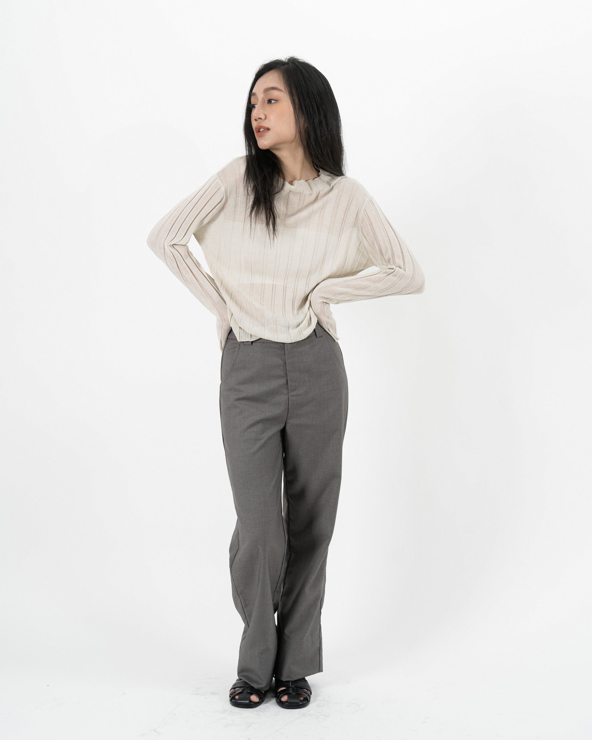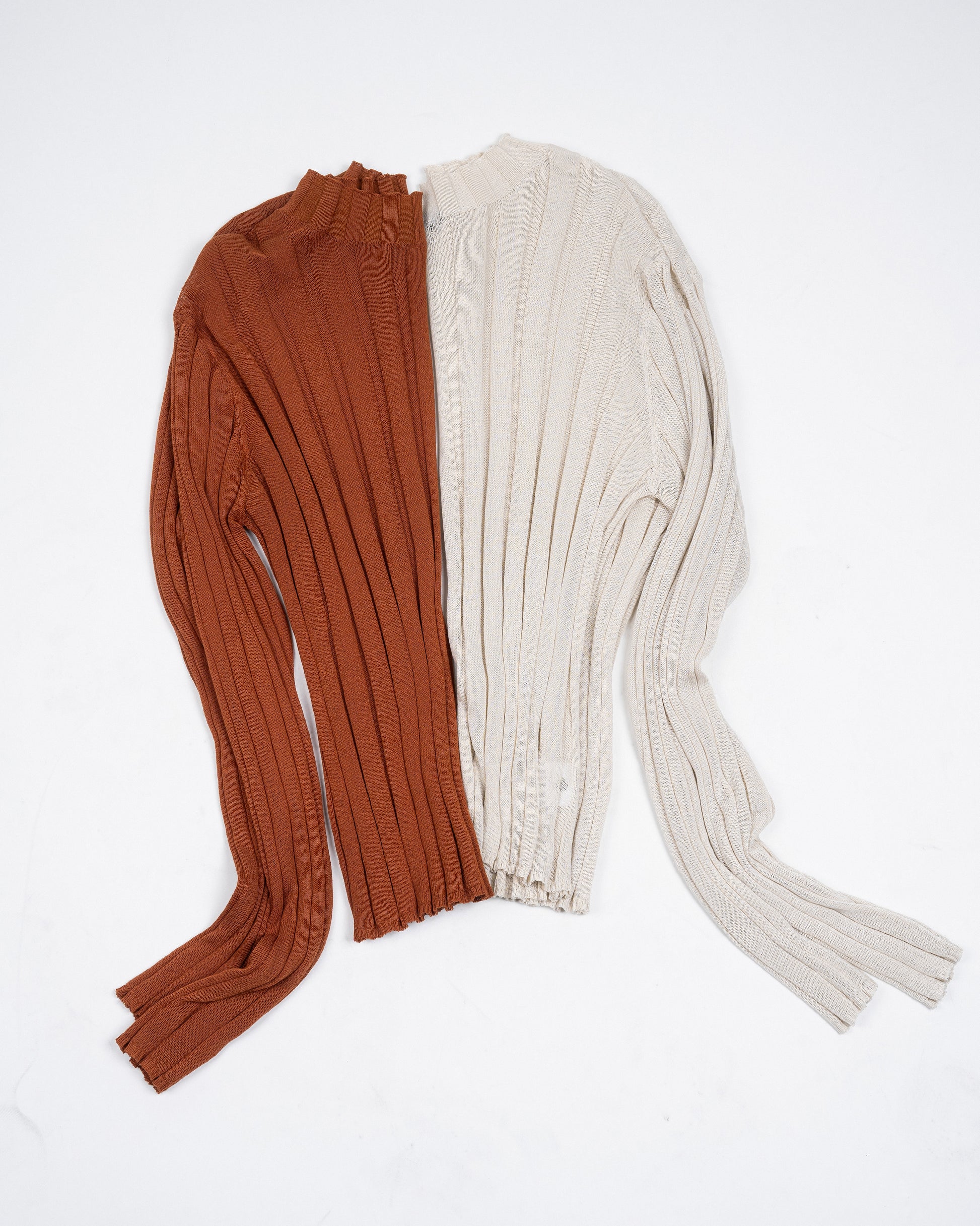 Turtleneck Sheer Ribbed Knit Top (Beige)