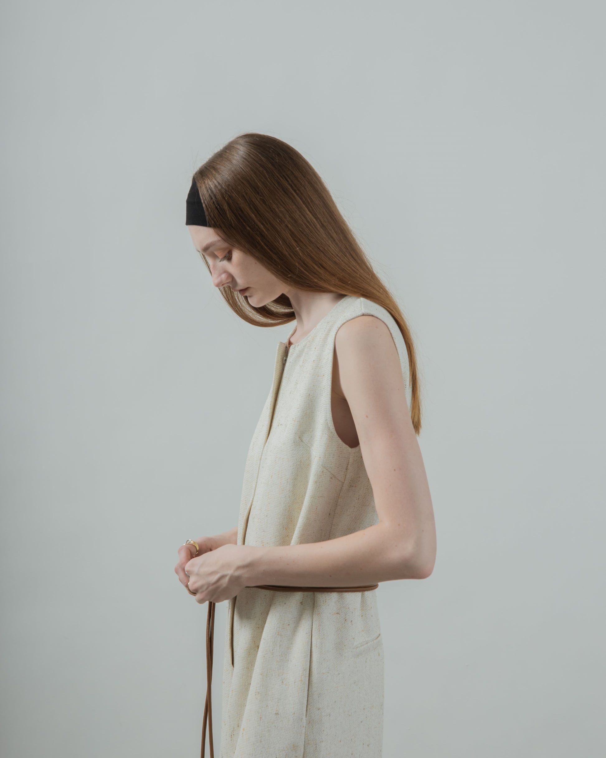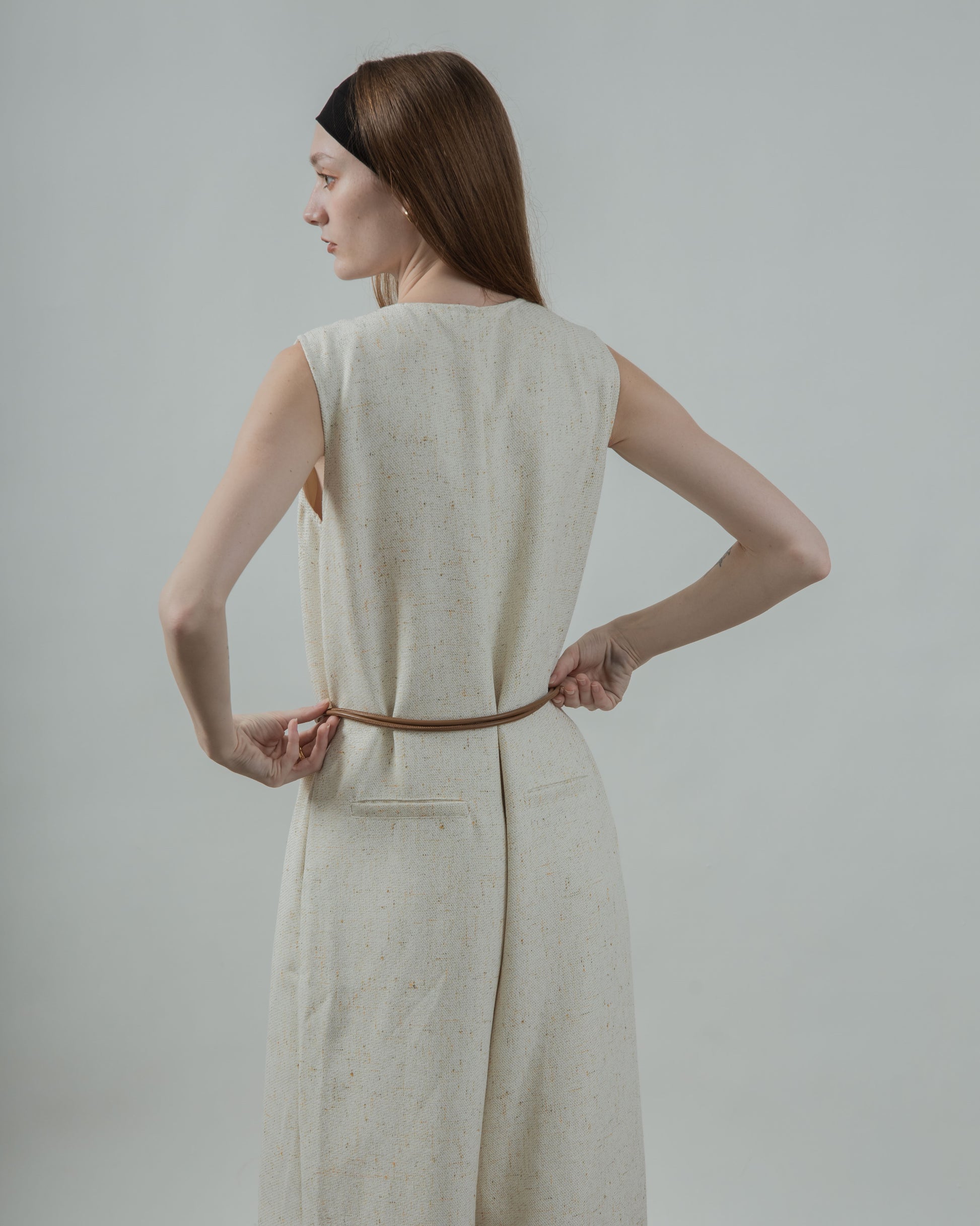 This sleeveless loose jumpsuit in a beige mix combines comfort with modern design. Made from 100% polyester, it has a soft inner lining for added comfort. The front features a silver zipper, making it easy to put on and take off, with a hidden zipper cover for a sleek look. It also includes two side pockets and a matching waist belt to define your shape, offering both style and practicality. A perfect choice for an effortlessly chic outfit.