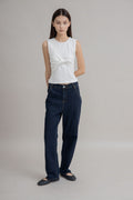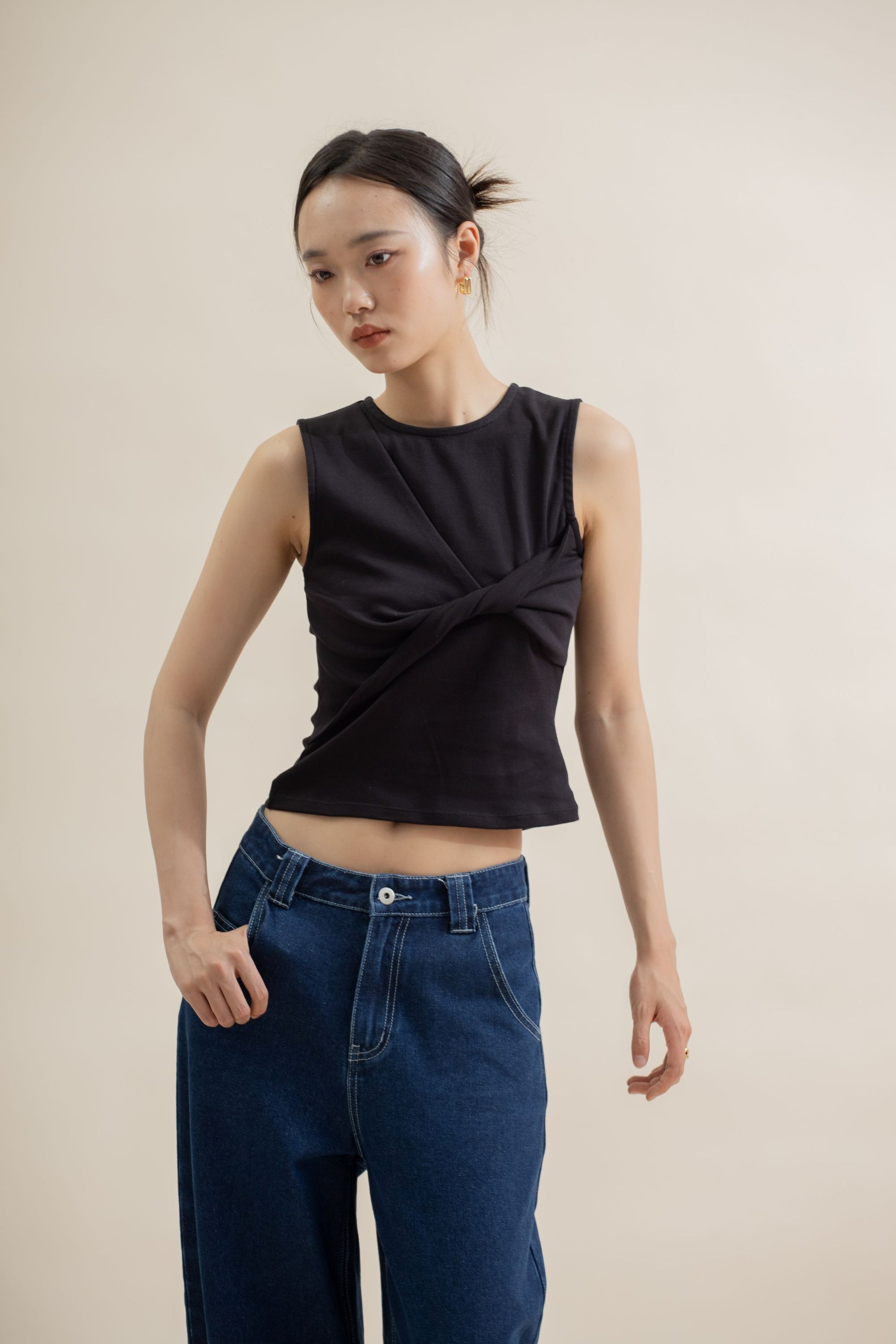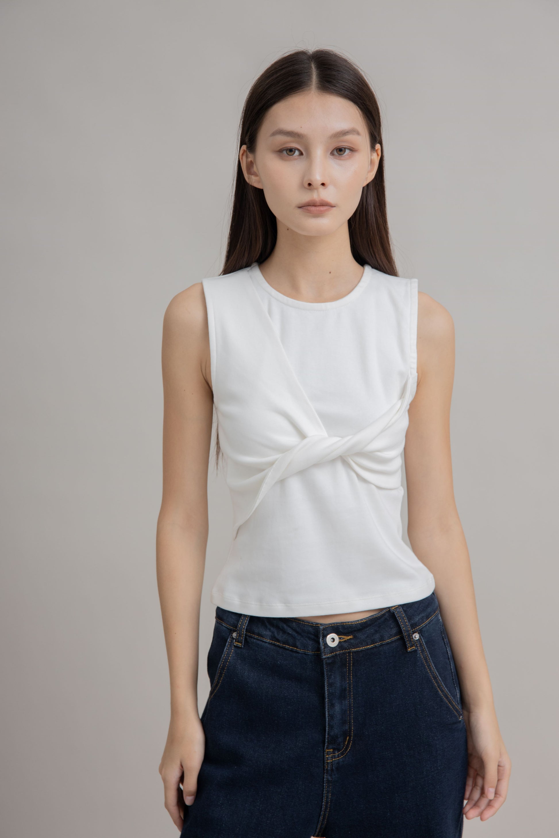 Effortlessly feminine, this Twisted Ribbon Front Sleeveless Top features a delicate ribbon twist detail at the front that adds charm to a simple silhouette. Made from a soft and breathable blend of 96% cotton and 4% spandex, it offers a comfortable stretch and a flattering fit. A versatile piece that pairs easily with skirts, denim, or tailored bottoms for both casual and chic looks.