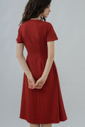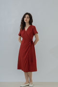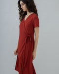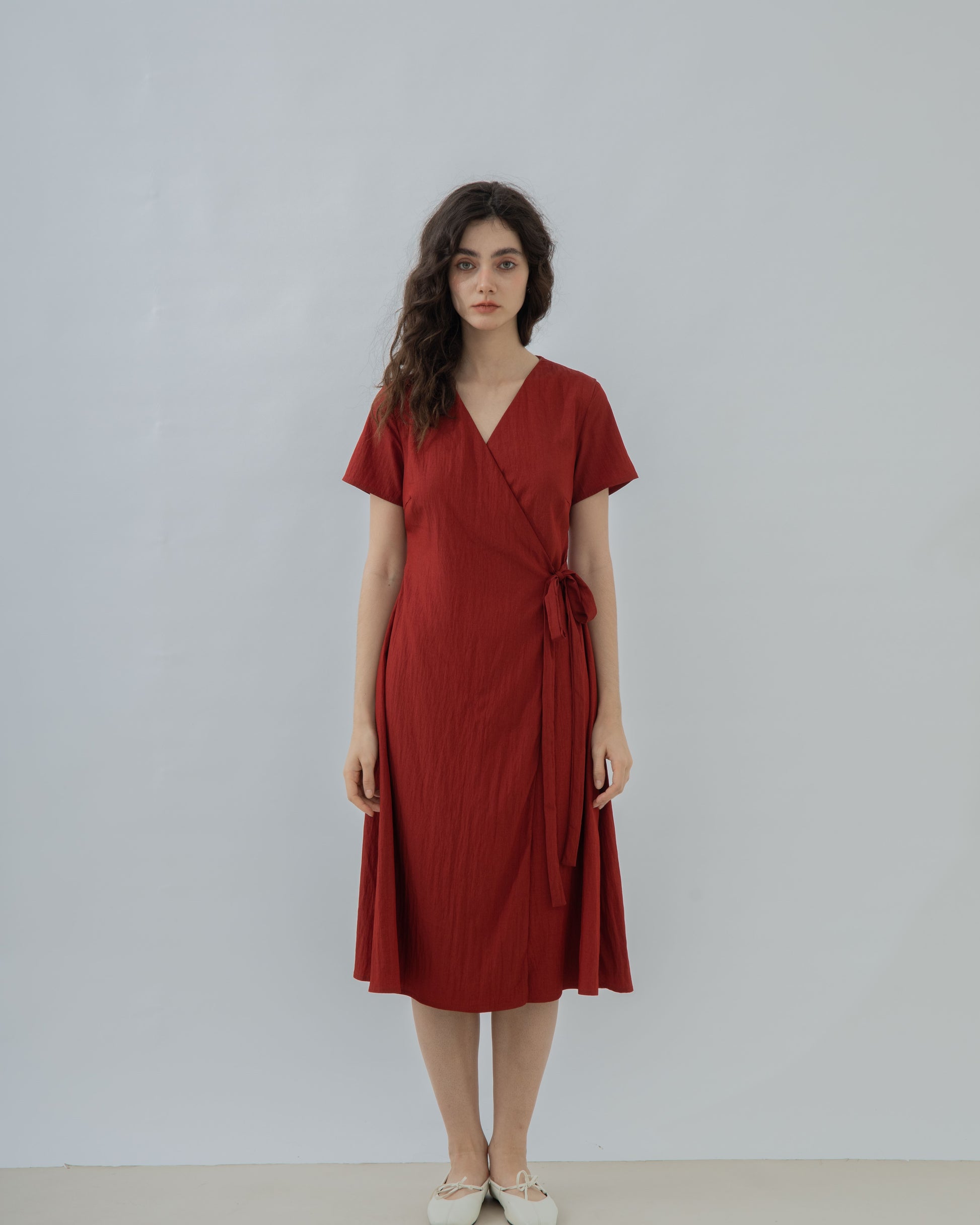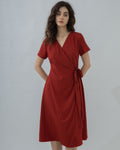 The V Neck Waist Tie Overlap Dress, made from 70% viscose and 30% polyamide, features a graceful wrap-style design with a tie waist and subtle back cinching for a flattering silhouette. The non-stretch fabric and elegant V-neckline make this dress a timeless choice for sophisticated occasions.